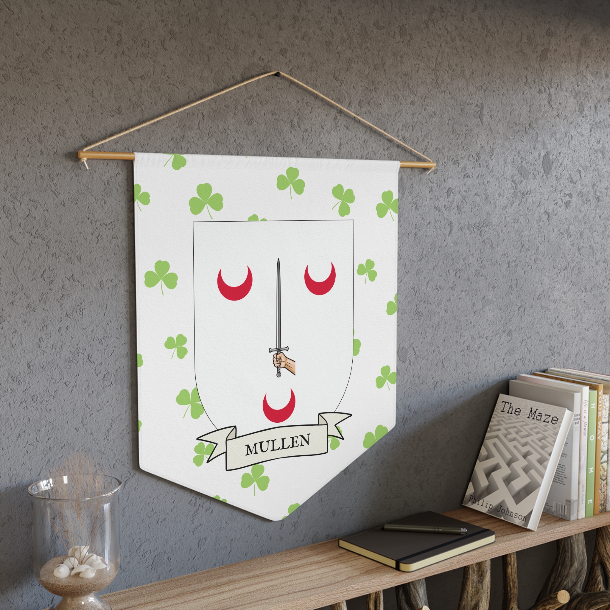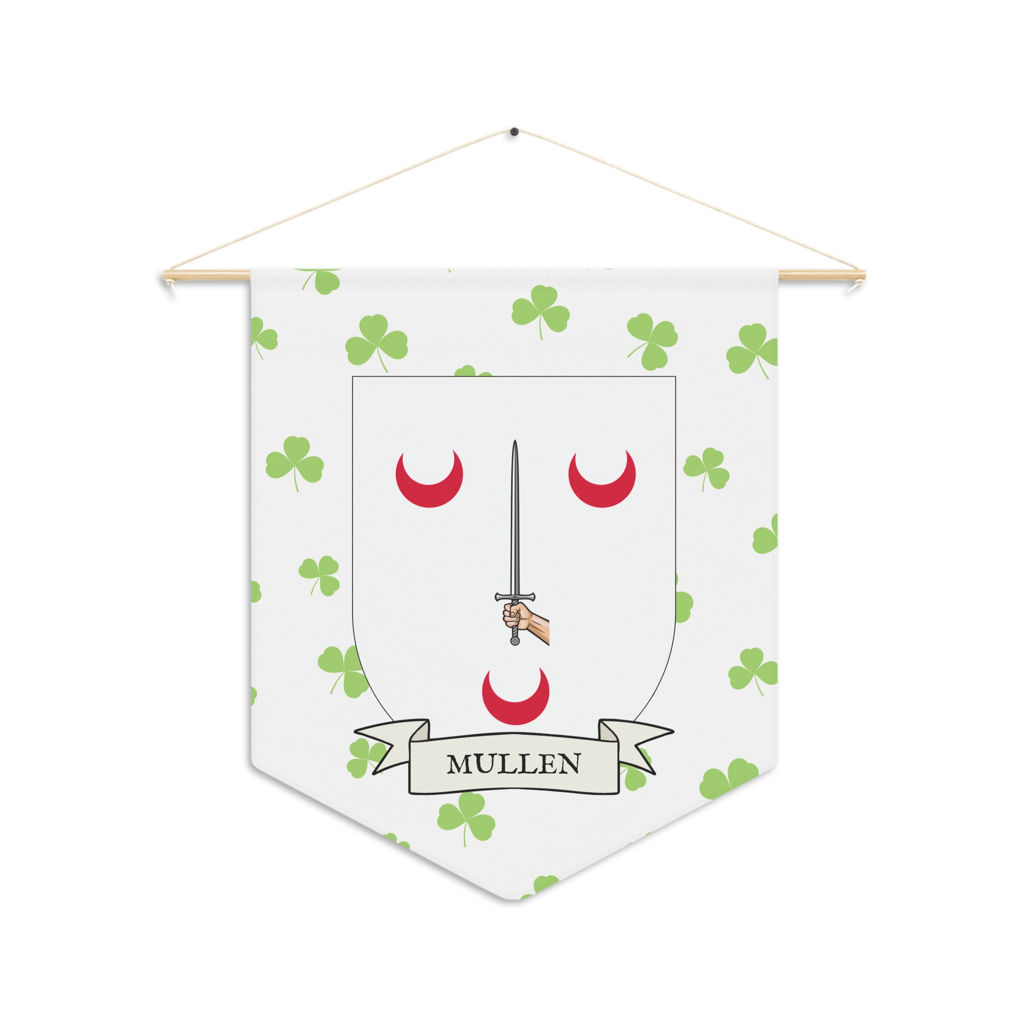Uplift any room and show off your Irish American roots with this Mullen Family Coat of Arms Indoor Pennant. Pennant is printed on durable poly twill and comes with a wooden dowel/twine frame for easy hanging. Features your family Coat of Arms printed over a restrained shamrock patterned background.
