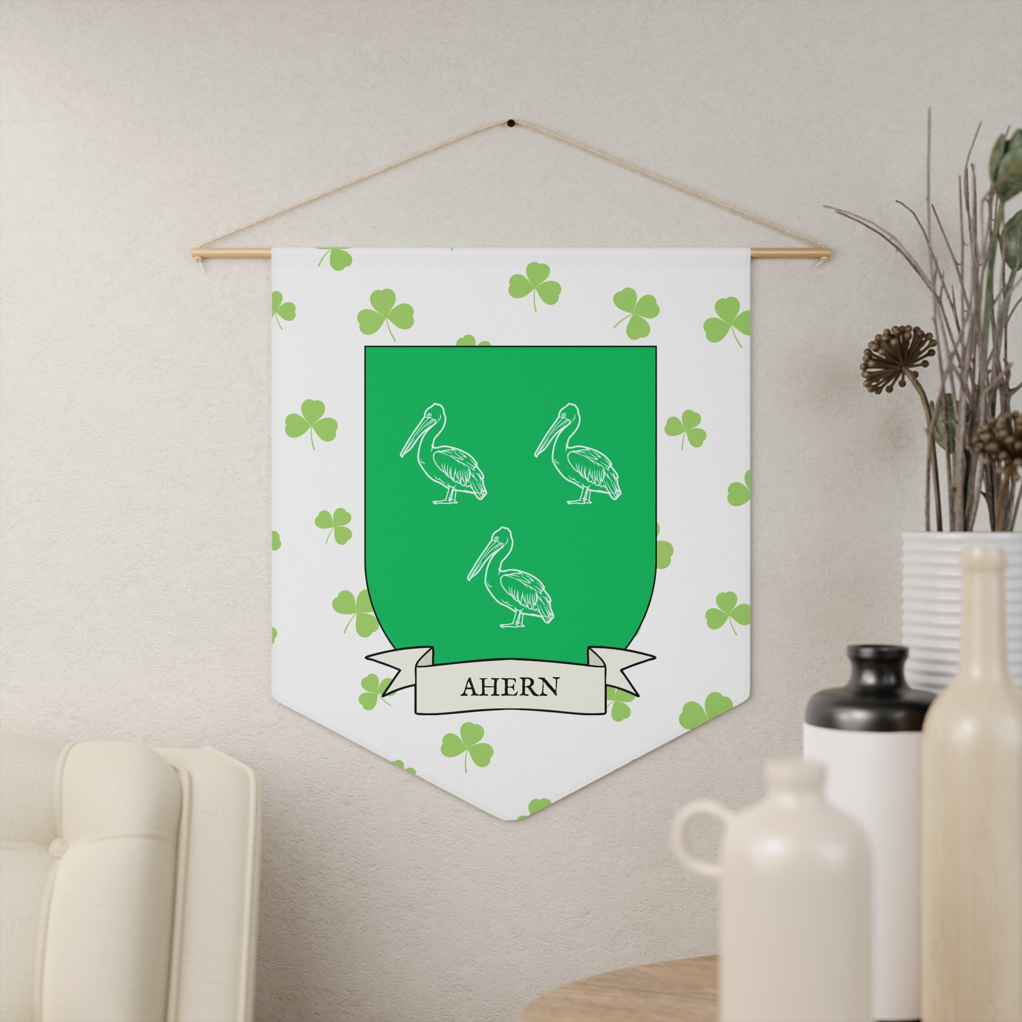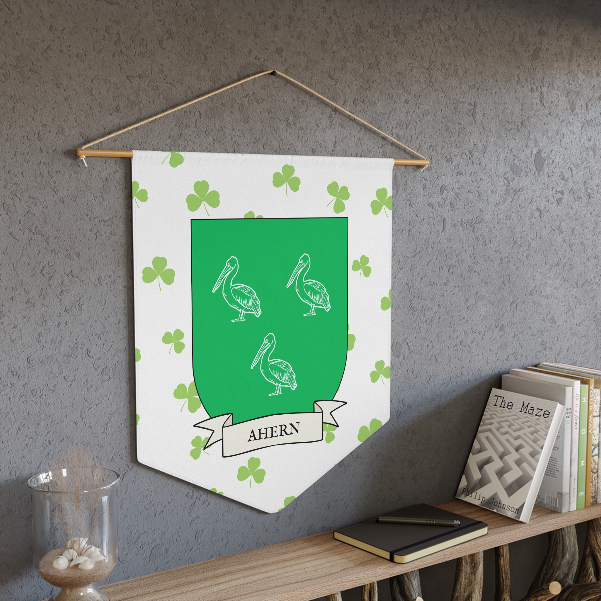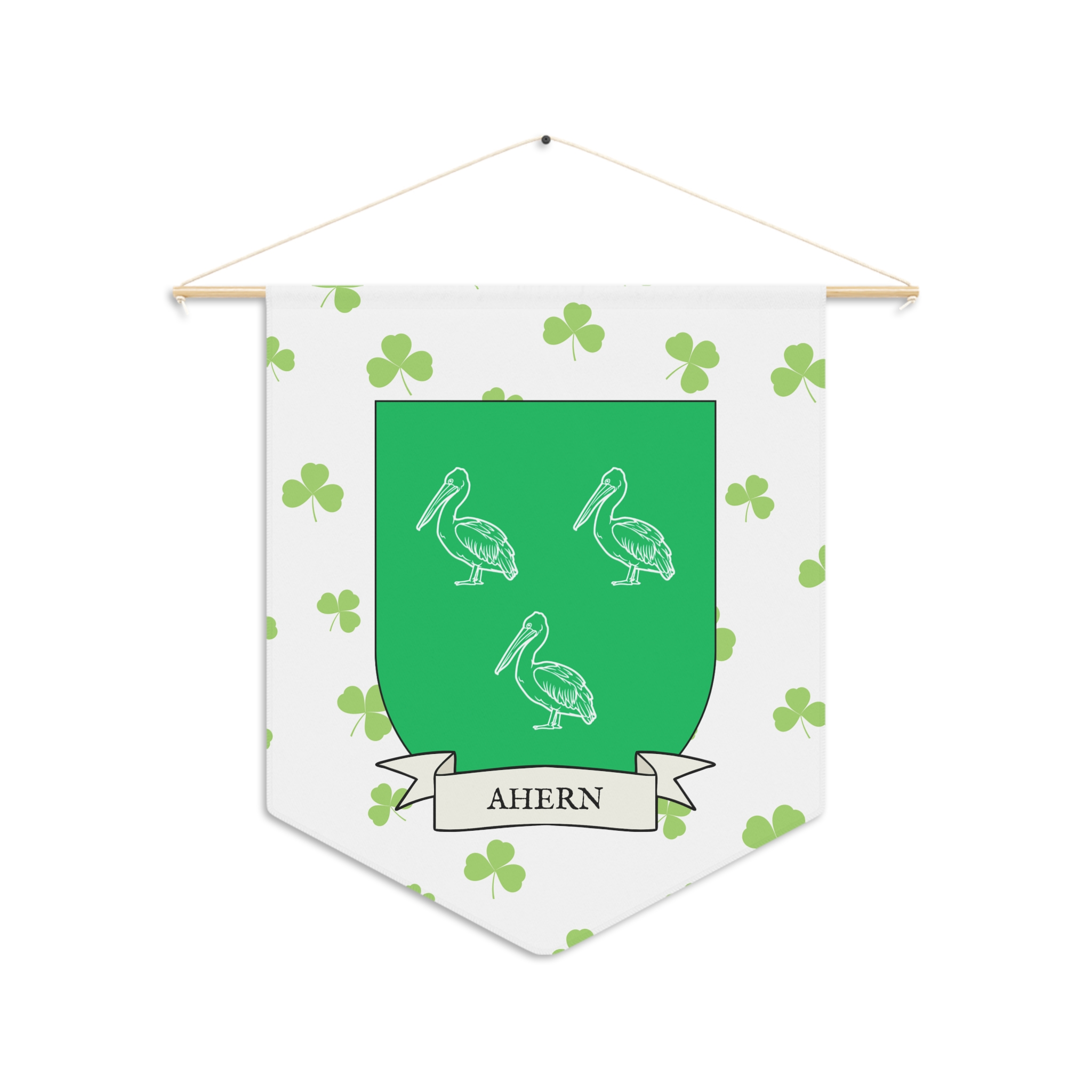 Uplift any room and show off your Irish American roots with this Ahern Family Coat of Arms Indoor Pennant. Pennant is printed on durable poly twill and comes with a wooden dowel/twine frame for easy hanging. Features your family Coat of Arms printed over a restrained shamrock patterned background.