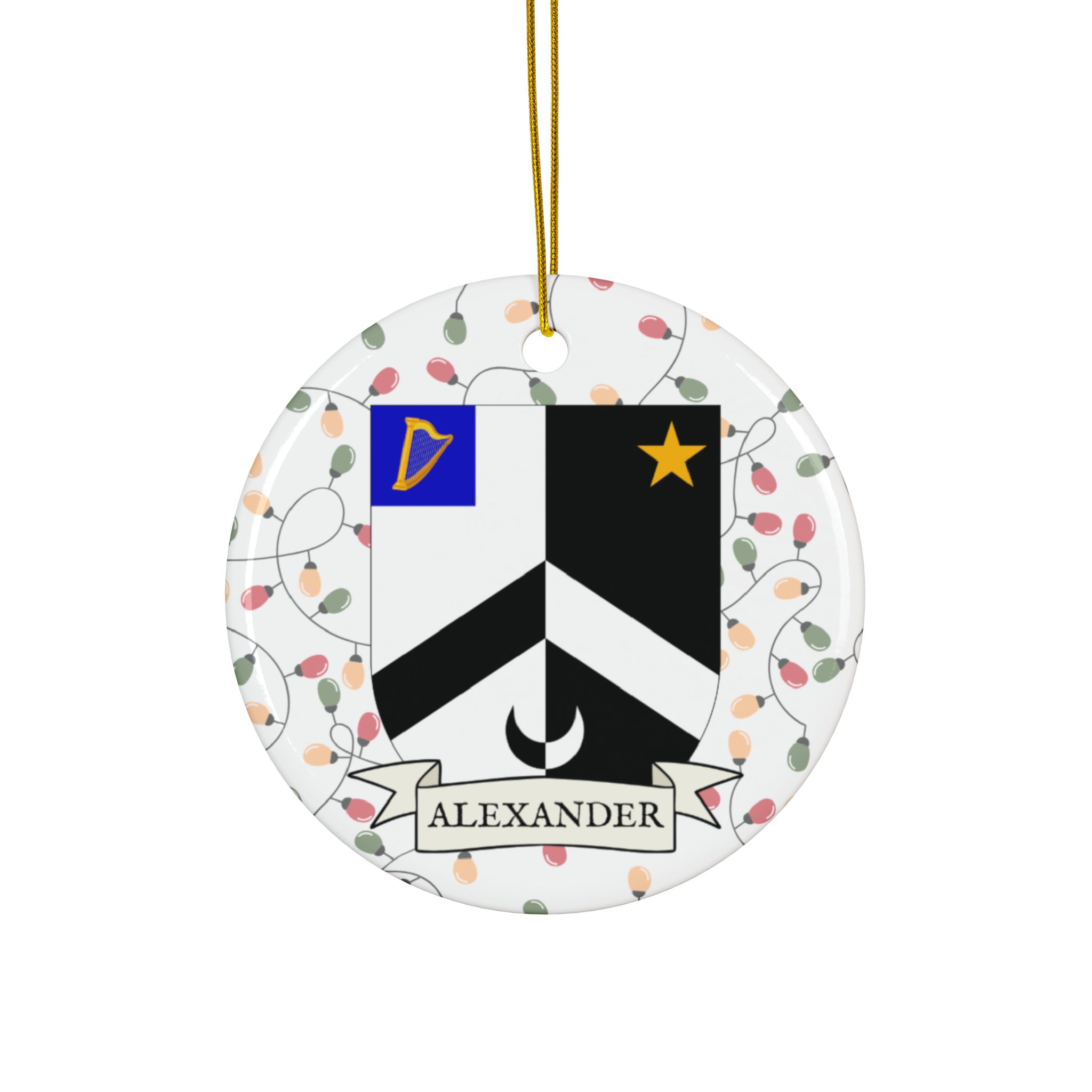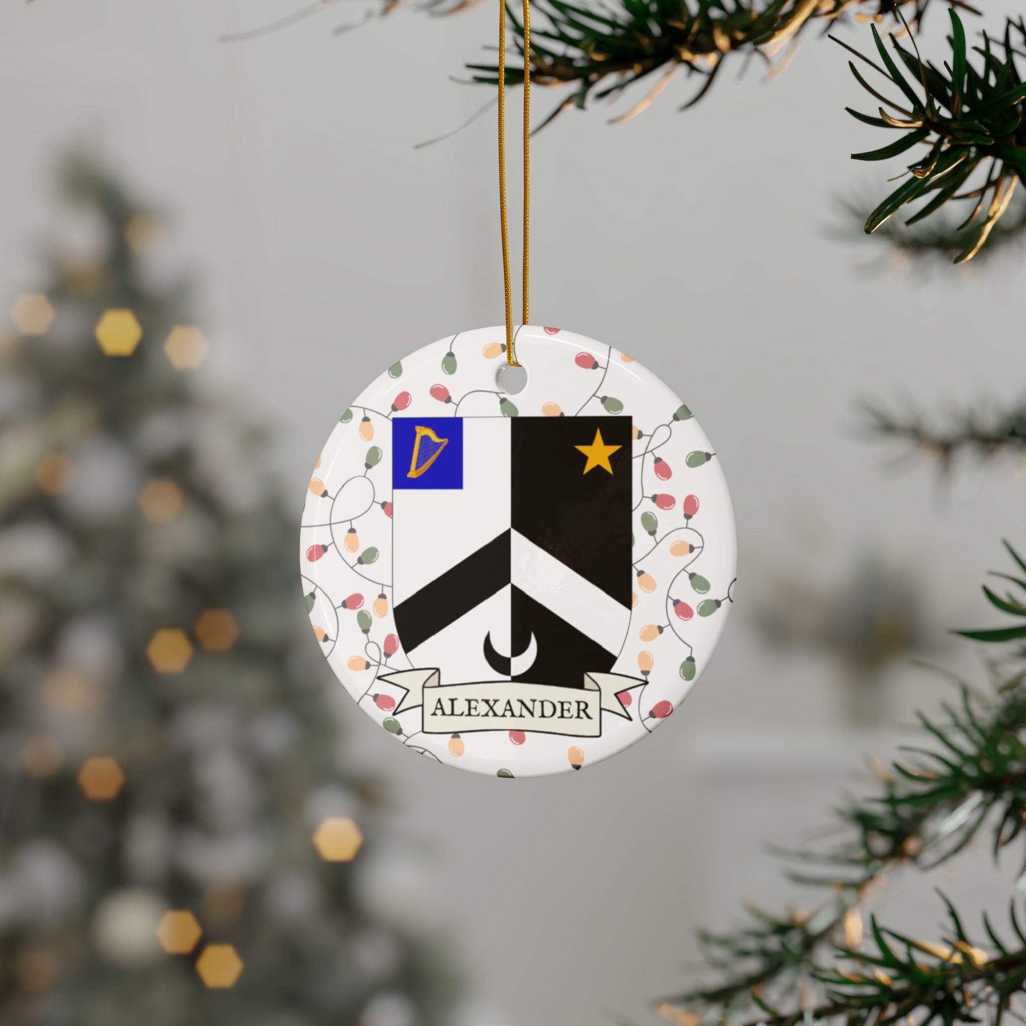 Celebrate the Holidays (and your Irish Heritage) with Irish Family Coat of Arms Christmas Tree Ornaments! Your family’s coat of arms printed on a 100% ceramic ornament with a festive Christmas Tree lights background. Great gift idea for the Irish Americans in your life. It’s sure to become a Christmas tradition!