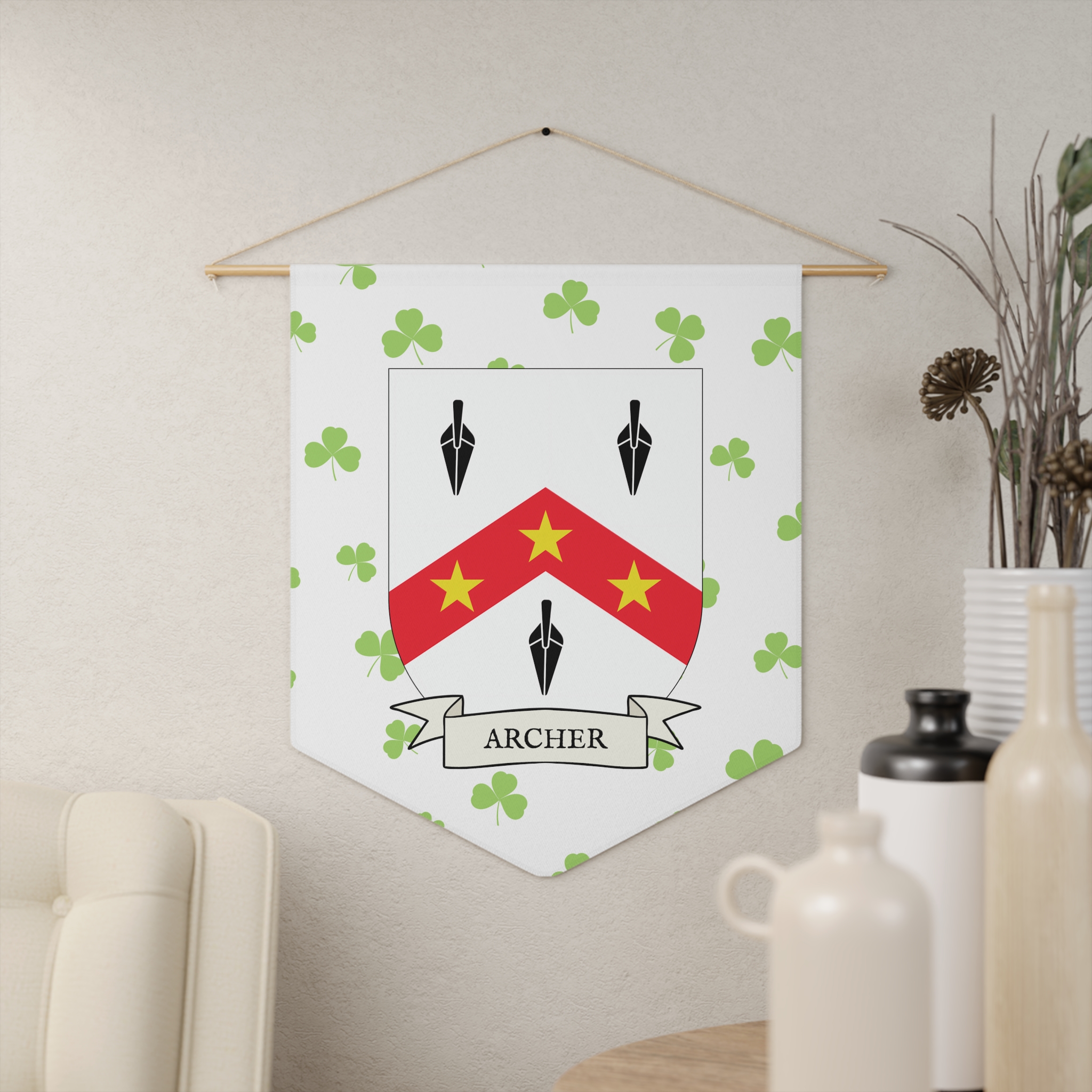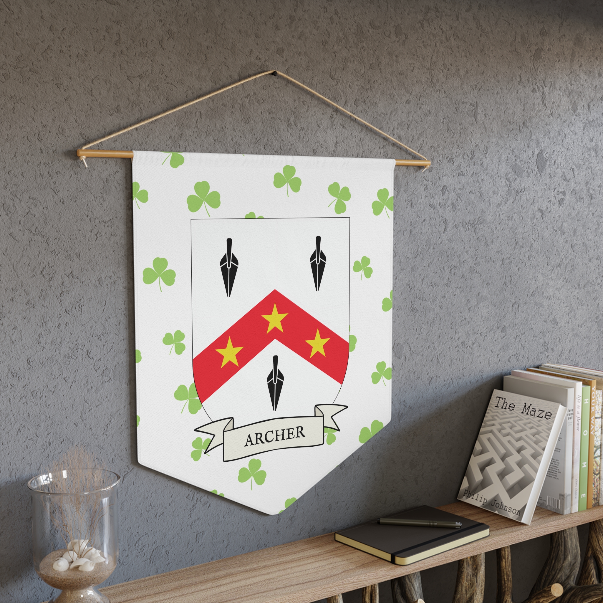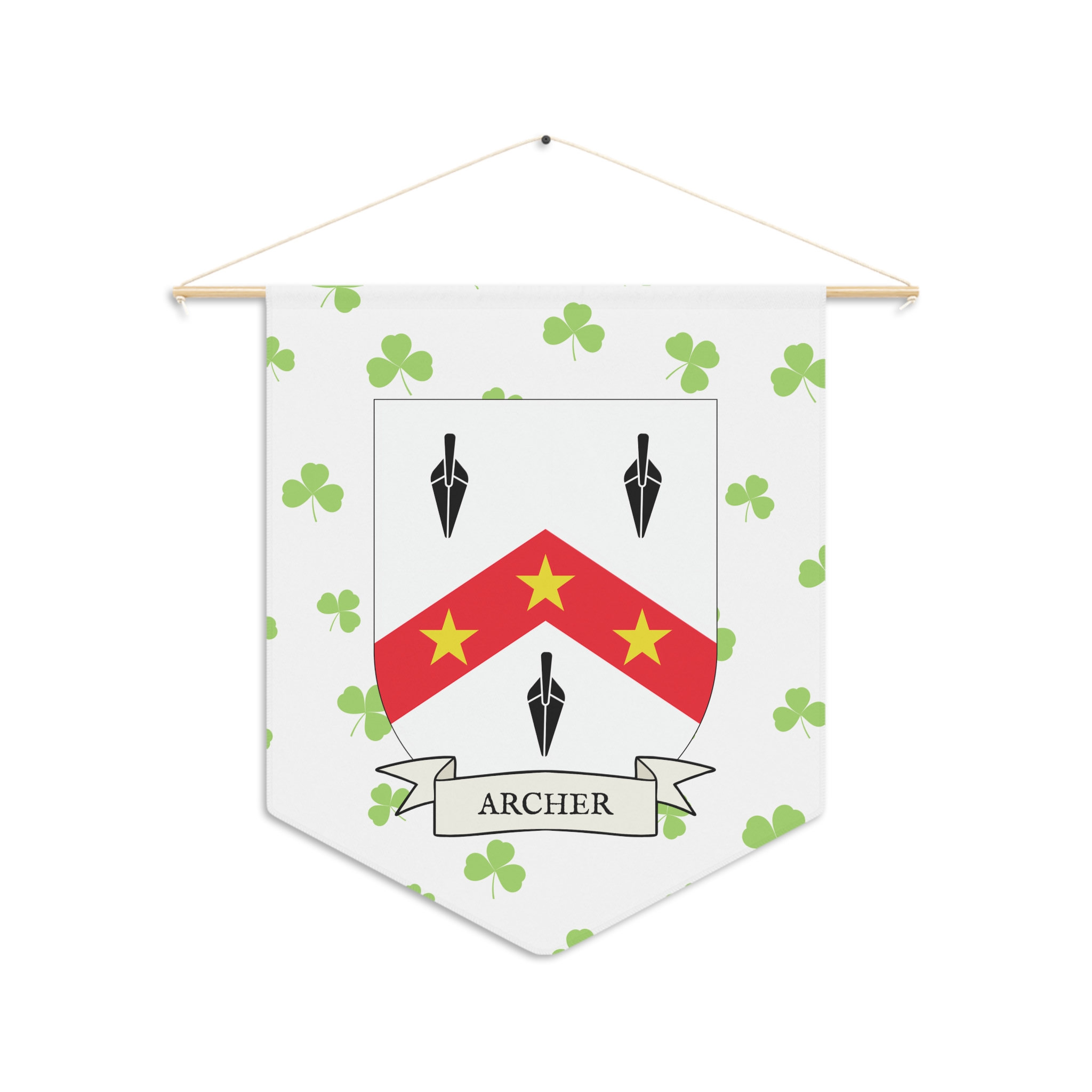Uplift any room and show off your Irish American roots with this Archer Family Coat of Arms Indoor Pennant. Pennant is printed on durable poly twill and comes with a wooden dowel/twine frame for easy hanging. Features your family Coat of Arms printed over a restrained shamrock patterned background.
