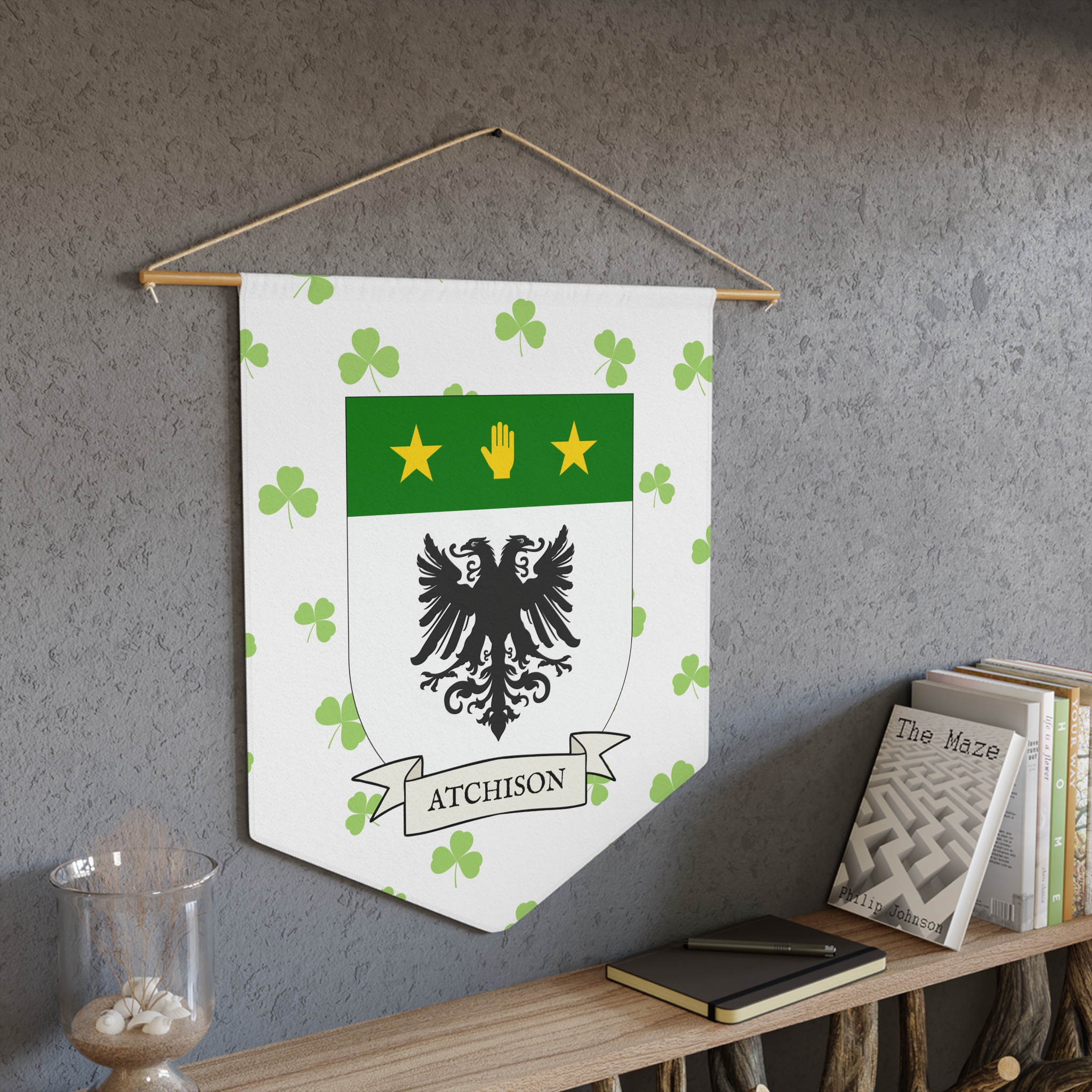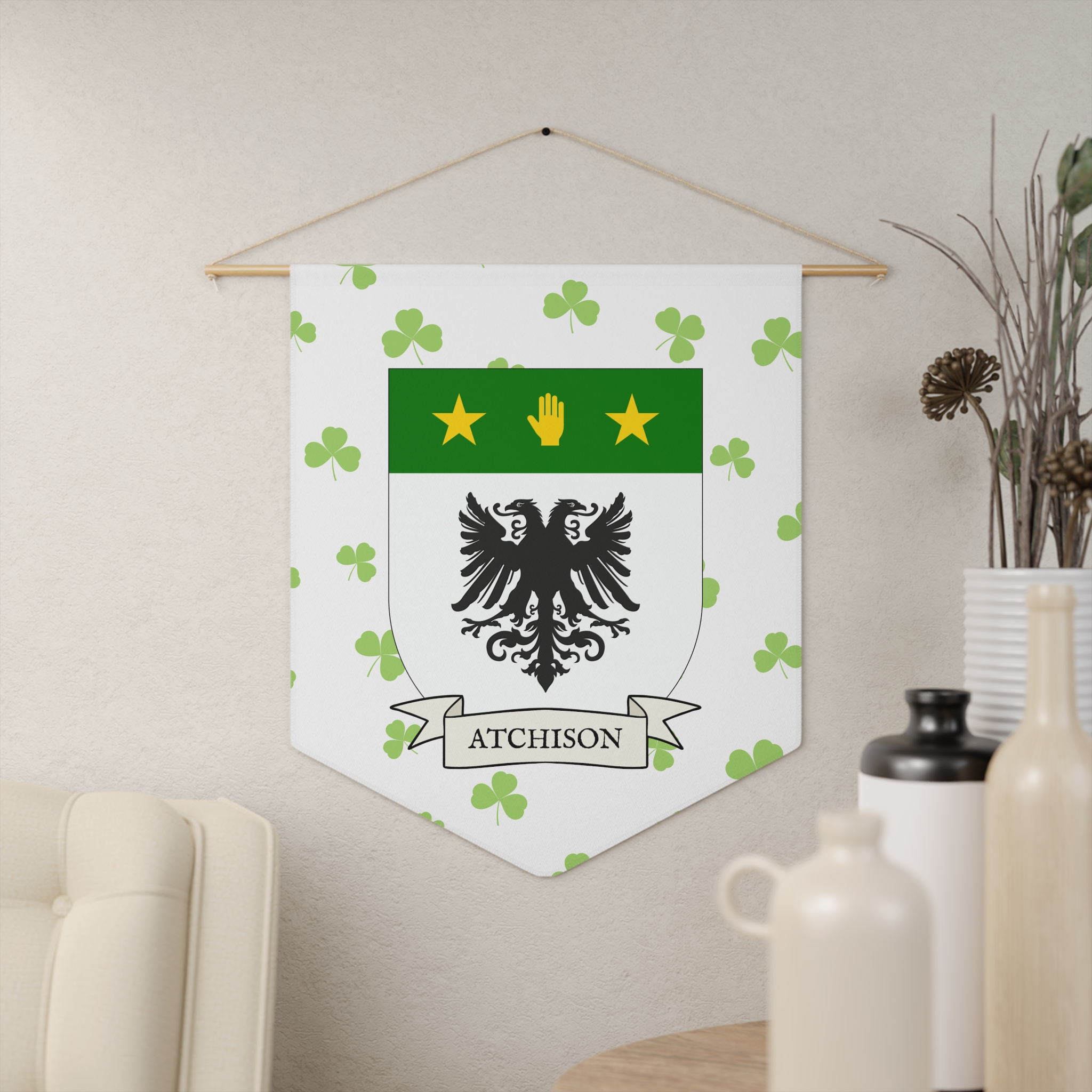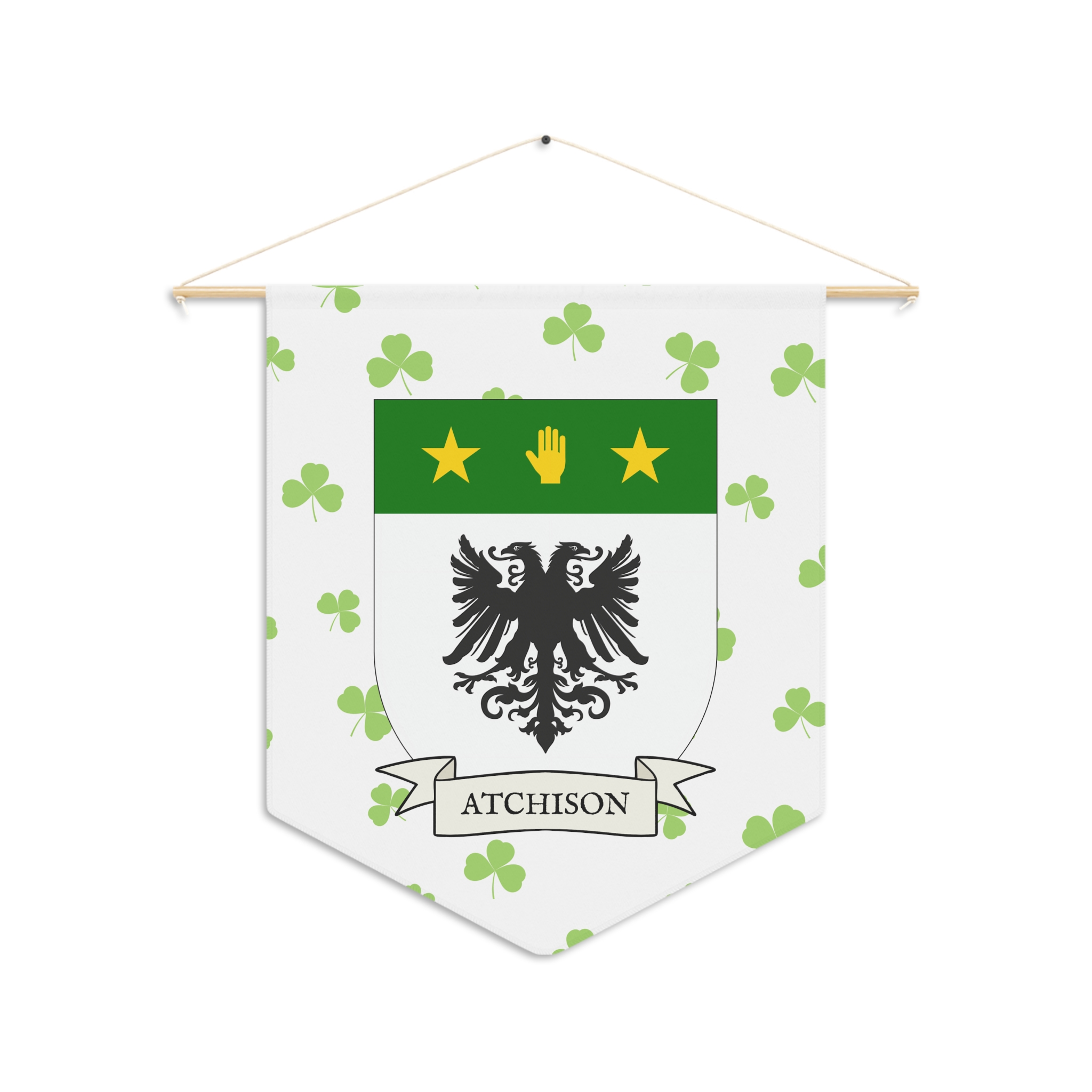 Uplift any room and show off your Irish American roots with this Atchison Family Coat of Arms Indoor Pennant. Pennant is printed on durable poly twill and comes with a wooden dowel/twine frame for easy hanging. Features your family Coat of Arms printed over a restrained shamrock patterned background.