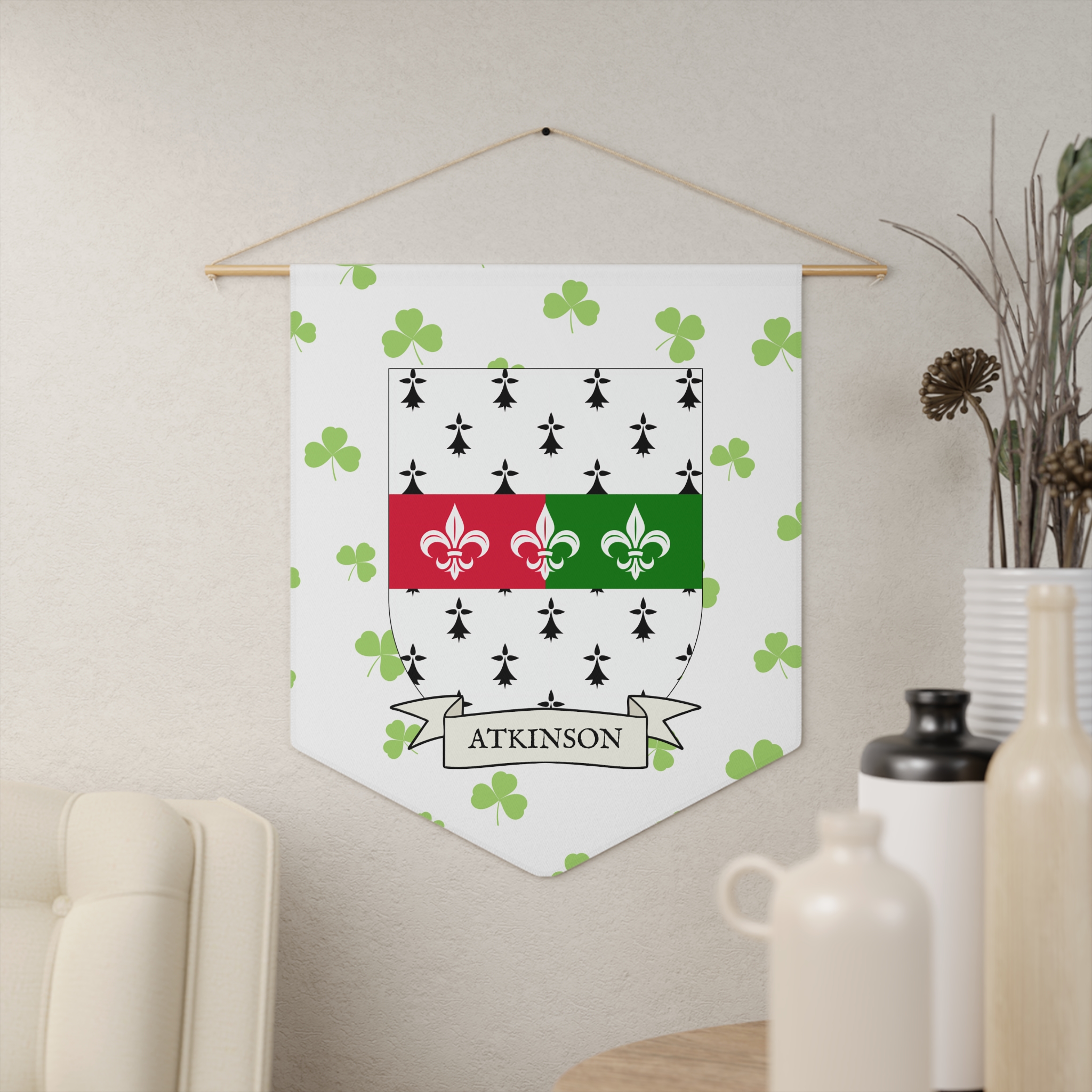Uplift any room and show off your Irish American roots with this Atkinson Family Coat of Arms Indoor Pennant. Pennant is printed on durable poly twill and comes with a wooden dowel/twine frame for easy hanging. Features your family Coat of Arms printed over a restrained shamrock patterned background.