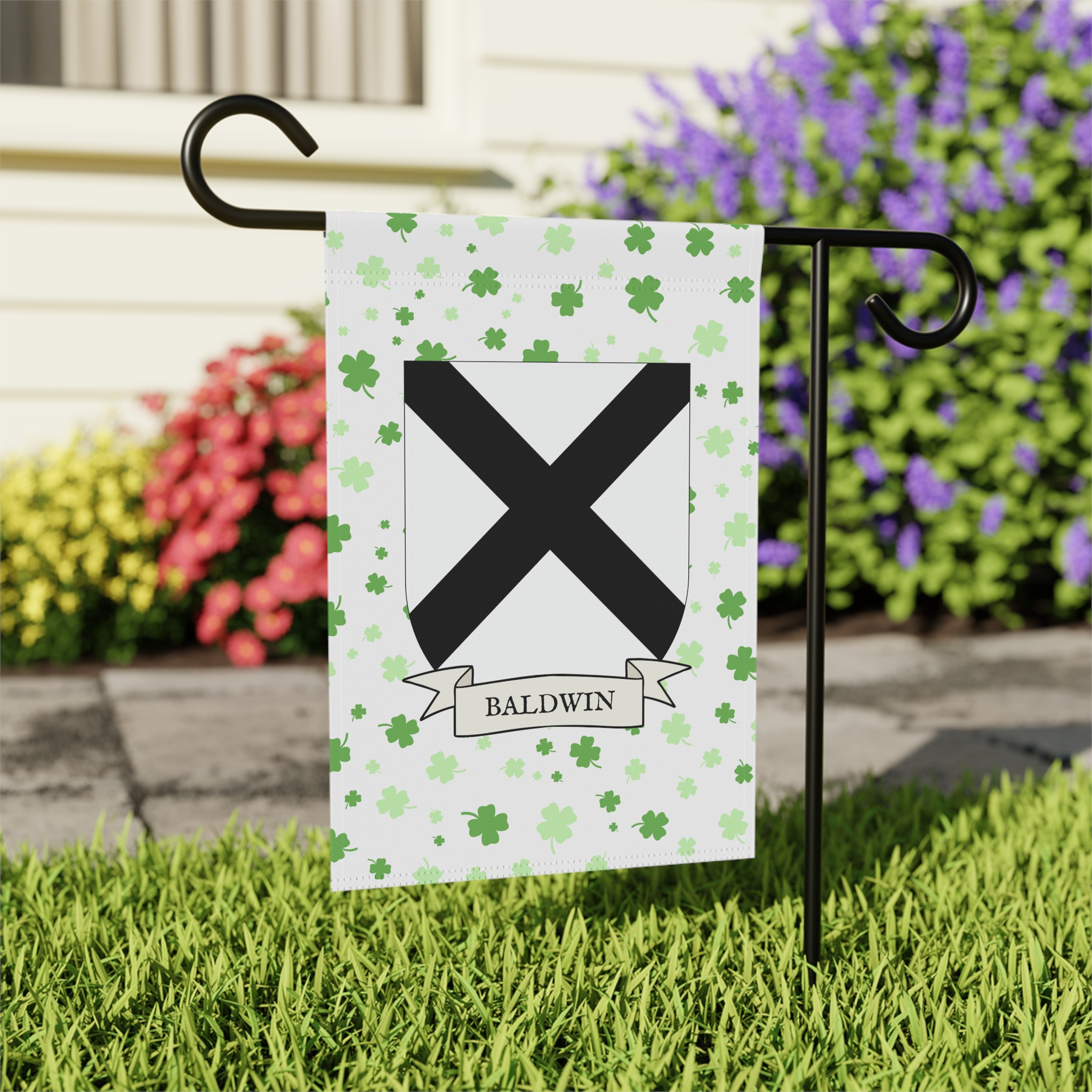 This welcoming Garden Banner will be a great addition to your garden or yard. It displays the Baldwin Family Coat of Arms over a subtle background showing a field of four-leaf shamrocks. Both sides show identical images.