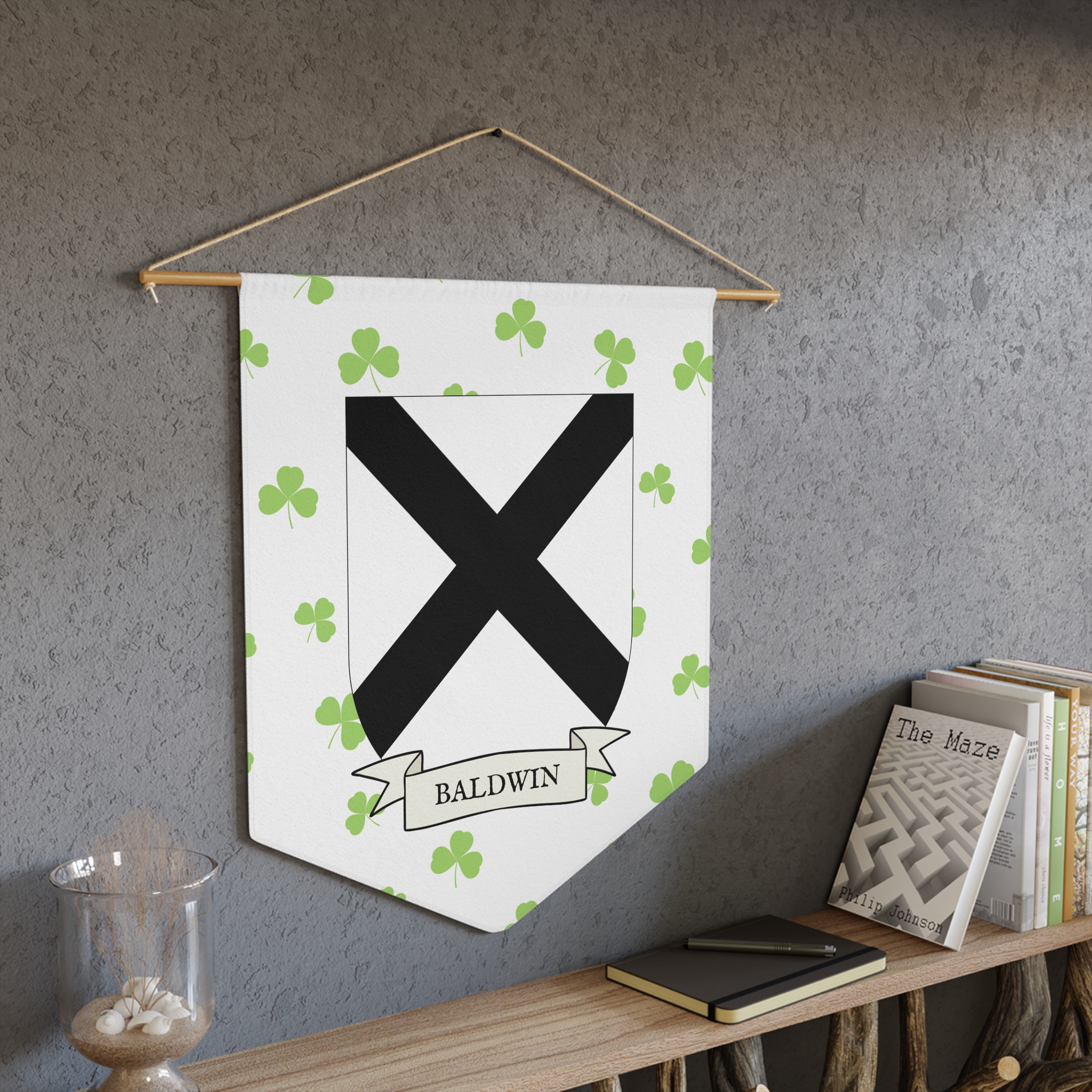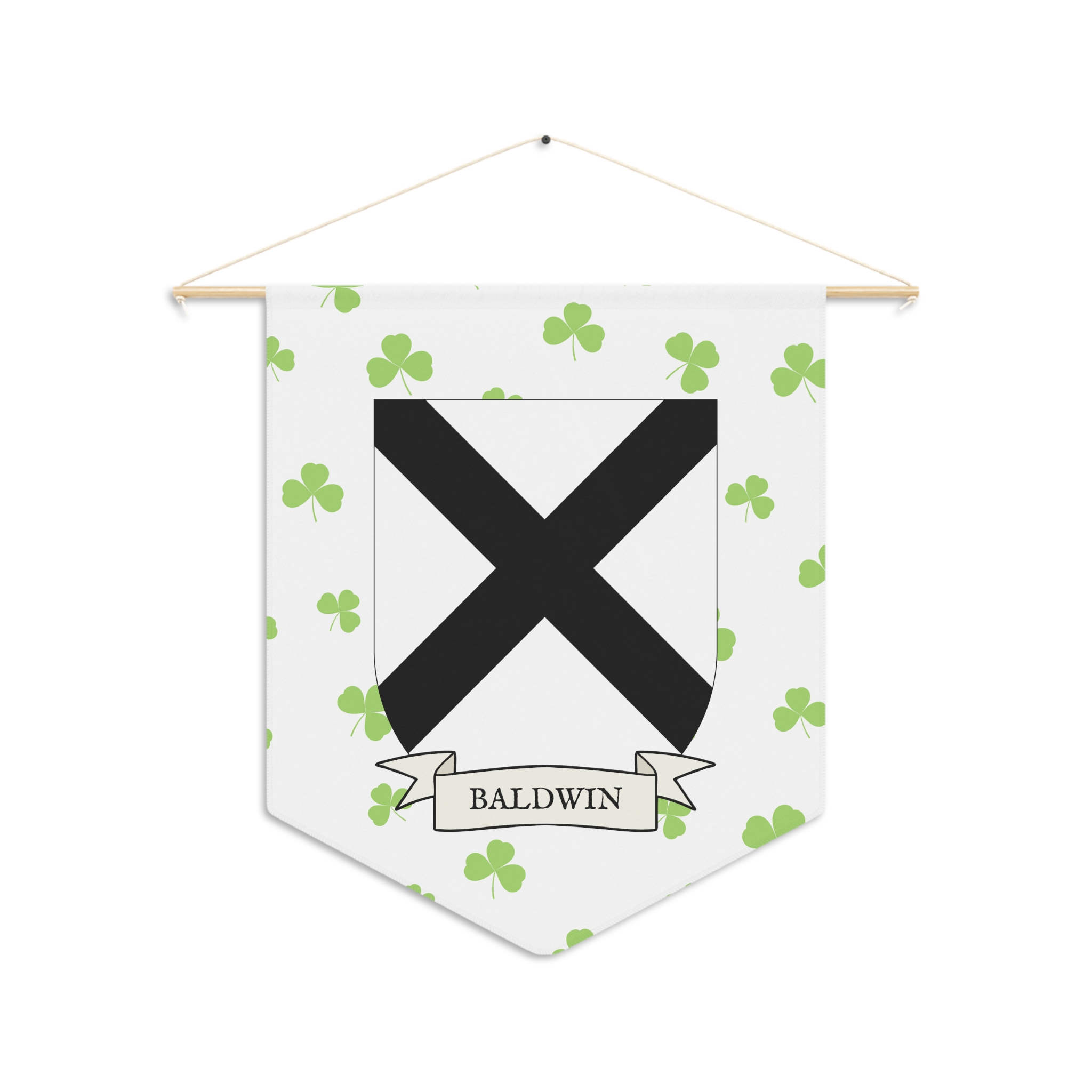 Uplift any room and show off your Irish American roots with this Baldwin Family Coat of Arms Indoor Pennant. Pennant is printed on durable poly twill and comes with a wooden dowel/twine frame for easy hanging. Features your family Coat of Arms printed over a restrained shamrock patterned background.