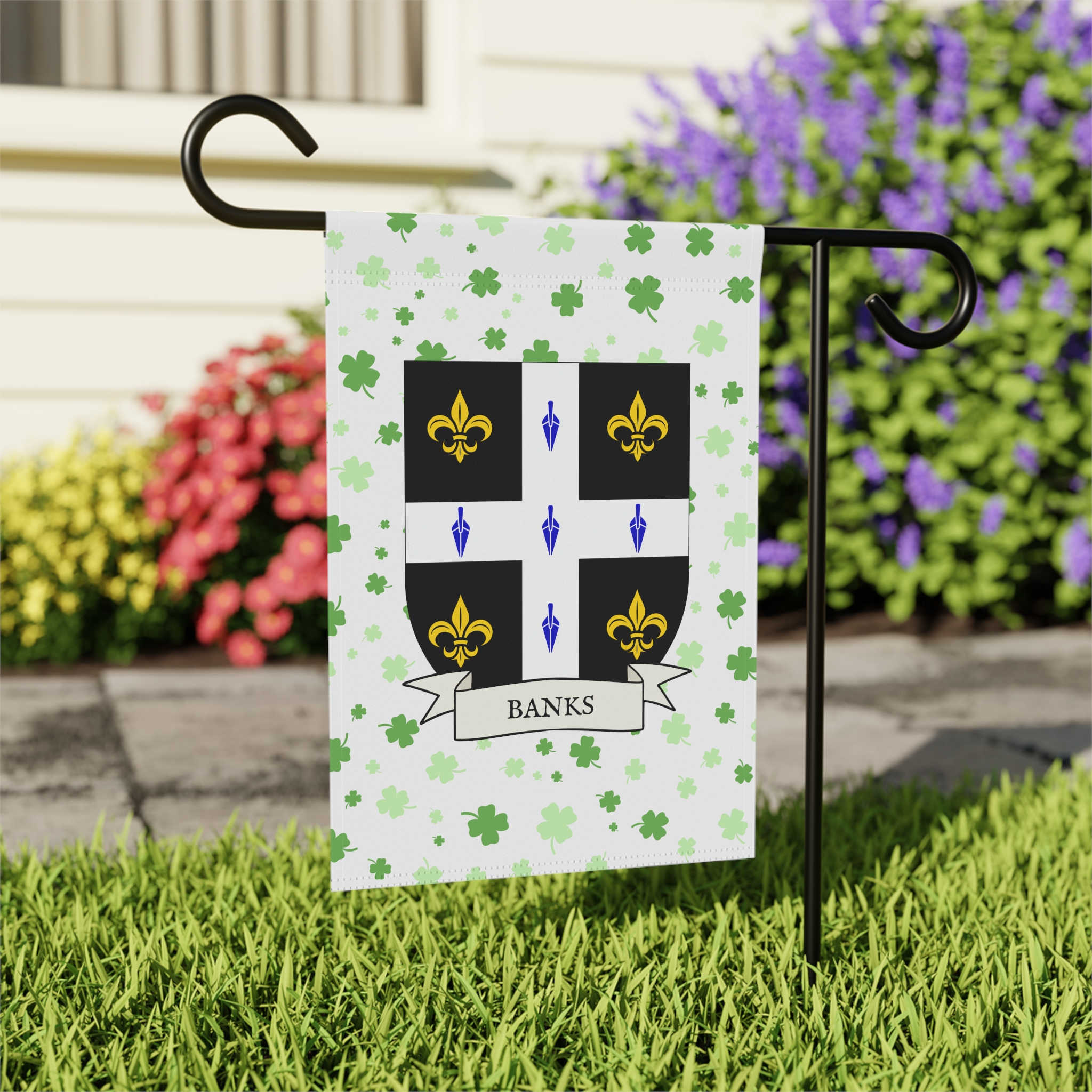 This welcoming Garden Banner will be a great addition to your garden or yard. It displays the Banks family Coat of Arms over a subtle background showing a field of four-leaf shamrocks. Both sides show identical images.