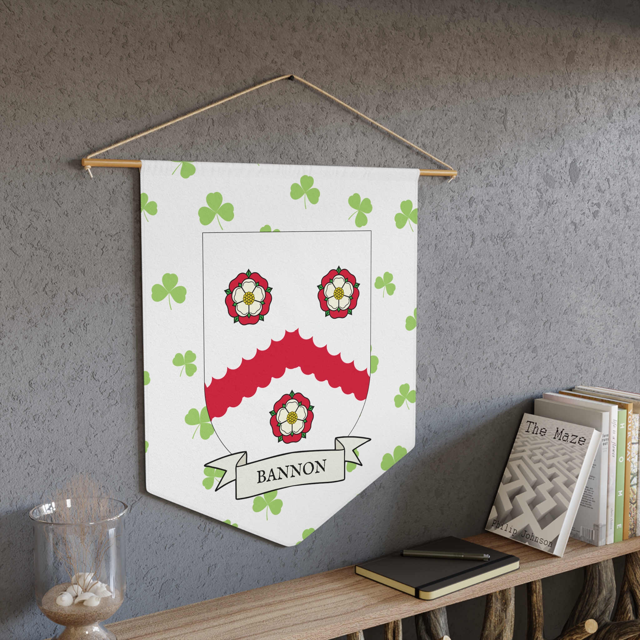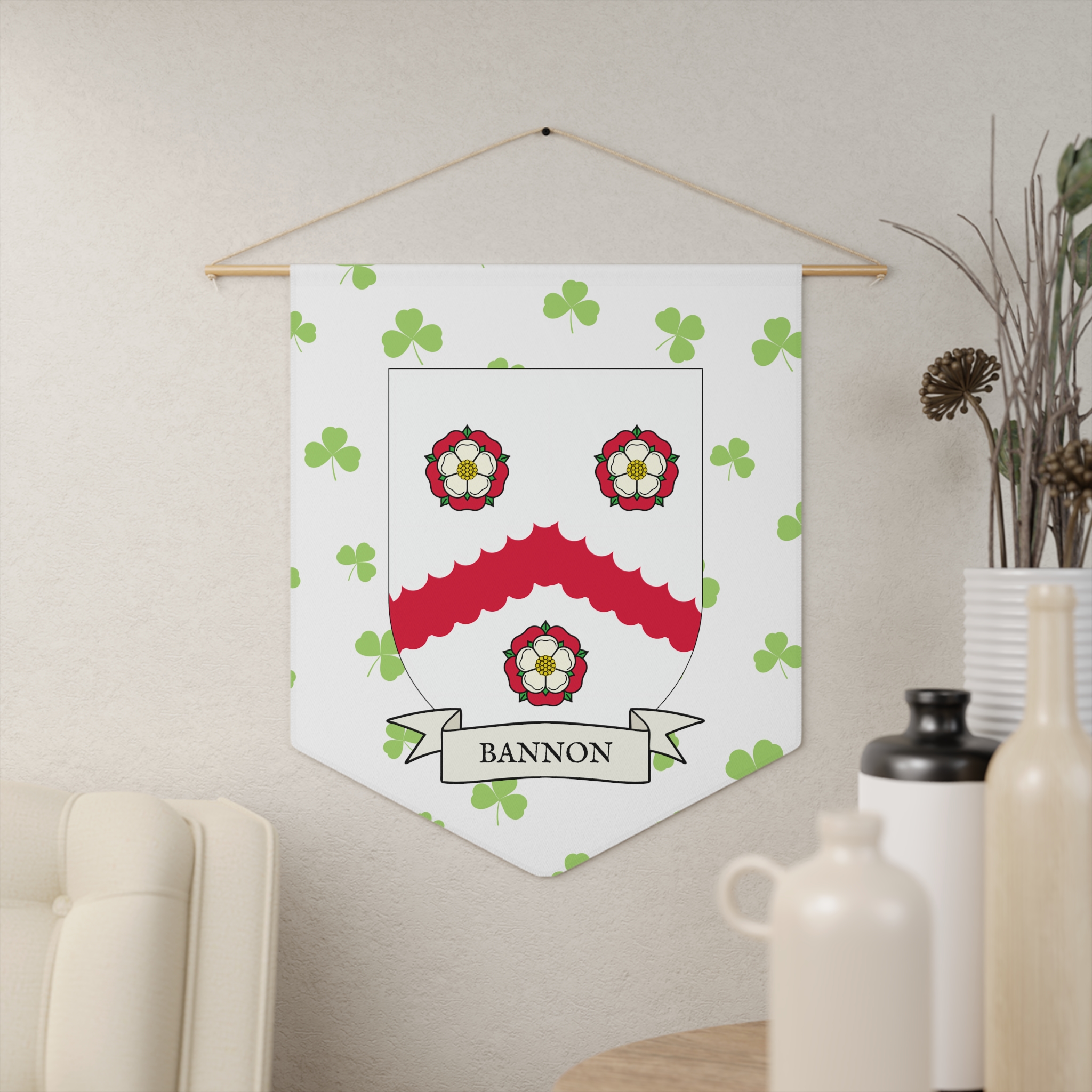 Uplift any room and show off your Irish American roots with this Bannon Family Coat of Arms Indoor Pennant. Pennant is printed on durable poly twill and comes with a wooden dowel/twine frame for easy hanging. Features your family Coat of Arms printed over a restrained shamrock patterned background.