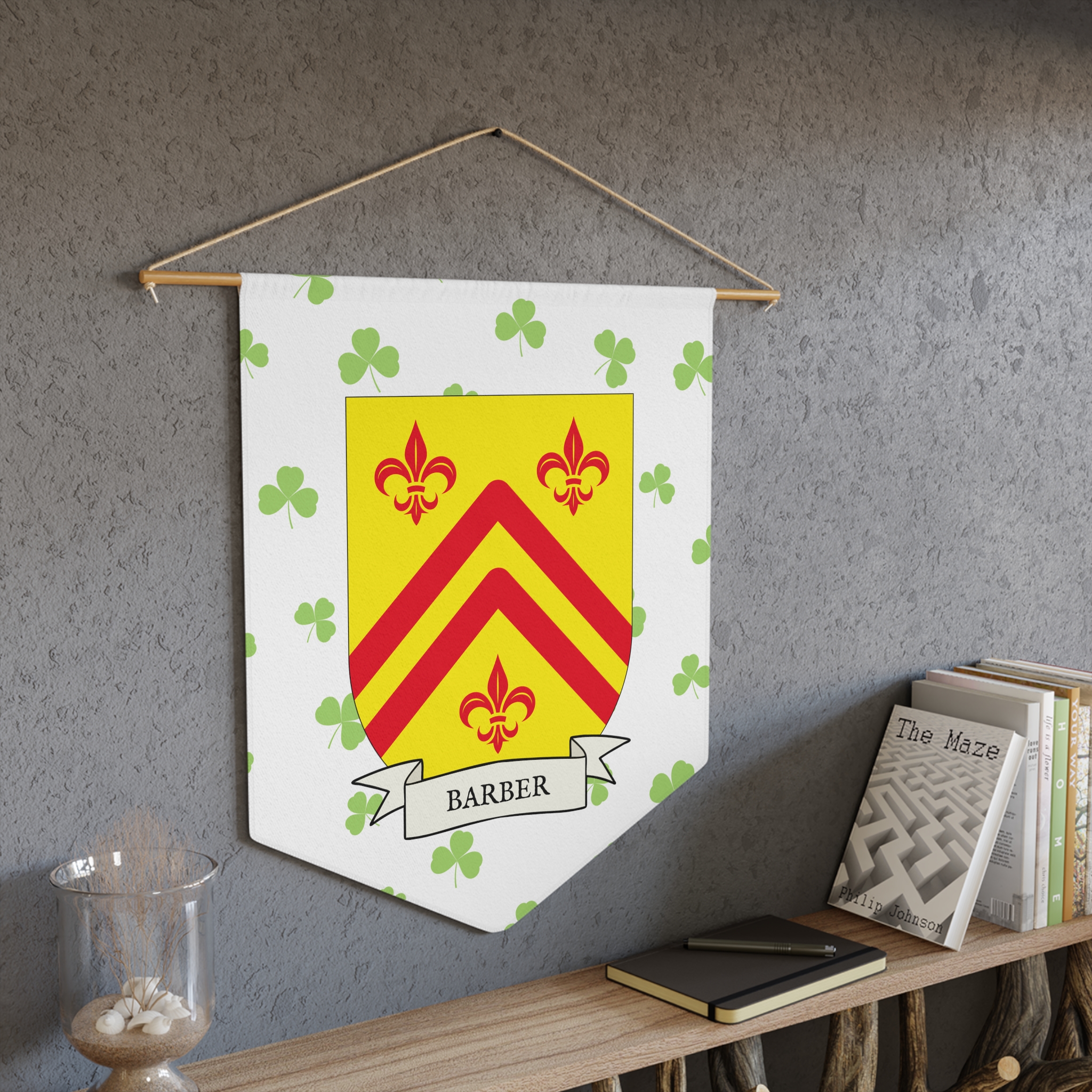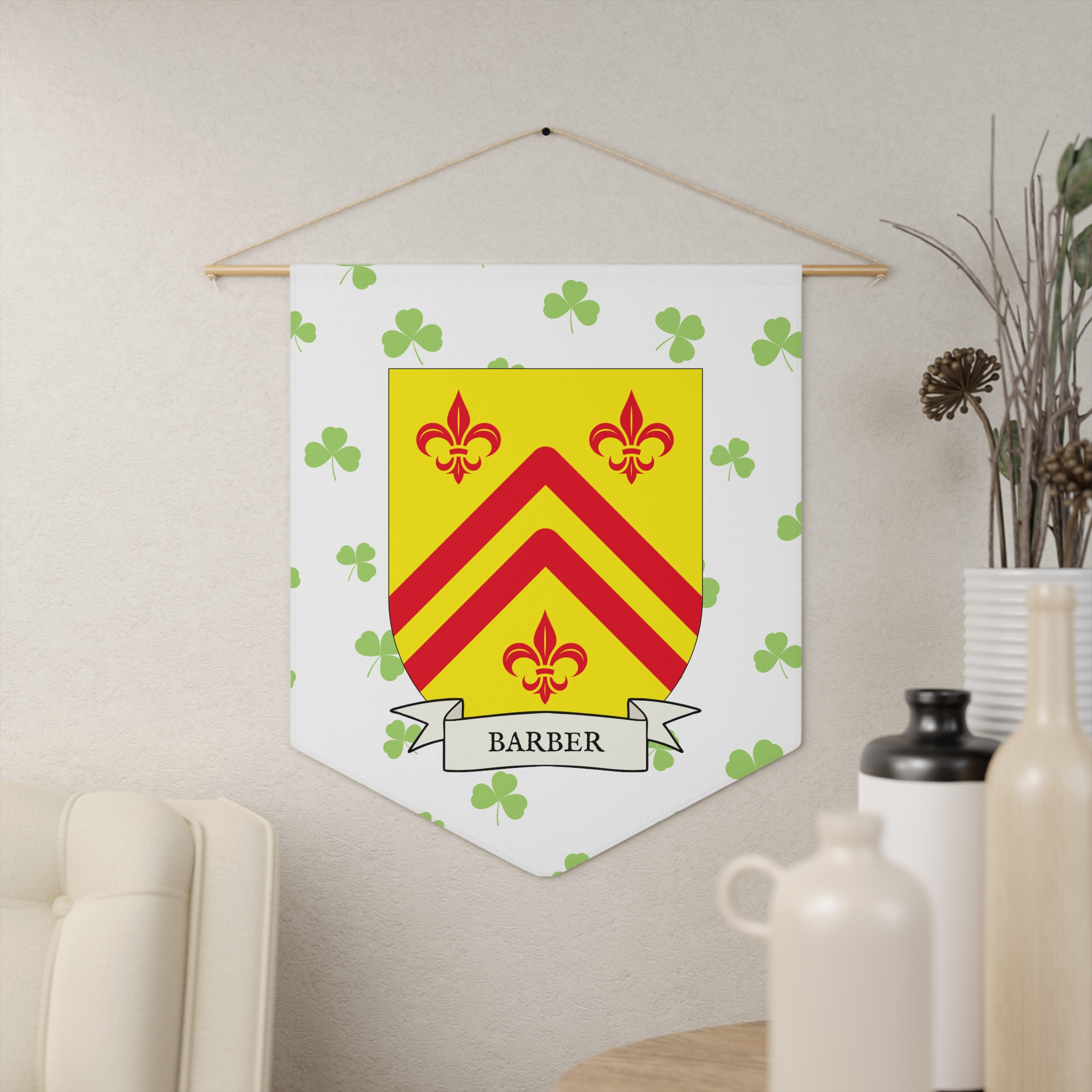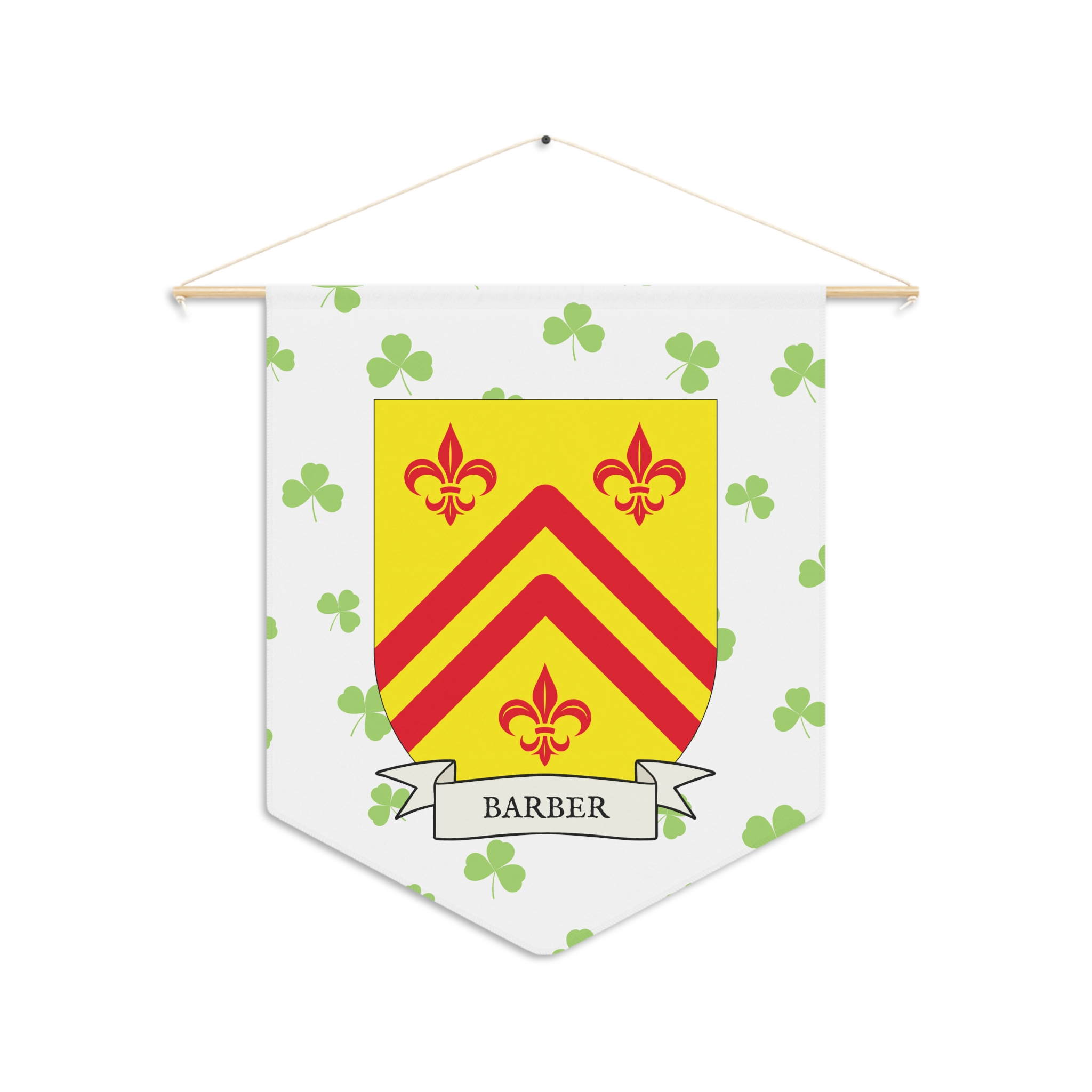 Uplift any room and show off your Irish American roots with this Barber Family Coat of Arms Indoor Pennant. Pennant is printed on durable poly twill and comes with a wooden dowel/twine frame for easy hanging. Features your family Coat of Arms printed over a restrained shamrock patterned background.
