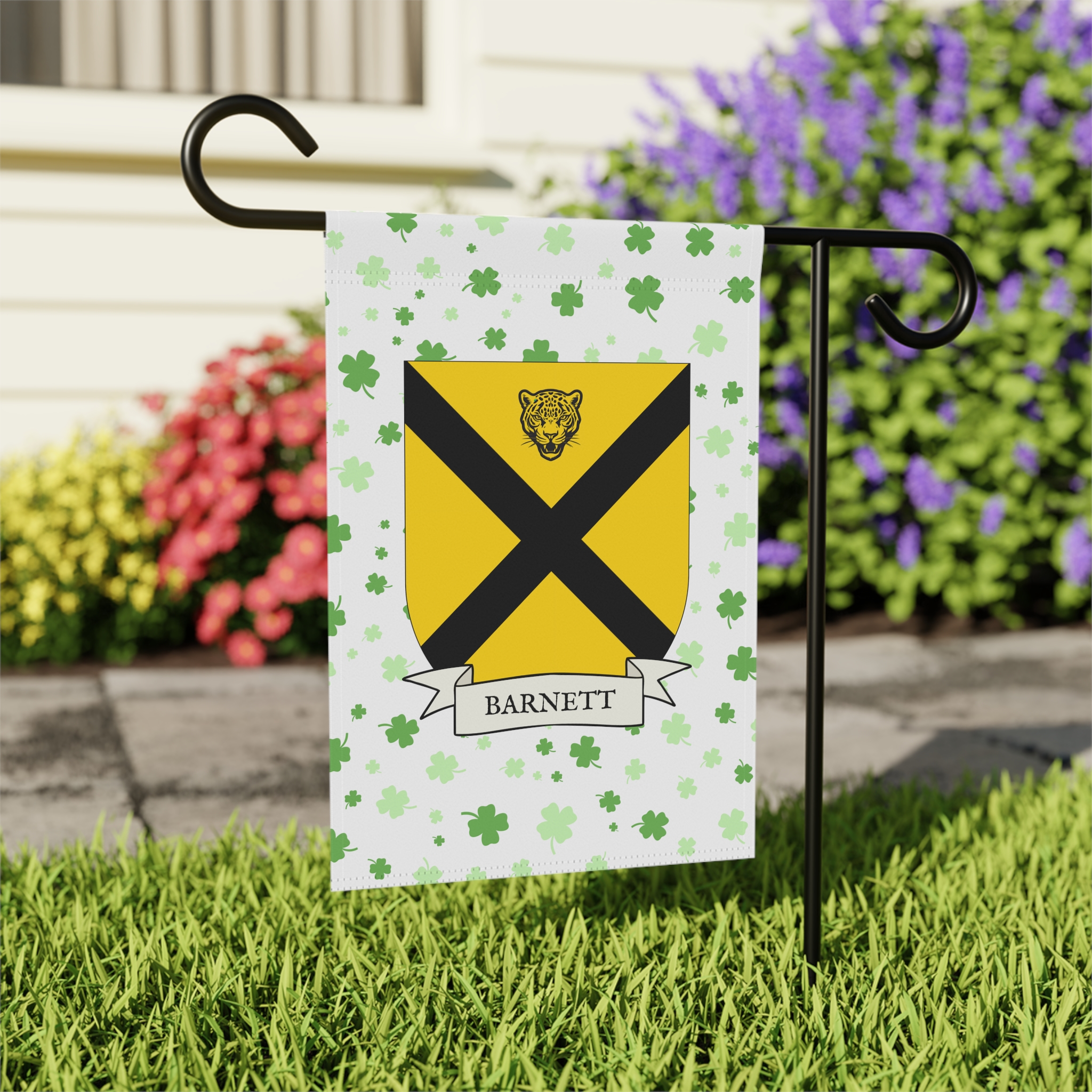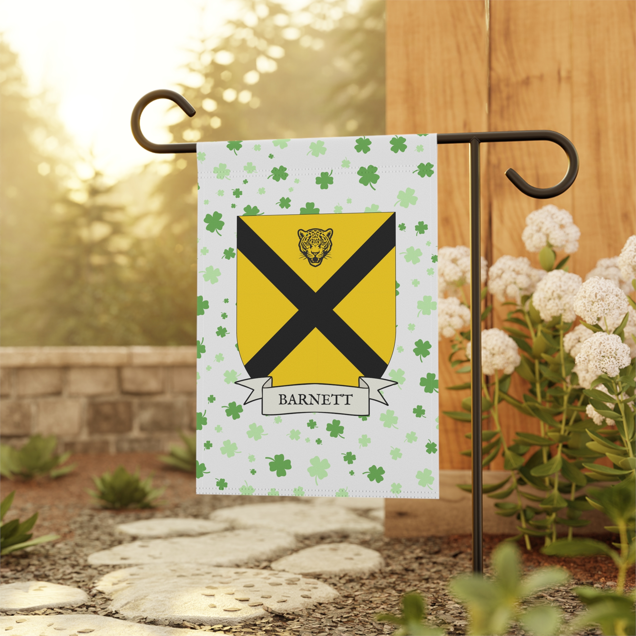 This welcoming Garden Banner will be a great addition to your garden or yard. It displays the Barnett family Coat of Arms over a subtle background showing a field of four-leaf shamrocks. Both sides show identical images.
