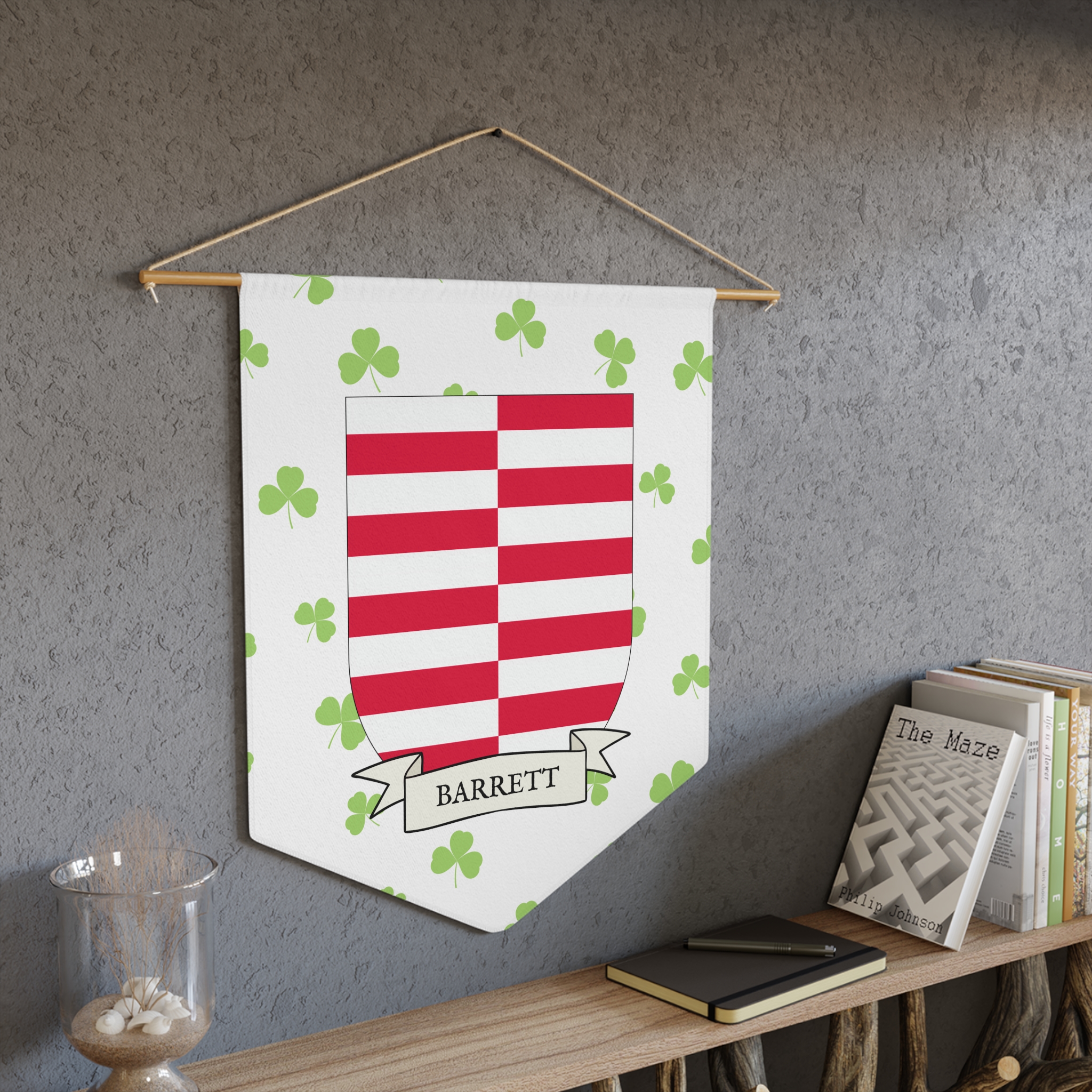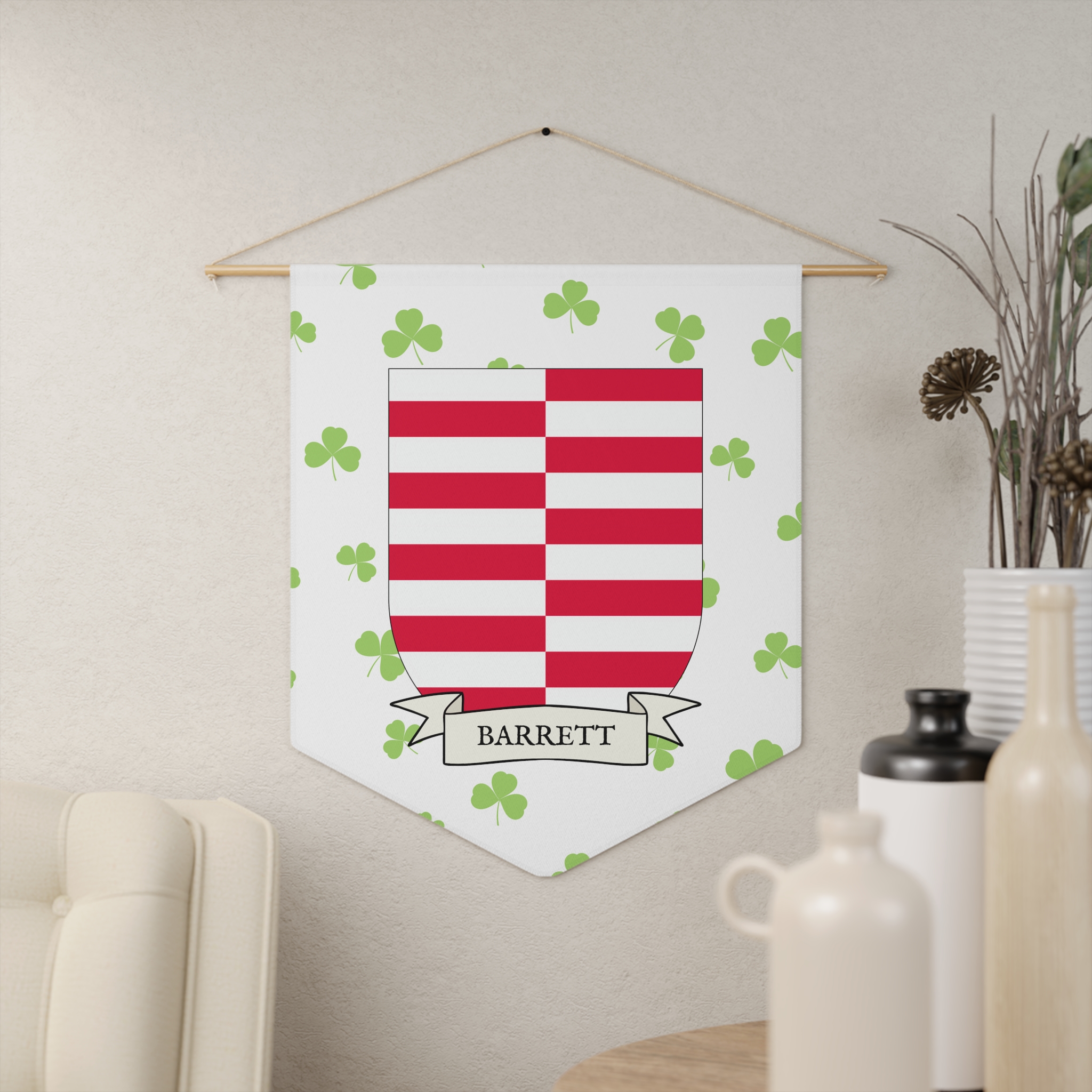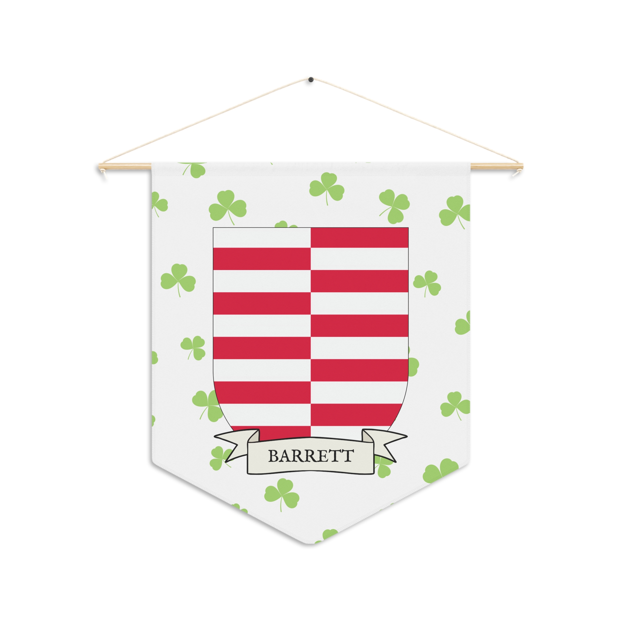 Uplift any room and show off your Irish American roots with this Barrett Family Coat of Arms Indoor Pennant. Pennant is printed on durable poly twill and comes with a wooden dowel/twine frame for easy hanging. Features your family Coat of Arms printed over a restrained shamrock patterned background.