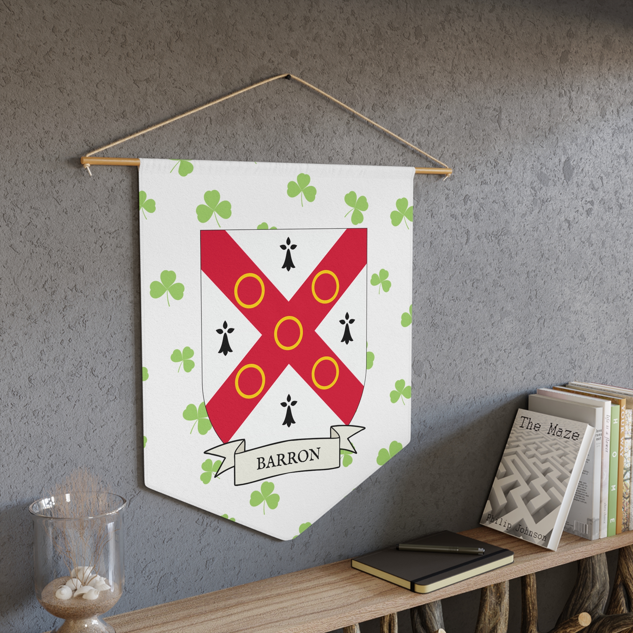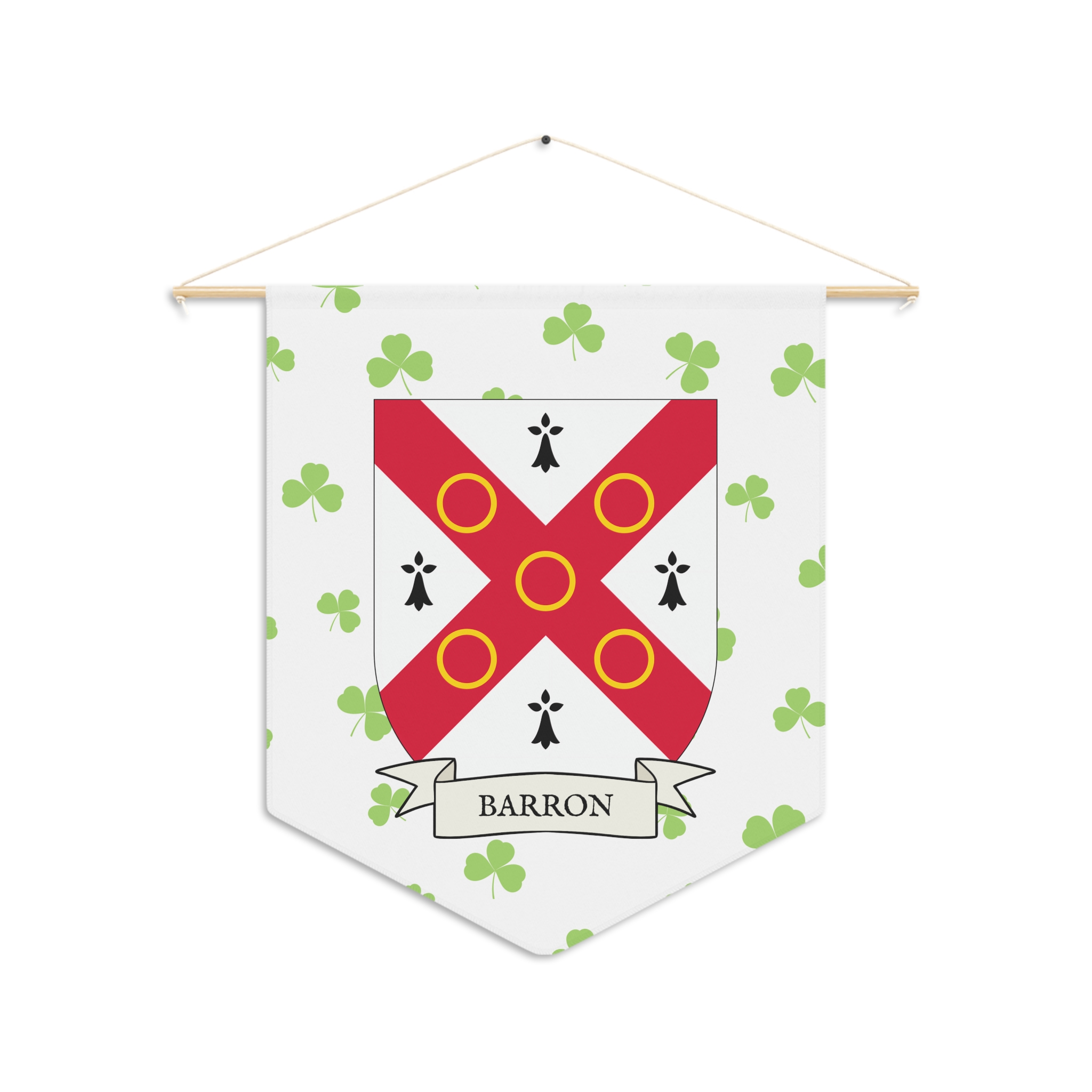 Uplift any room and show off your Irish American roots with this Barron Family Coat of Arms Indoor Pennant. Pennant is printed on durable poly twill and comes with a wooden dowel/twine frame for easy hanging. Features your family Coat of Arms printed over a restrained shamrock patterned background.