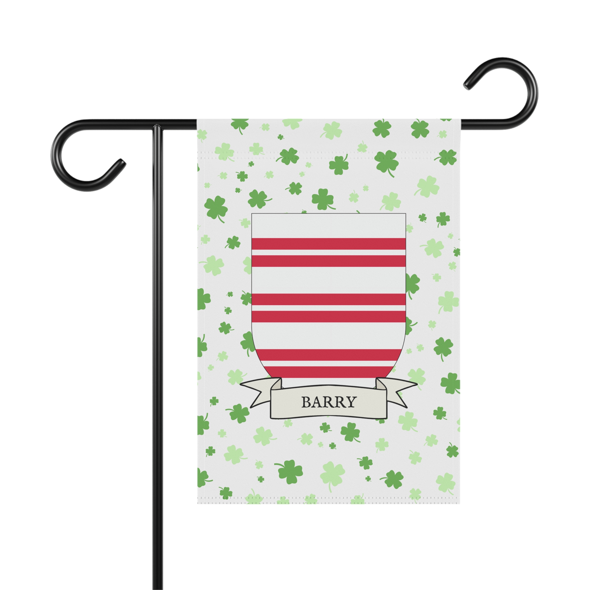 This welcoming Garden Banner will be a great addition to your garden or yard. It displays the Barry family Coat of Arms over a subtle background showing a field of four-leaf shamrocks. Both sides show identical images.