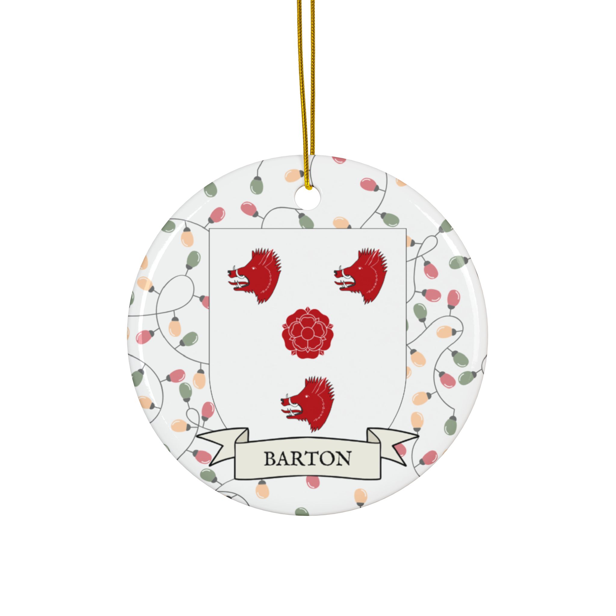 Celebrate the Holidays (and your Irish Heritage) with Irish Family Coat of Arms Christmas Tree Ornaments! Your family’s coat of arms printed on a 100% ceramic ornament with a festive Christmas Tree lights background. Great gift idea for the Irish Americans in your life. It’s sure to become a Christmas tradition!3-inch Diameter 100% Ceramic Ornament
