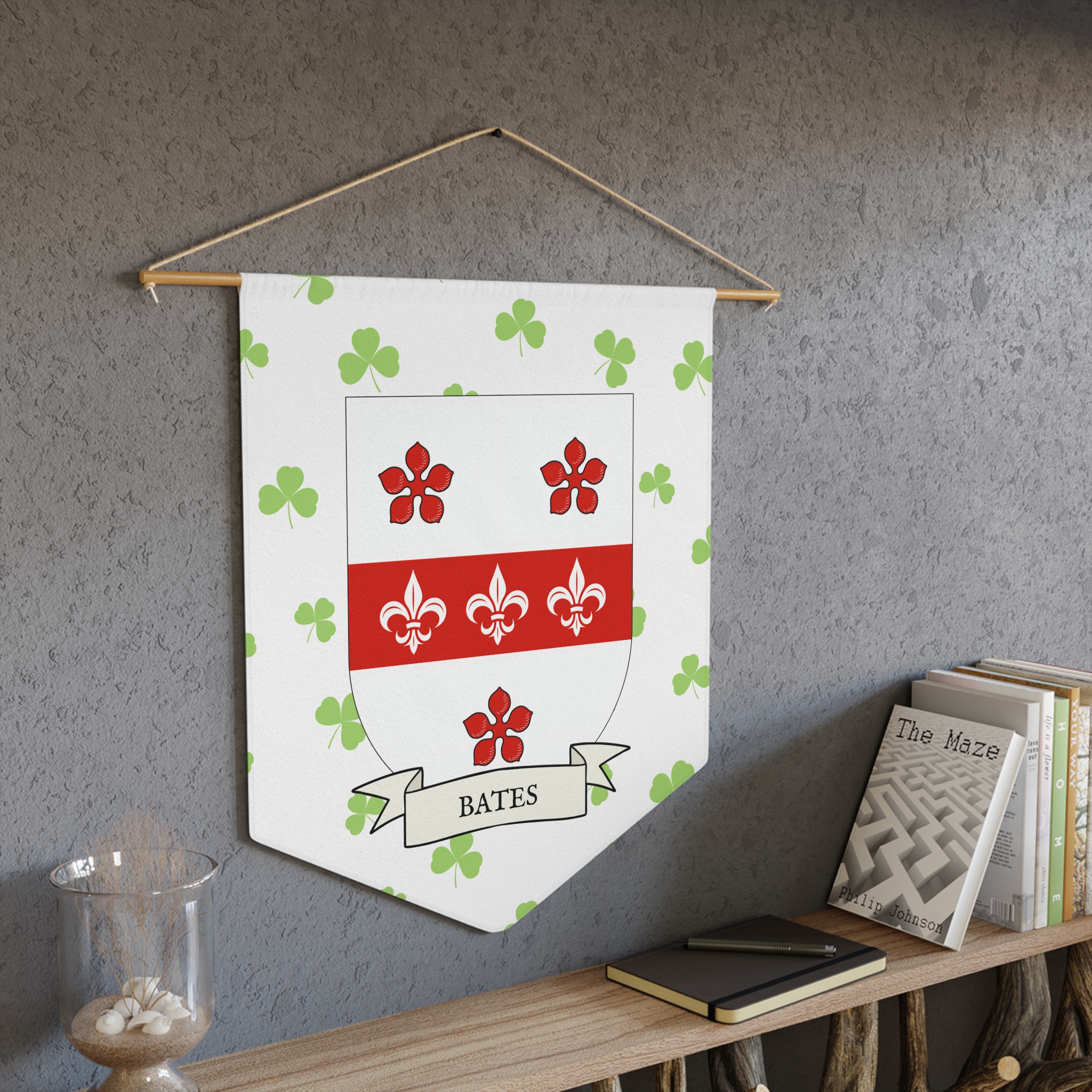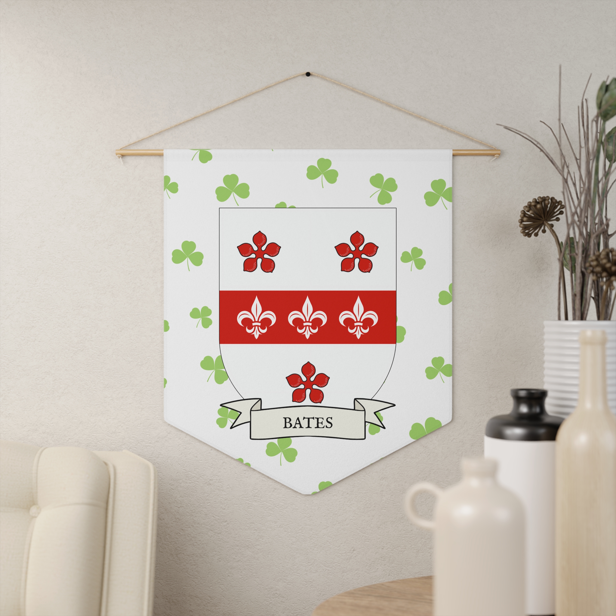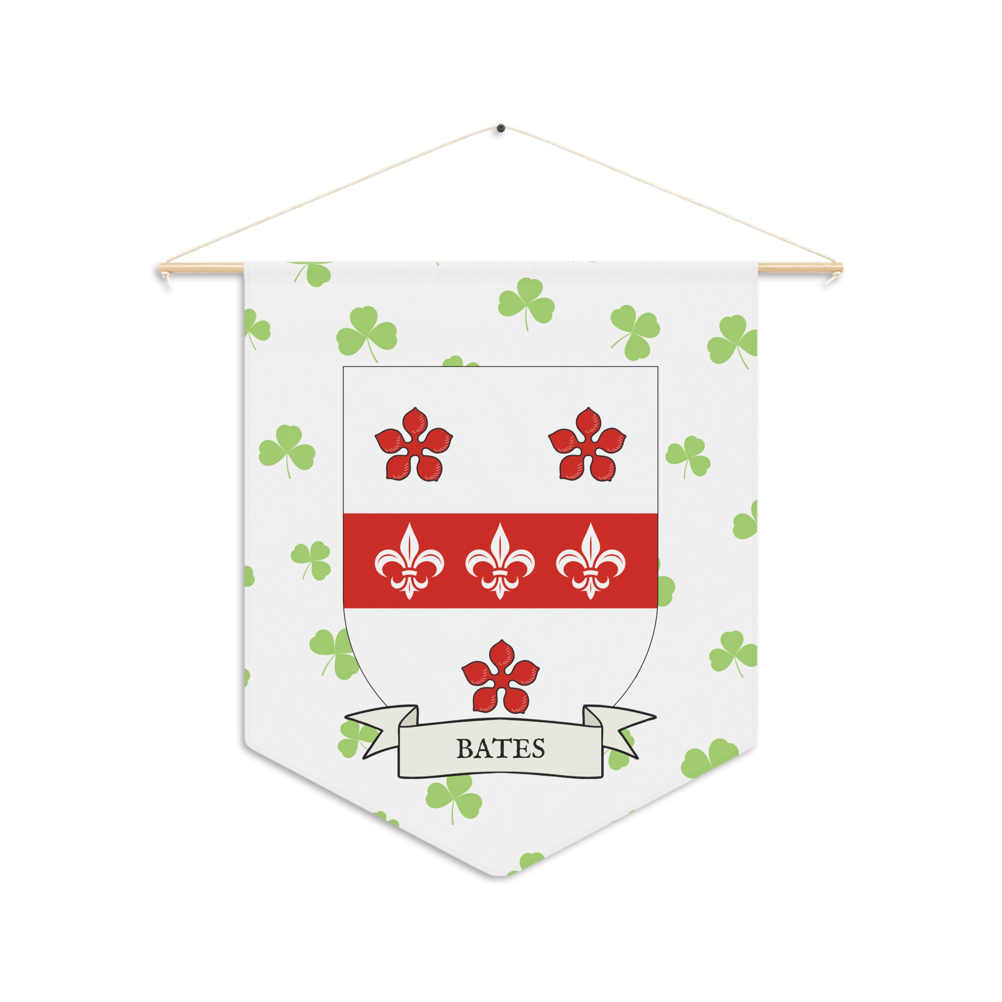 Uplift any room and show off your Irish American roots with this Bates Family Coat of Arms Indoor Pennant. Pennant is printed on durable poly twill and comes with a wooden dowel/twine frame for easy hanging. Features your family Coat of Arms printed over a restrained shamrock patterned background.