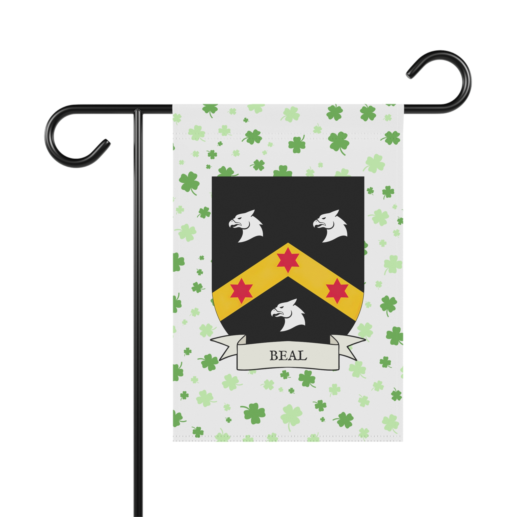 This welcoming Garden Banner will be a great addition to your garden or yard. It displays the Beal Family Coat of Arms over a subtle background showing a field of four-leaf shamrocks. Both sides show identical images.