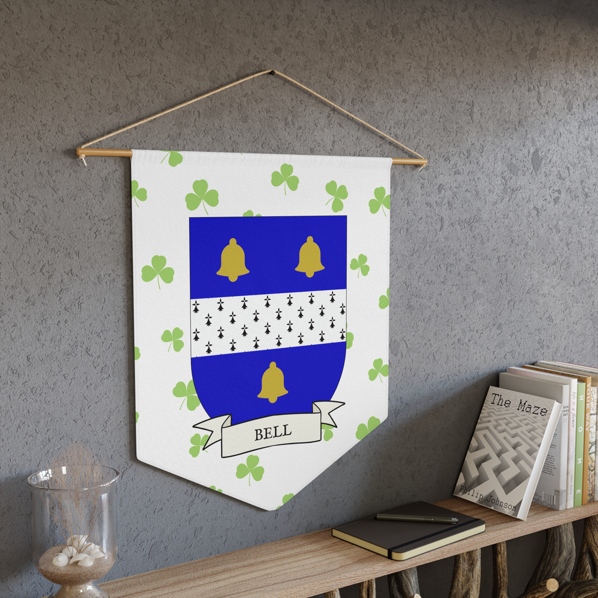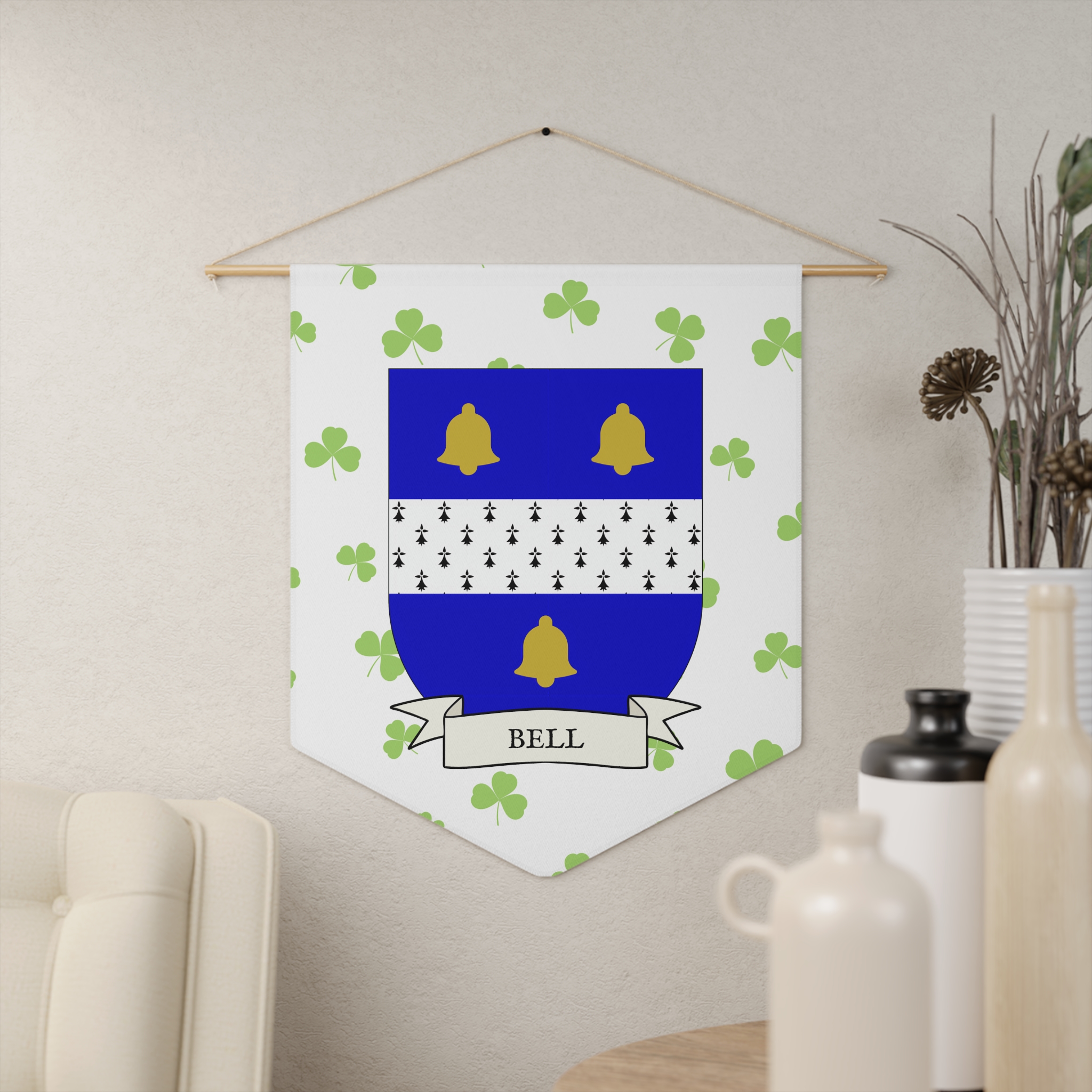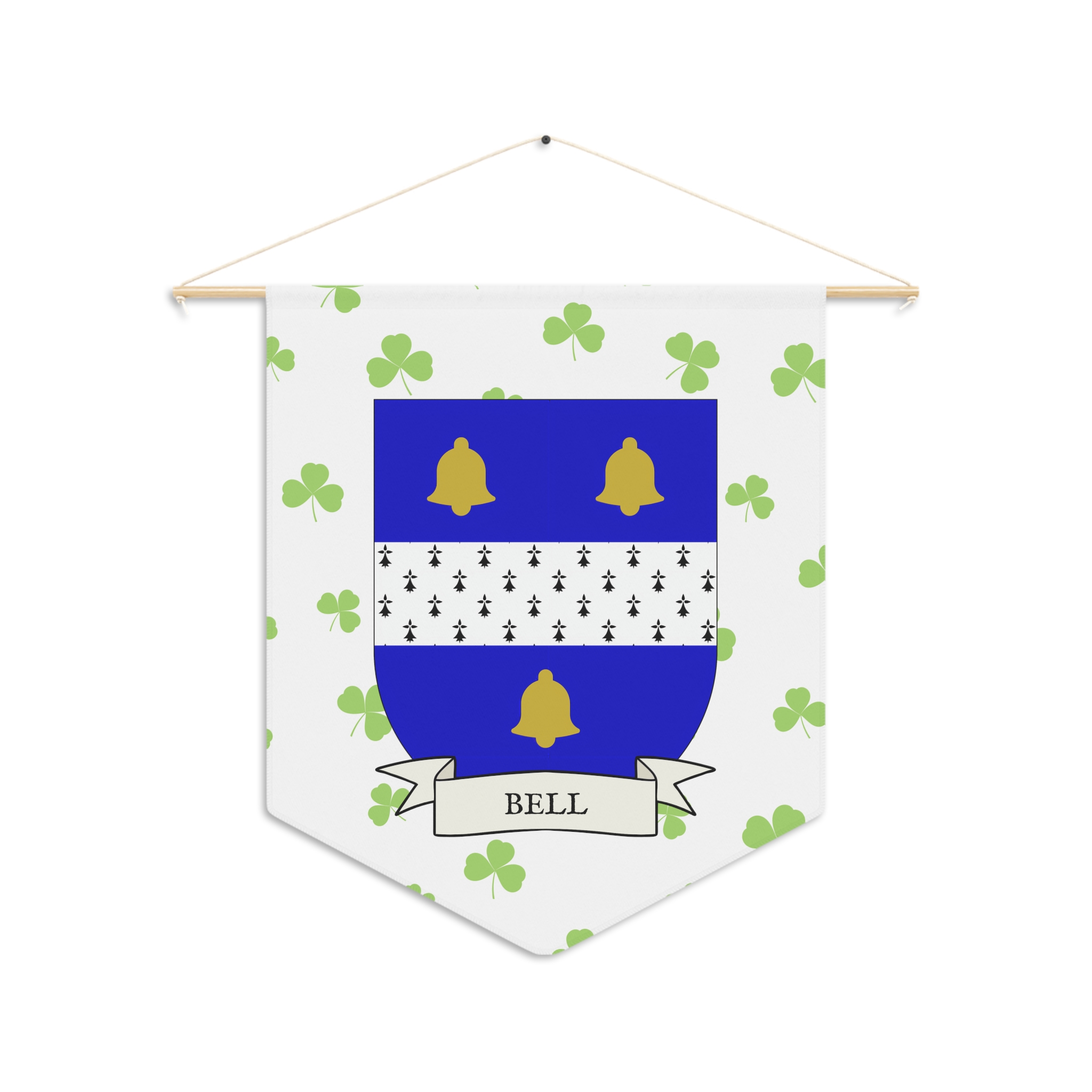 Uplift any room and show off your Irish American roots with this Bell Family Coat of Arms Indoor Pennant. Pennant is printed on durable poly twill and comes with a wooden dowel/twine frame for easy hanging. Features your family Coat of Arms printed over a restrained shamrock patterned background.