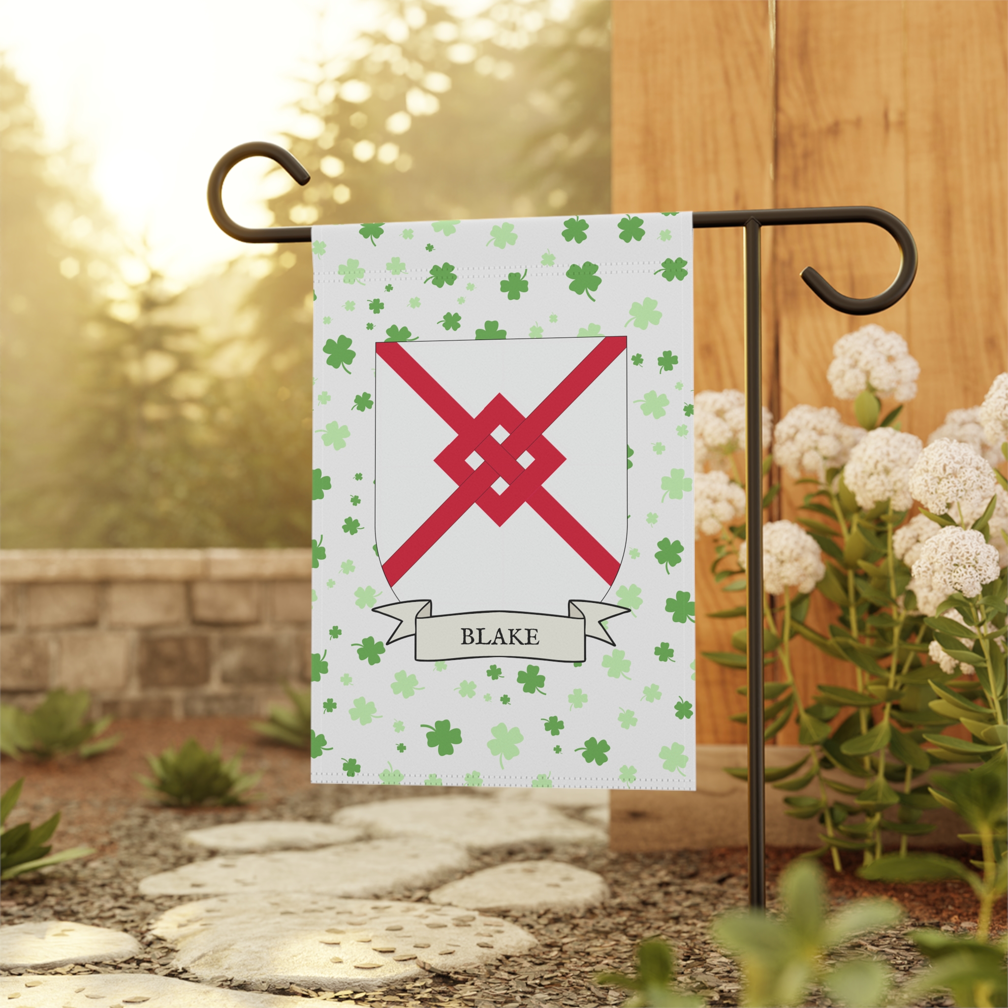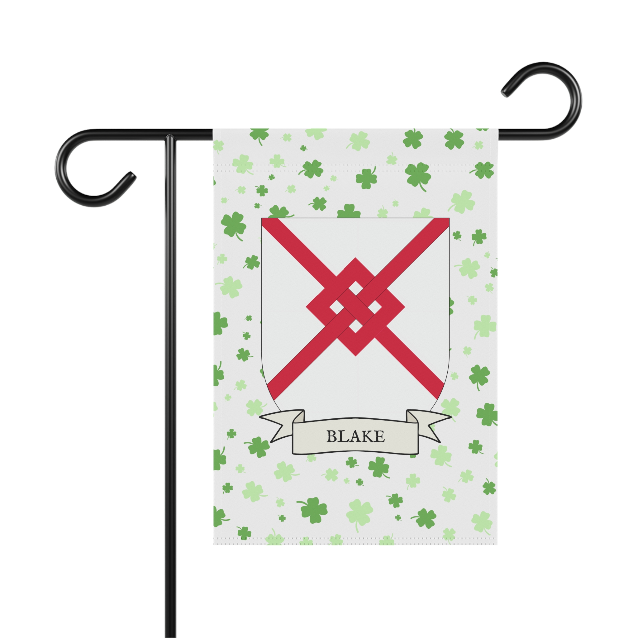 This welcoming Garden Banner will be a great addition to your garden or yard. It displays the Blake family Coat of Arms over a subtle background showing a field of four-leaf shamrocks. Both sides show identical images.
