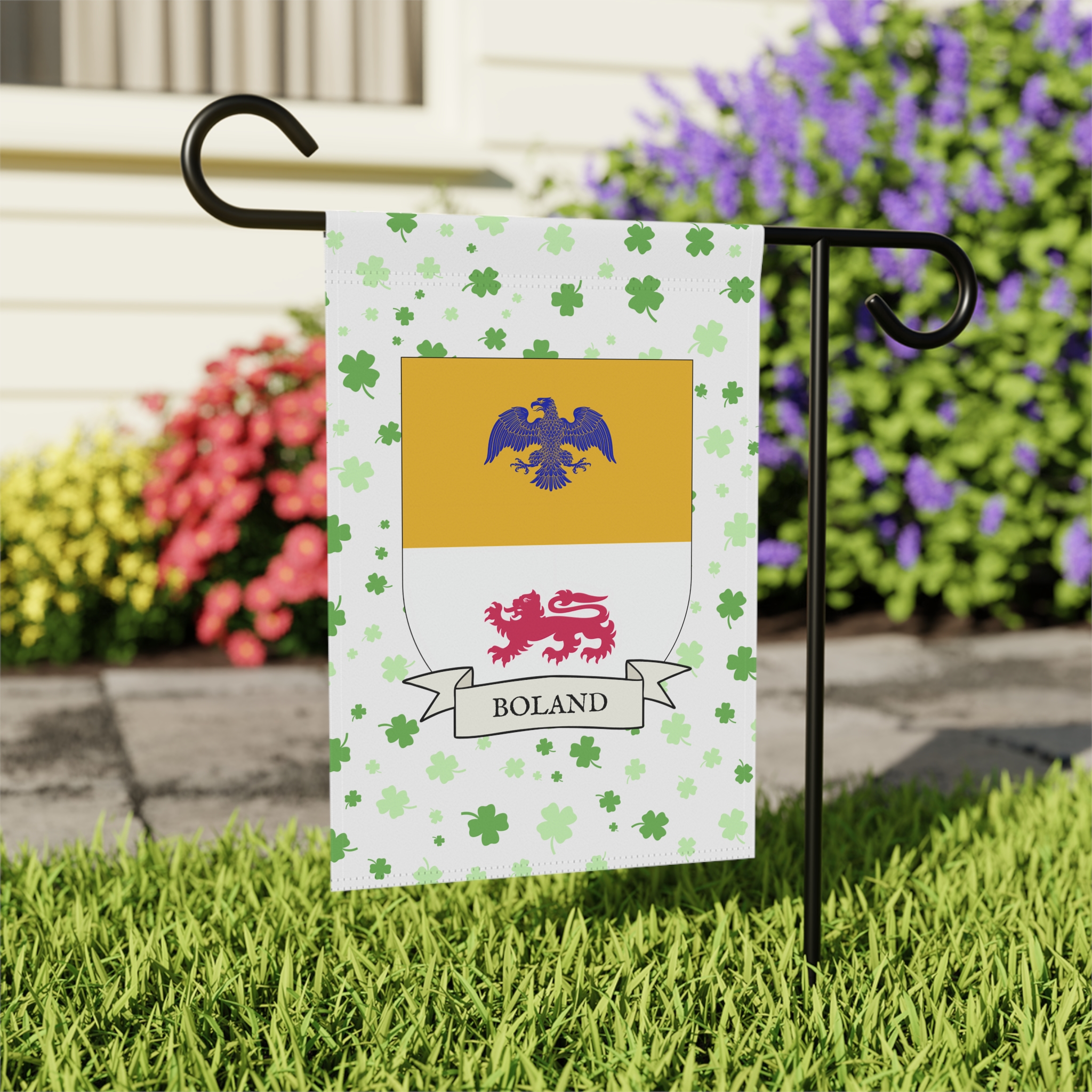 This welcoming Garden Banner will be a great addition to your garden or yard. It displays the Boland family Coat of Arms over a subtle background showing a field of four-leaf shamrocks. Both sides show identical images.