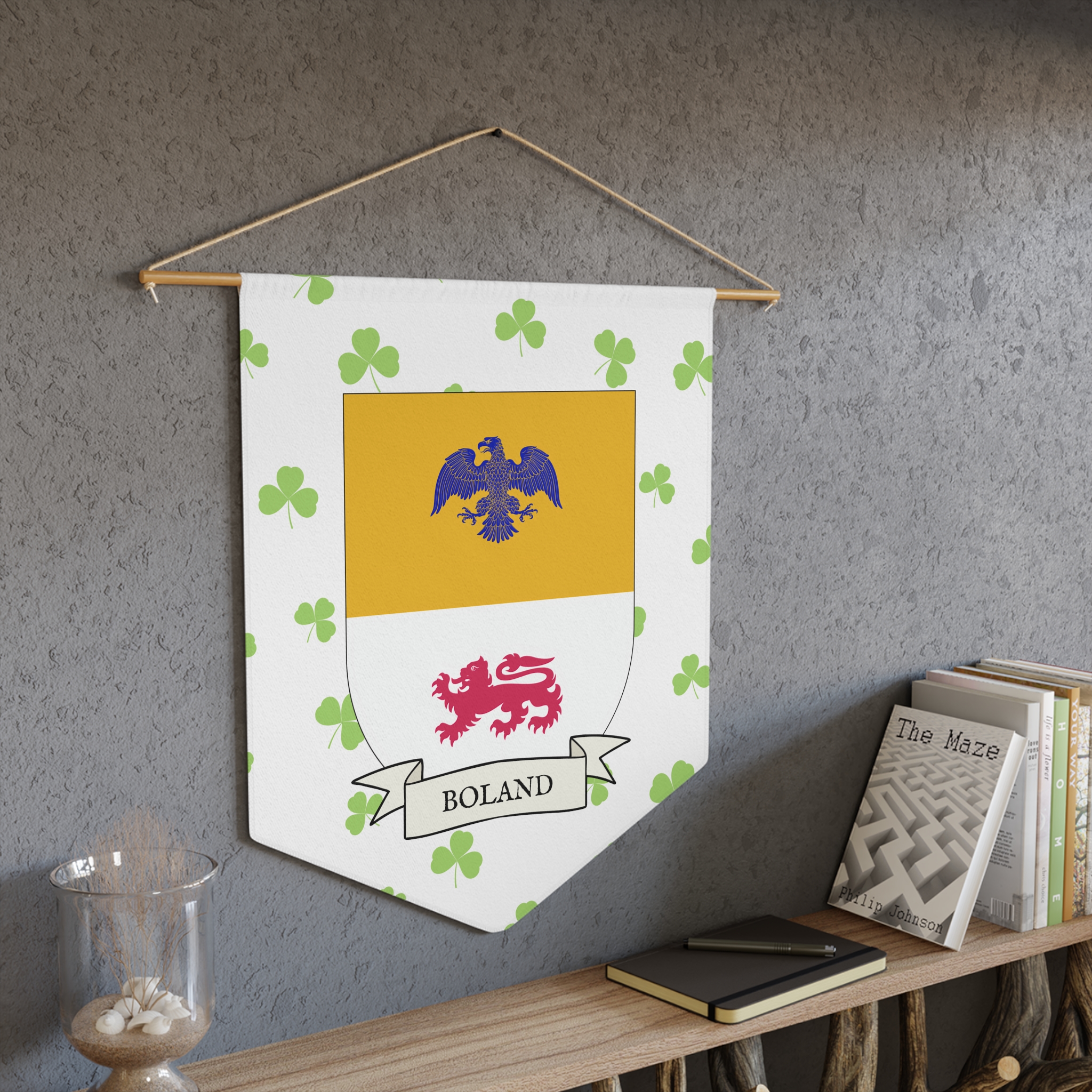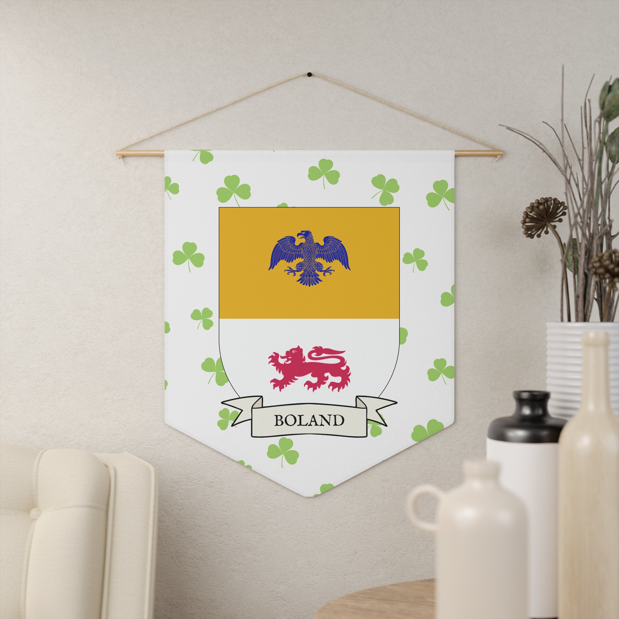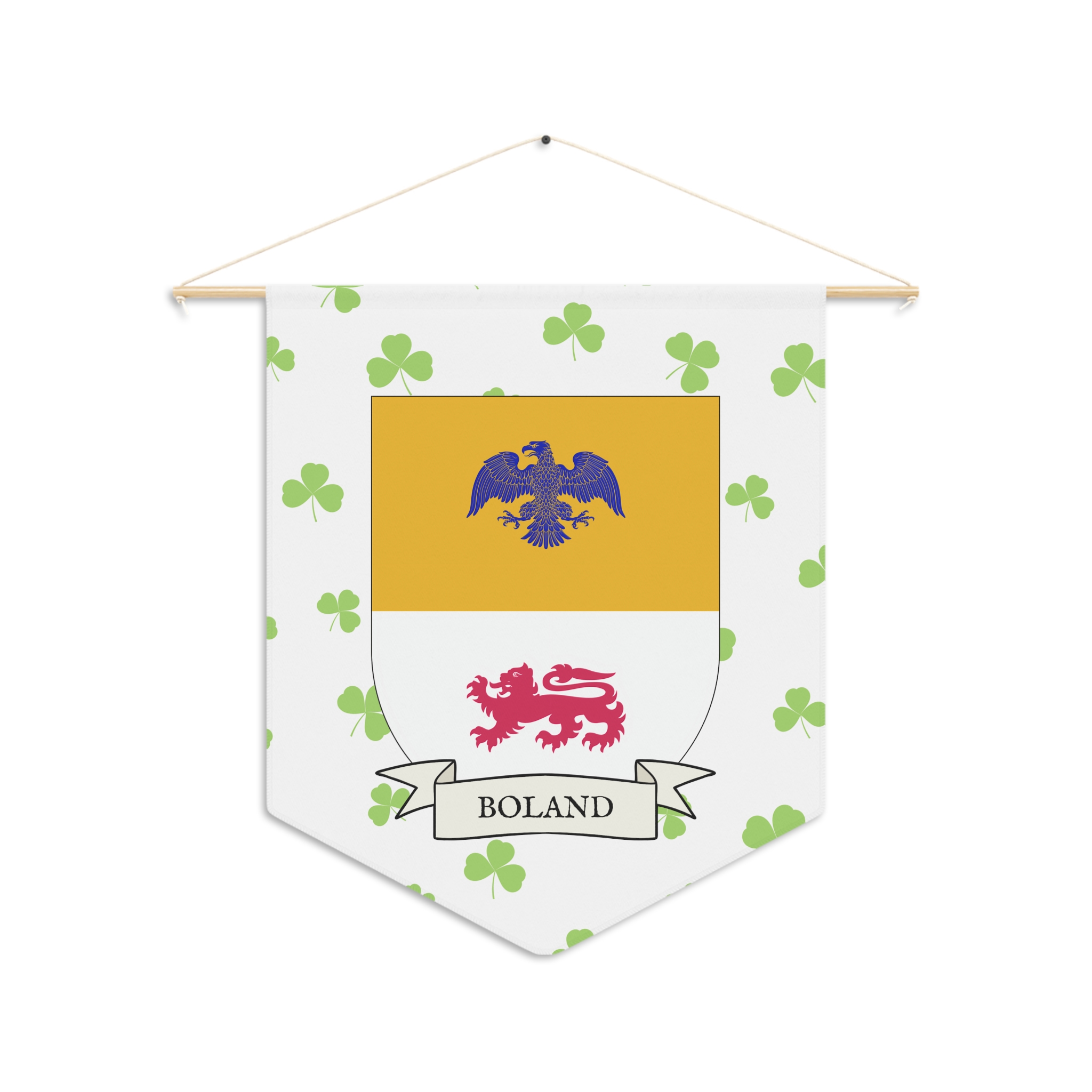 Uplift any room and show off your Irish American roots with this Boland Family Coat of Arms Indoor Pennant. Pennant is printed on durable poly twill and comes with a wooden dowel/twine frame for easy hanging. Features your family Coat of Arms printed over a restrained shamrock patterned background.