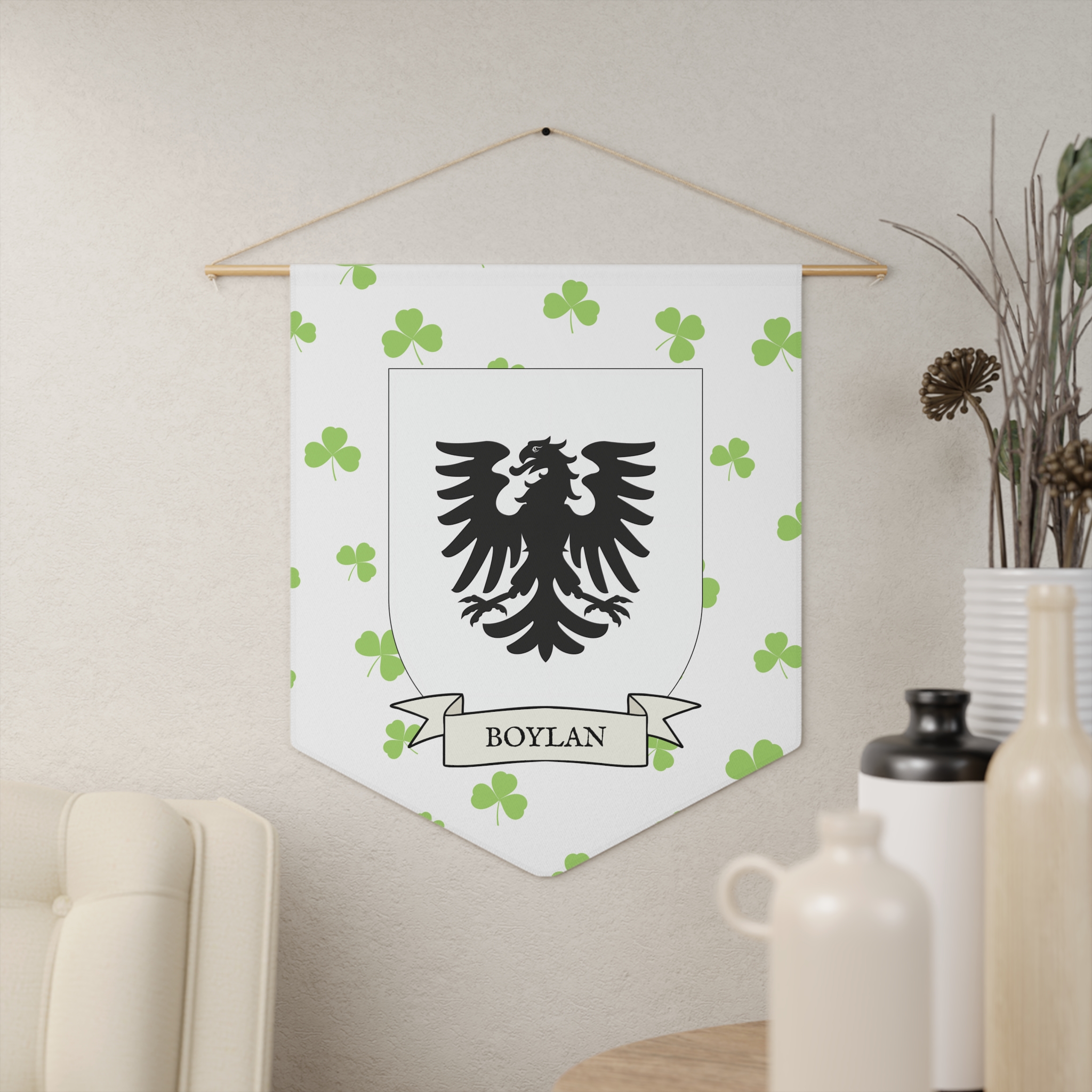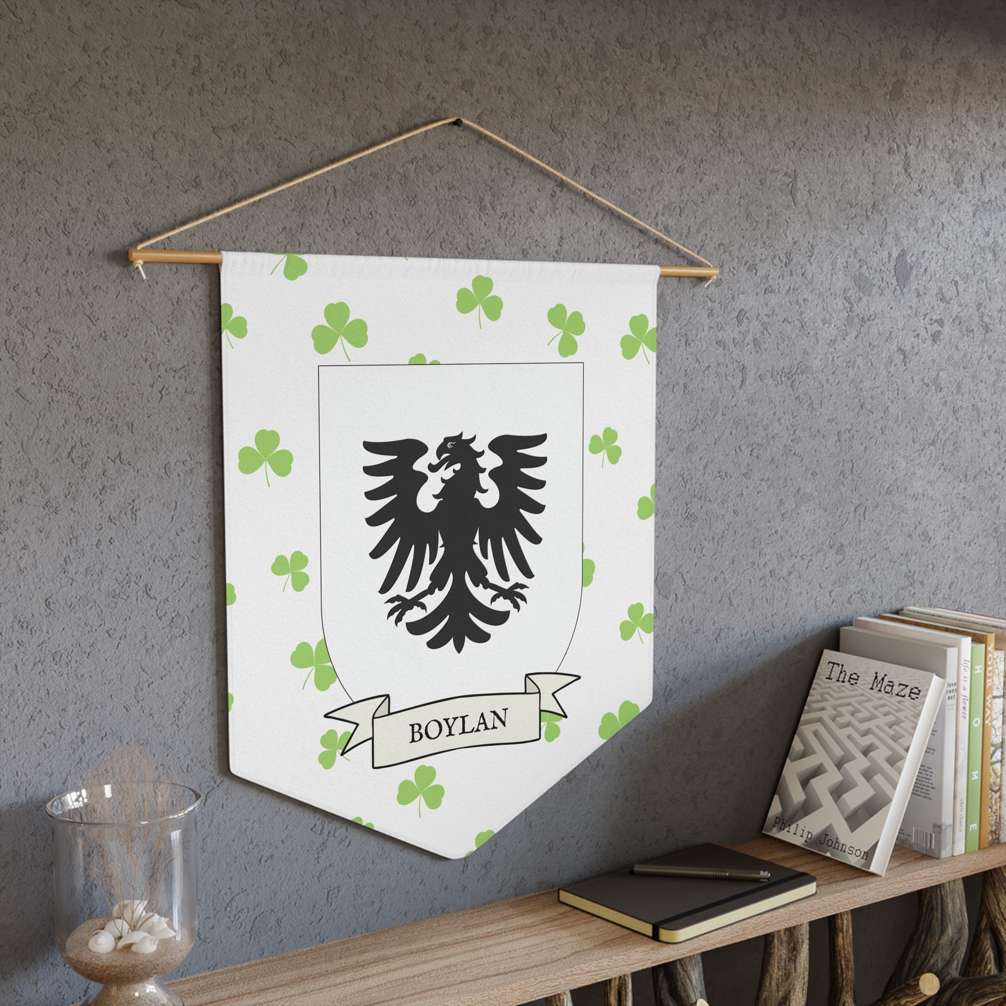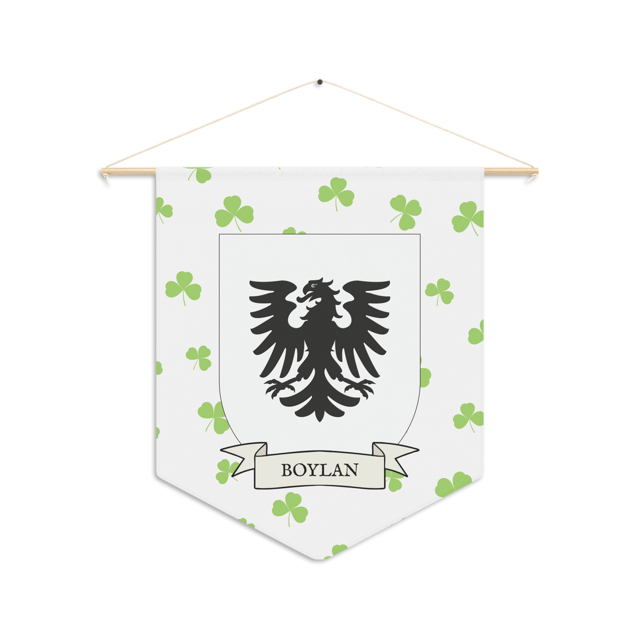 Uplift any room and show off your Irish American roots with this Boylan Family Coat of Arms Indoor Pennant. Pennant is printed on durable poly twill and comes with a wooden dowel/twine frame for easy hanging. Features your family Coat of Arms printed over a restrained shamrock patterned background.