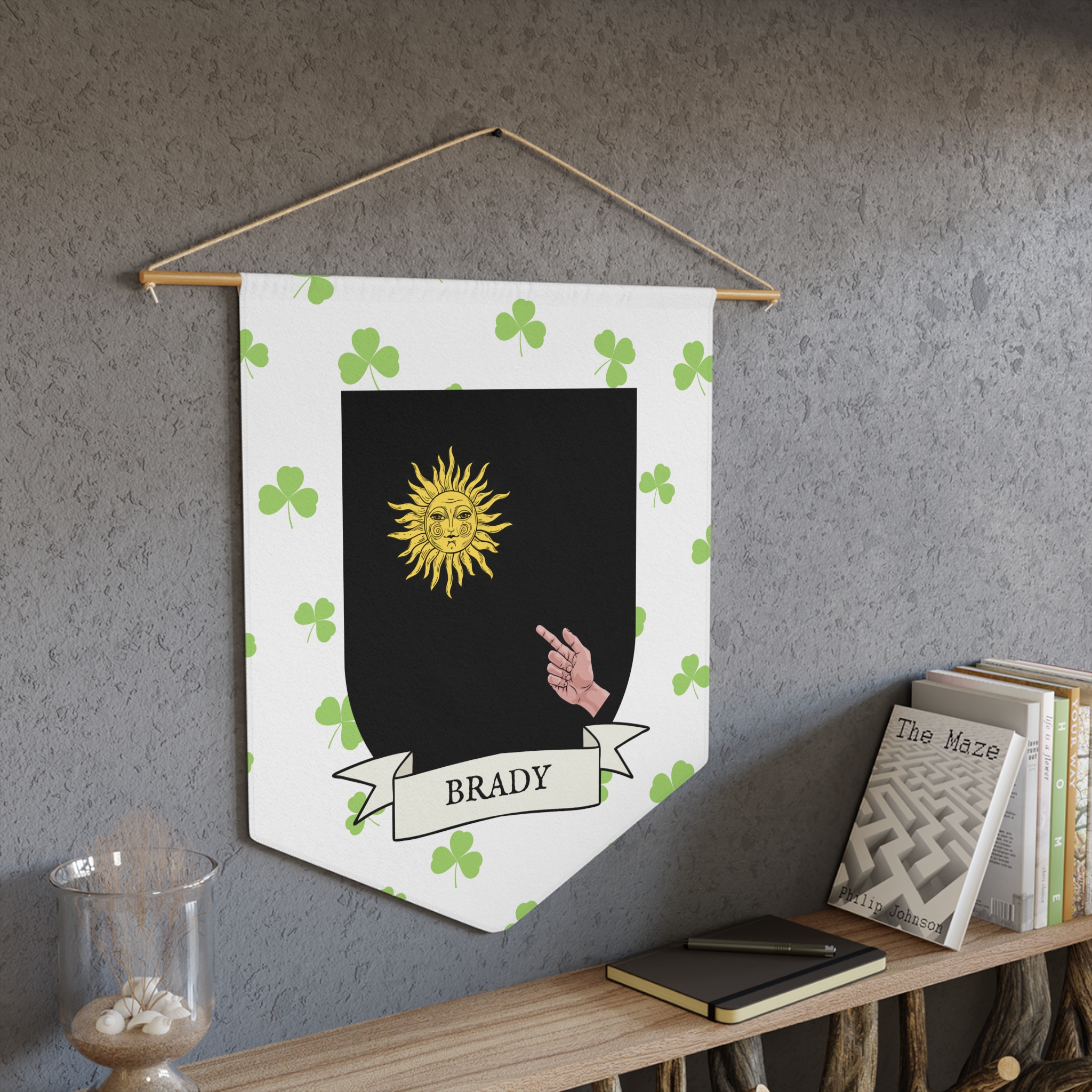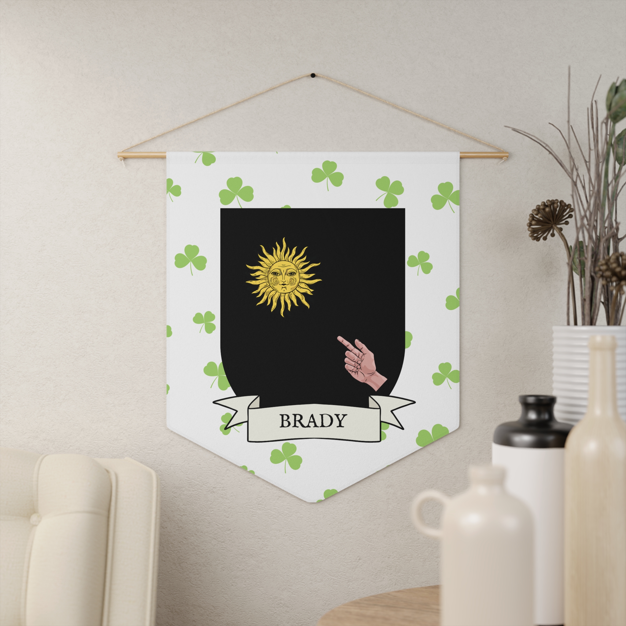 Uplift any room and show off your Irish American roots with this Brady Family Coat of Arms Indoor Pennant. Pennant is printed on durable poly twill and comes with a wooden dowel/twine frame for easy hanging. Features your family Coat of Arms printed over a restrained shamrock patterned background.