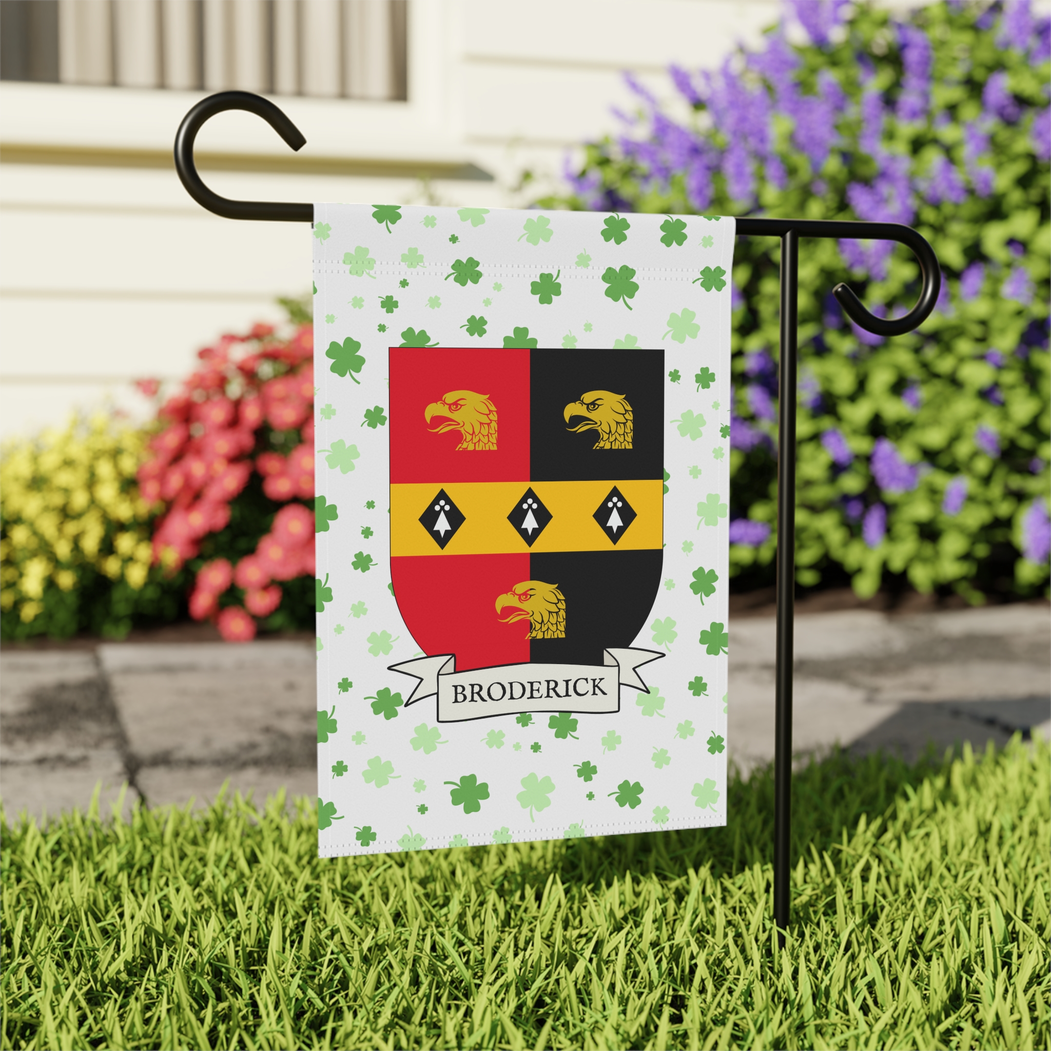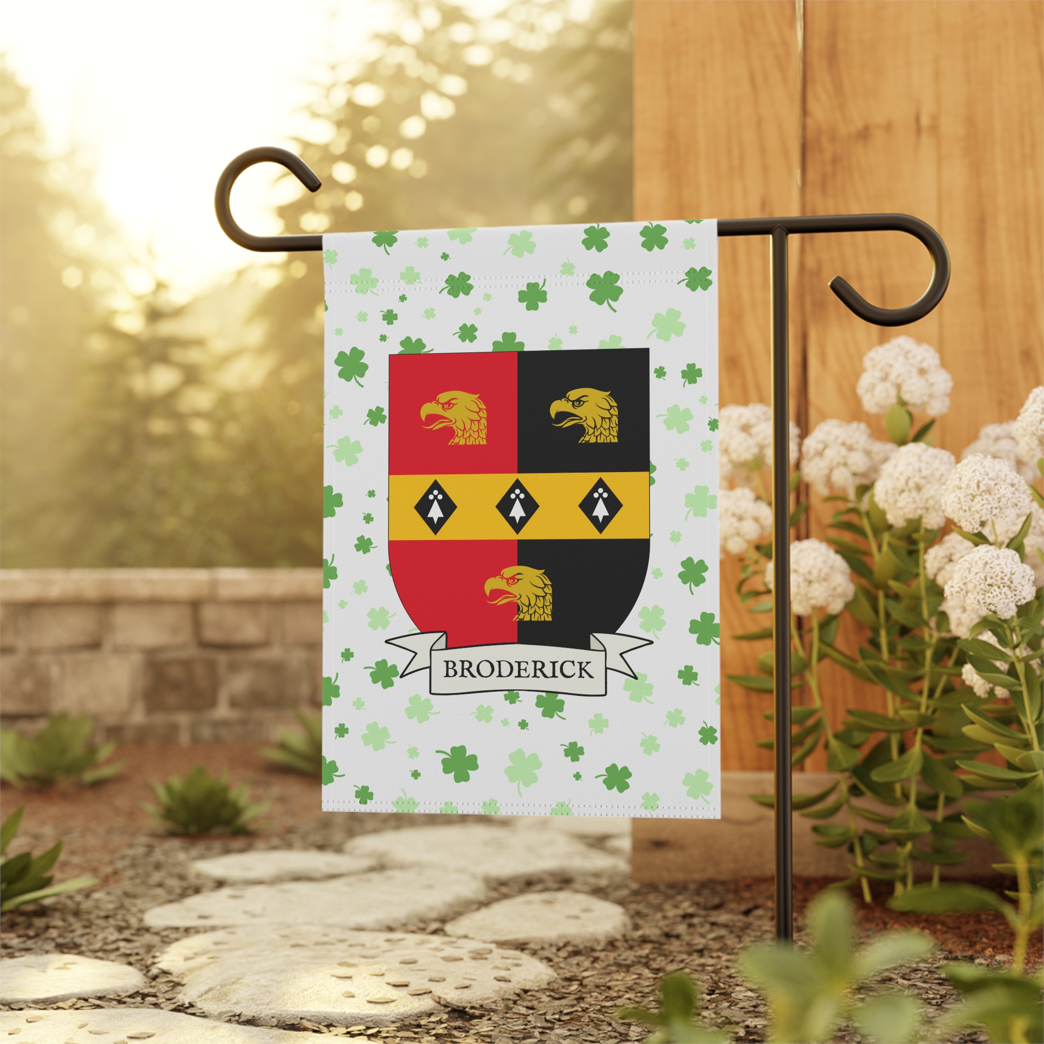 This welcoming Garden Banner will be a great addition to your garden or yard. It displays the Broderick family Coat of Arms over a subtle background showing a field of four-leaf shamrocks. Both sides show identical images.