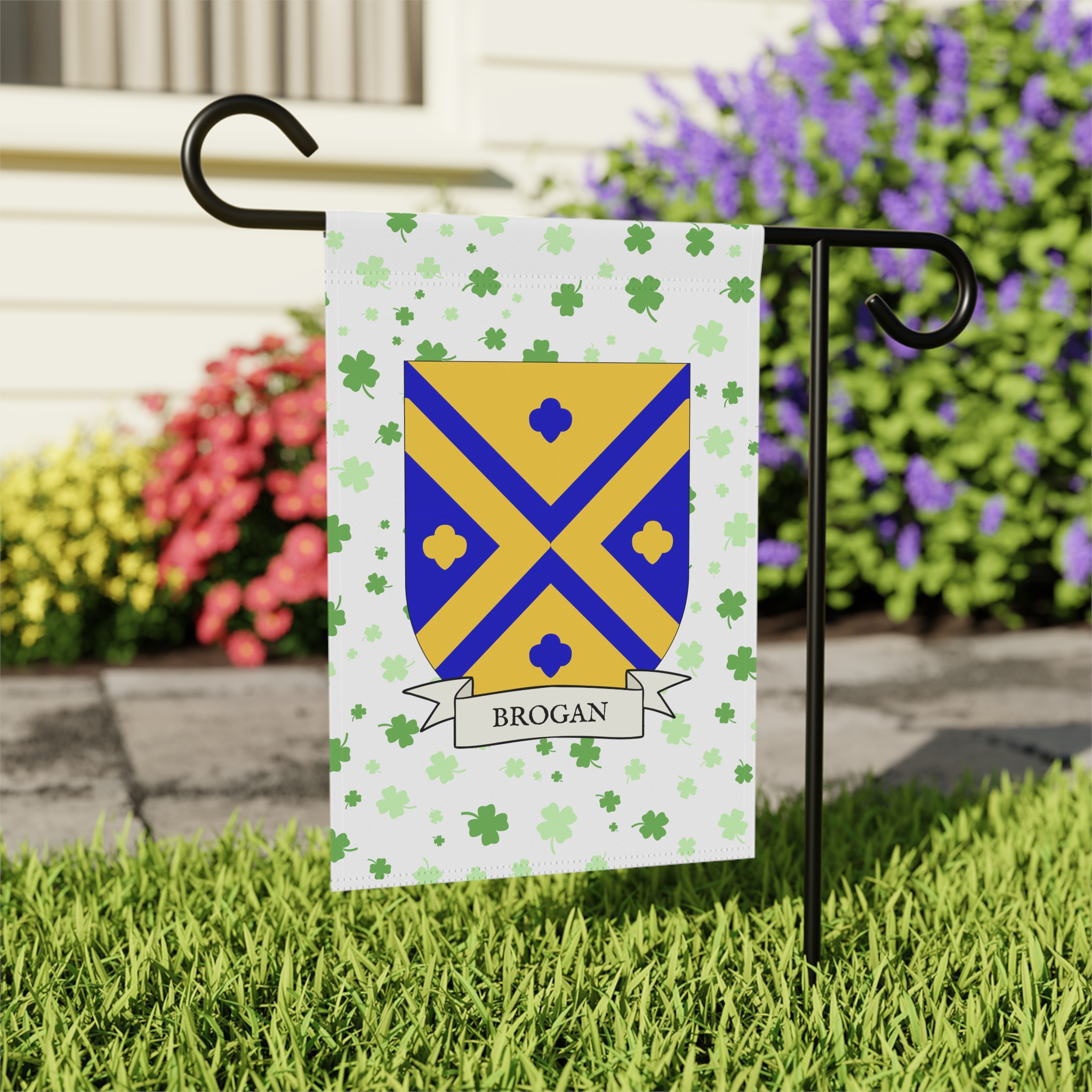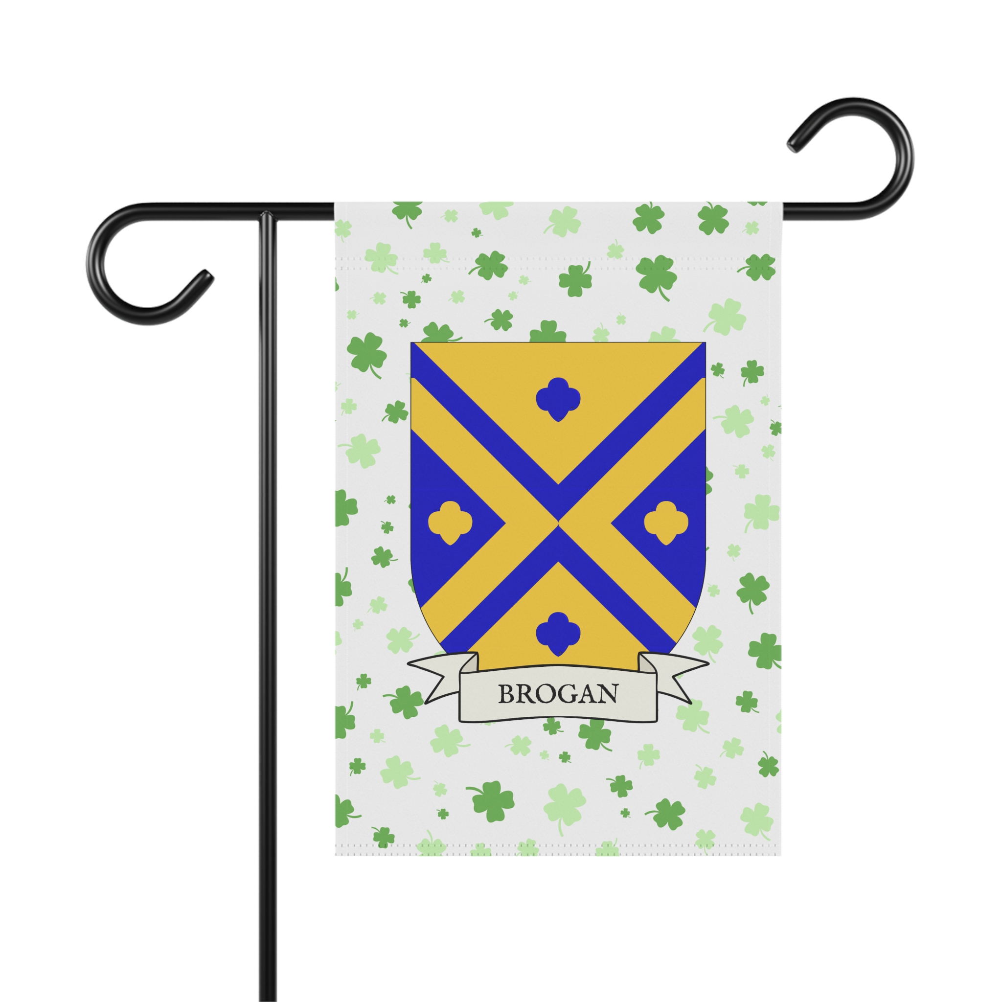 This welcoming Garden Banner will be a great addition to your garden or yard. It displays the Brogan family Coat of Arms over a subtle background showing a field of four-leaf shamrocks. Both sides show identical images.