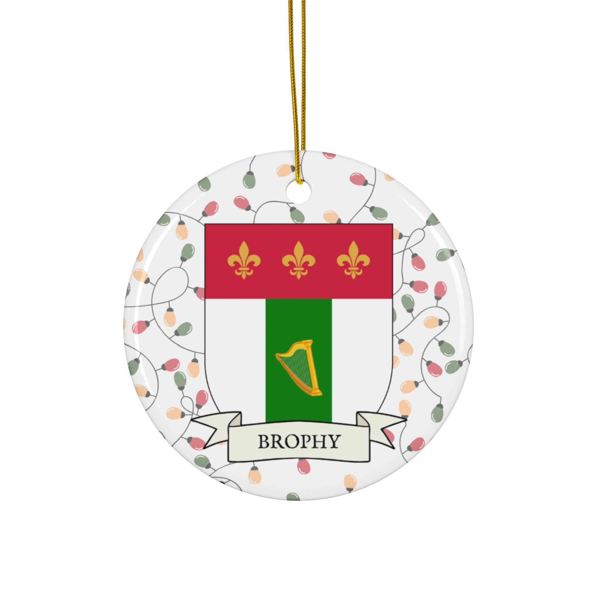 Celebrate the Holidays (and your Irish Heritage) with Irish Family Coat of Arms Christmas Tree Ornaments! Your family’s coat of arms printed on a 100% ceramic ornament with a festive Christmas Tree lights background. Great gift idea for the Irish Americans in your life. It’s sure to become a Christmas tradition!
