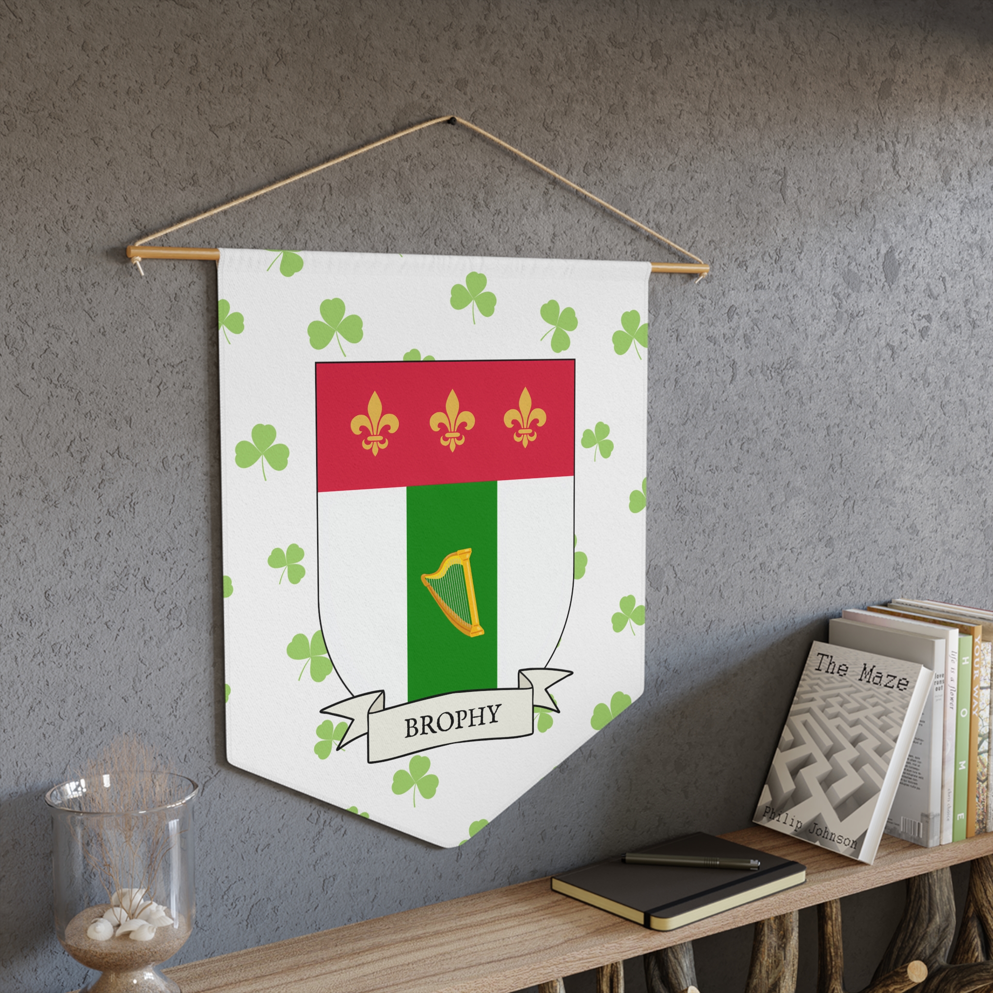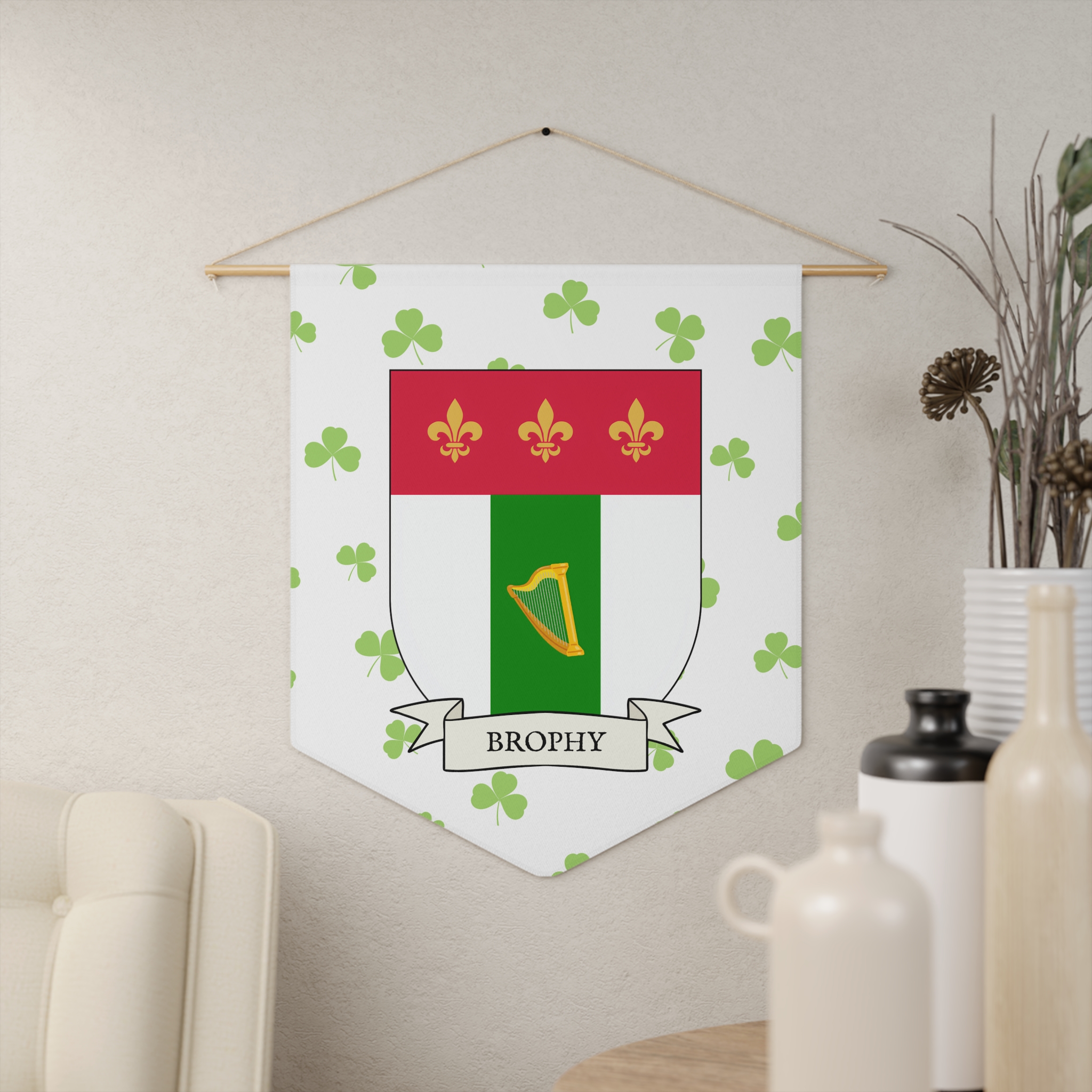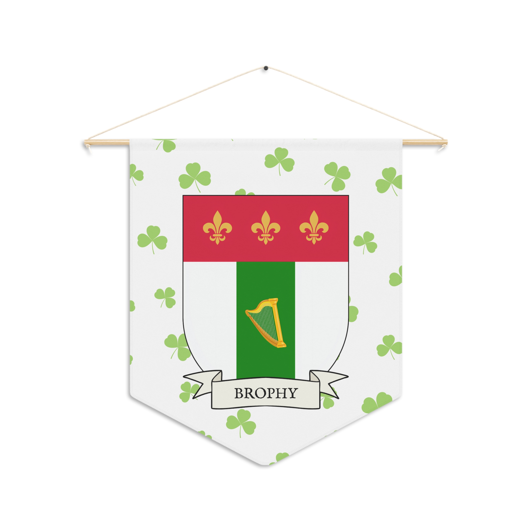 Uplift any room and show off your Irish American roots with this Brophy Family Coat of Arms Indoor Pennant. Pennant is printed on durable poly twill and comes with a wooden dowel/twine frame for easy hanging. Features your family Coat of Arms printed over a restrained shamrock patterned background.