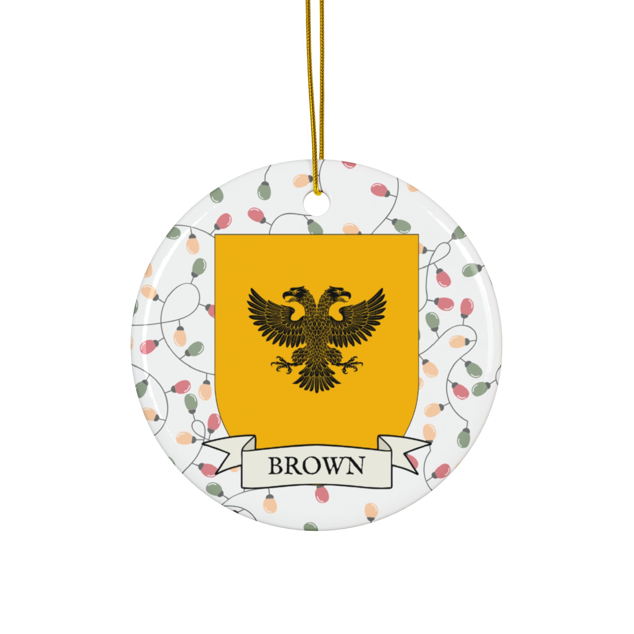 Celebrate the Holidays (and your Irish Heritage) with Irish Family Coat of Arms Christmas Tree Ornaments! Your family’s coat of arms printed on a 100% ceramic ornament with a festive Christmas Tree lights background. Great gift idea for the Irish Americans in your life. It’s sure to become a Christmas tradition!3-inch Diameter 100% Ceramic Ornament