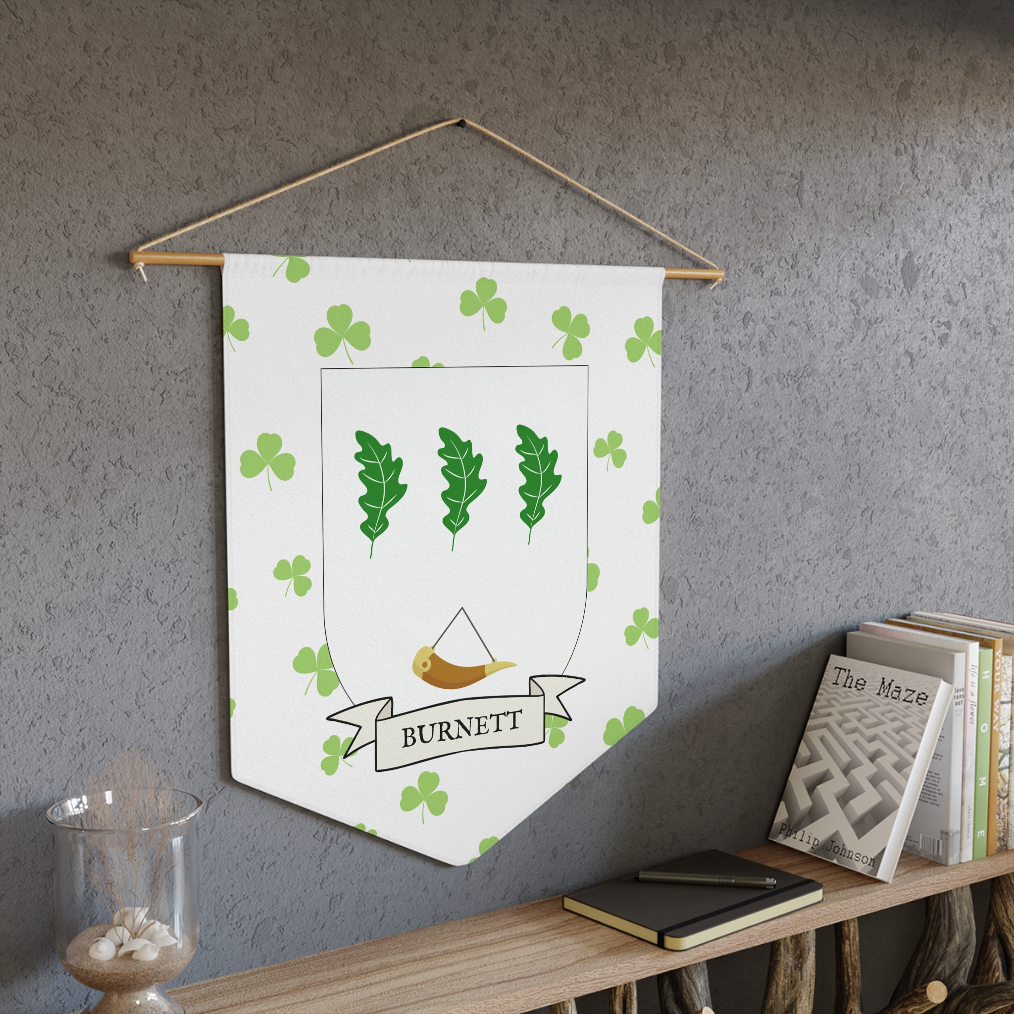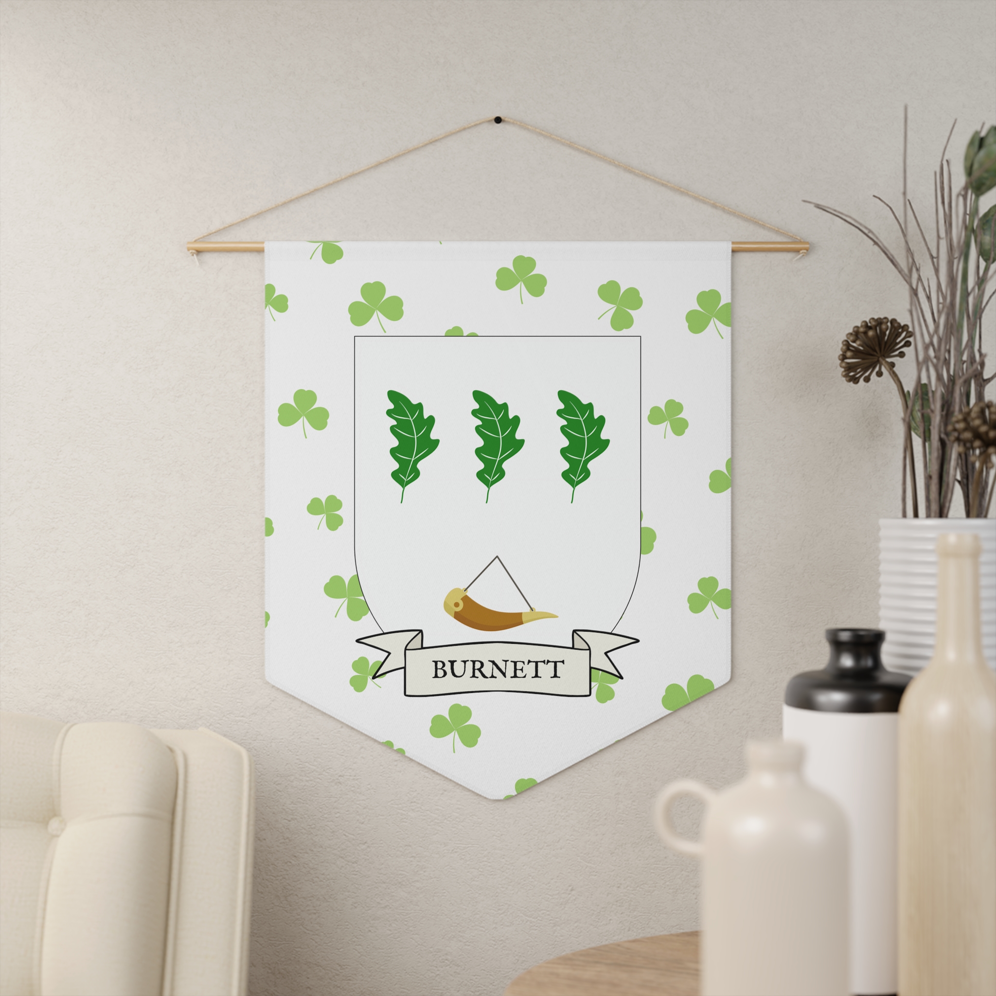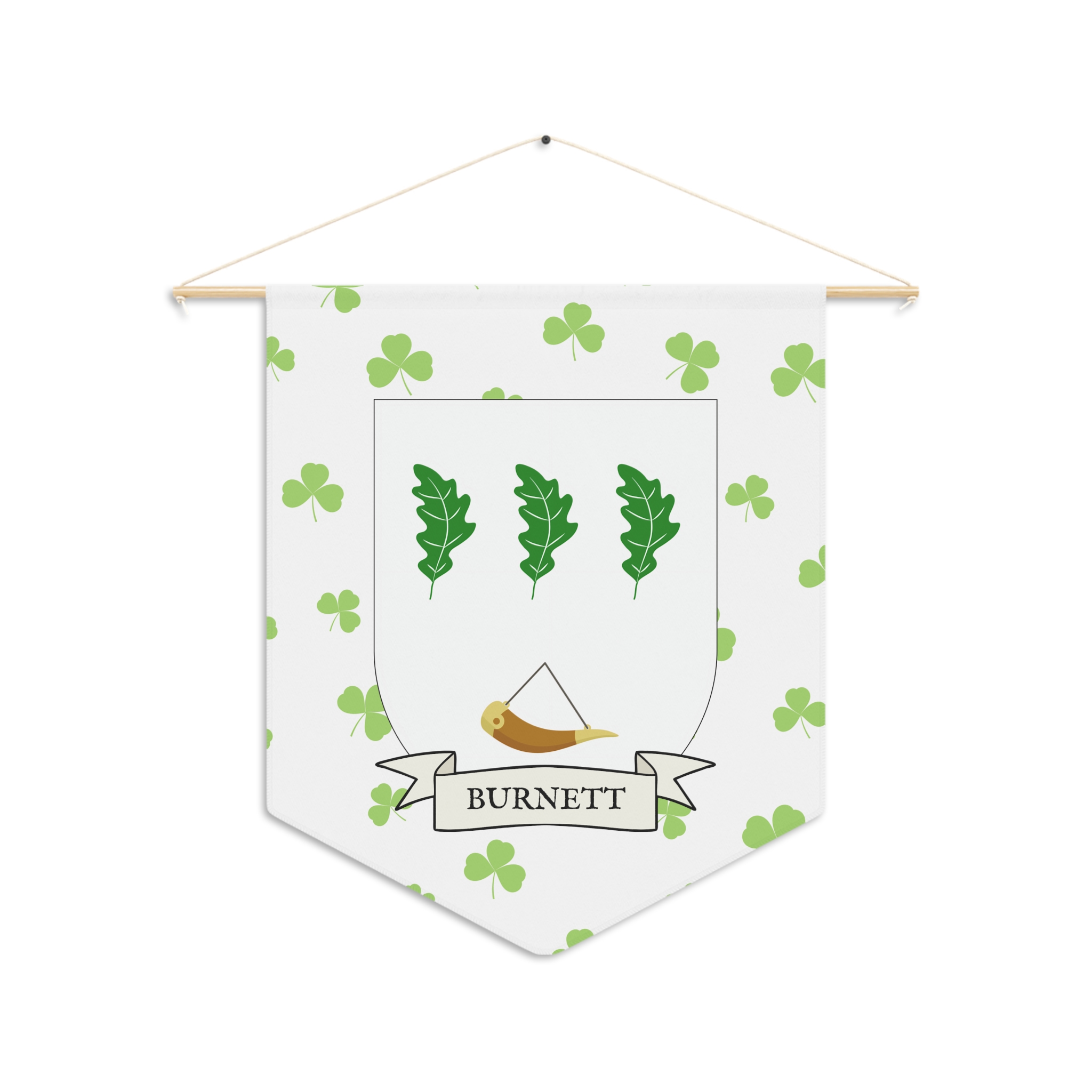 Uplift any room and show off your Irish American roots with this Burnett Family Coat of Arms Indoor Pennant. Pennant is printed on durable poly twill and comes with a wooden dowel/twine frame for easy hanging. Features your family Coat of Arms printed over a restrained shamrock patterned background.