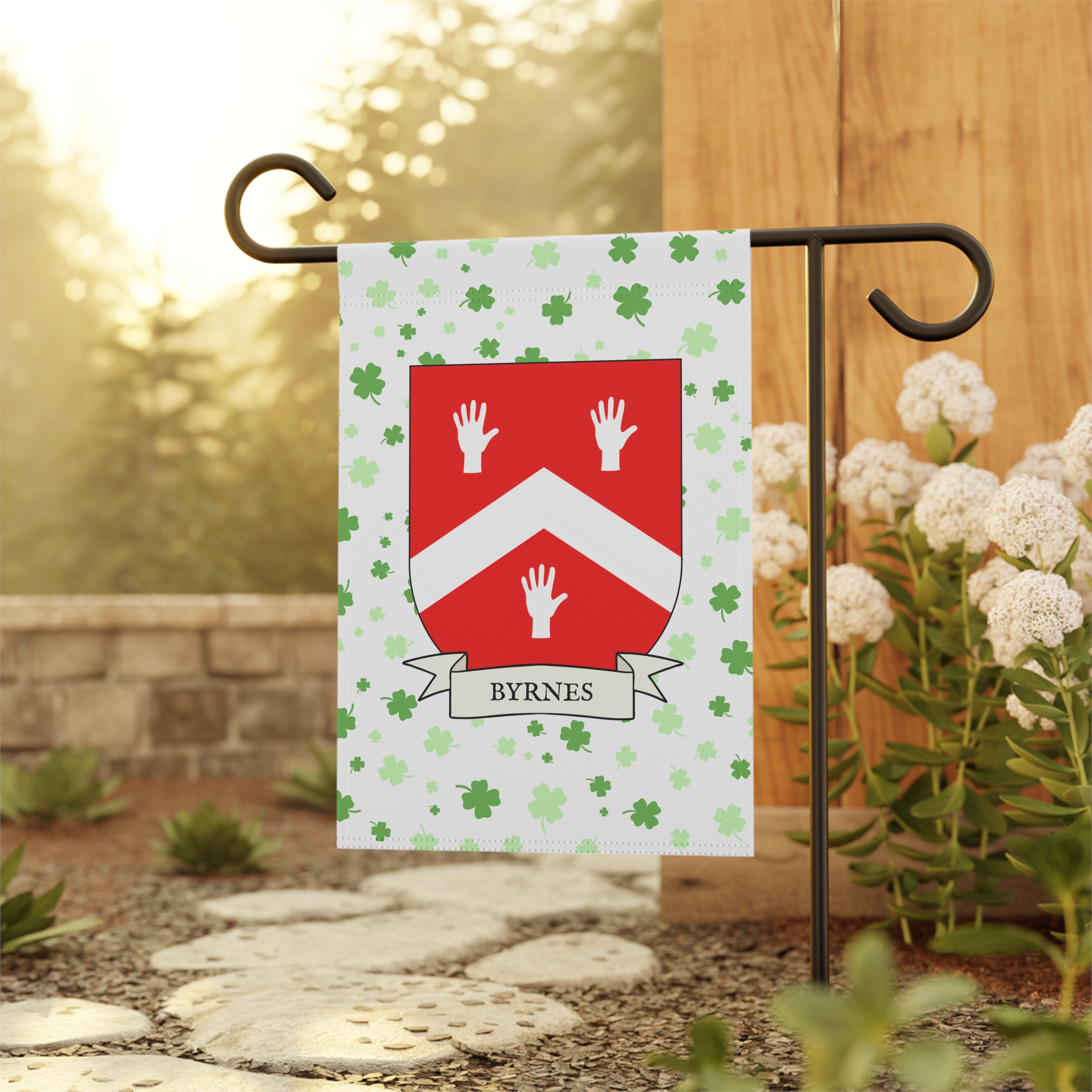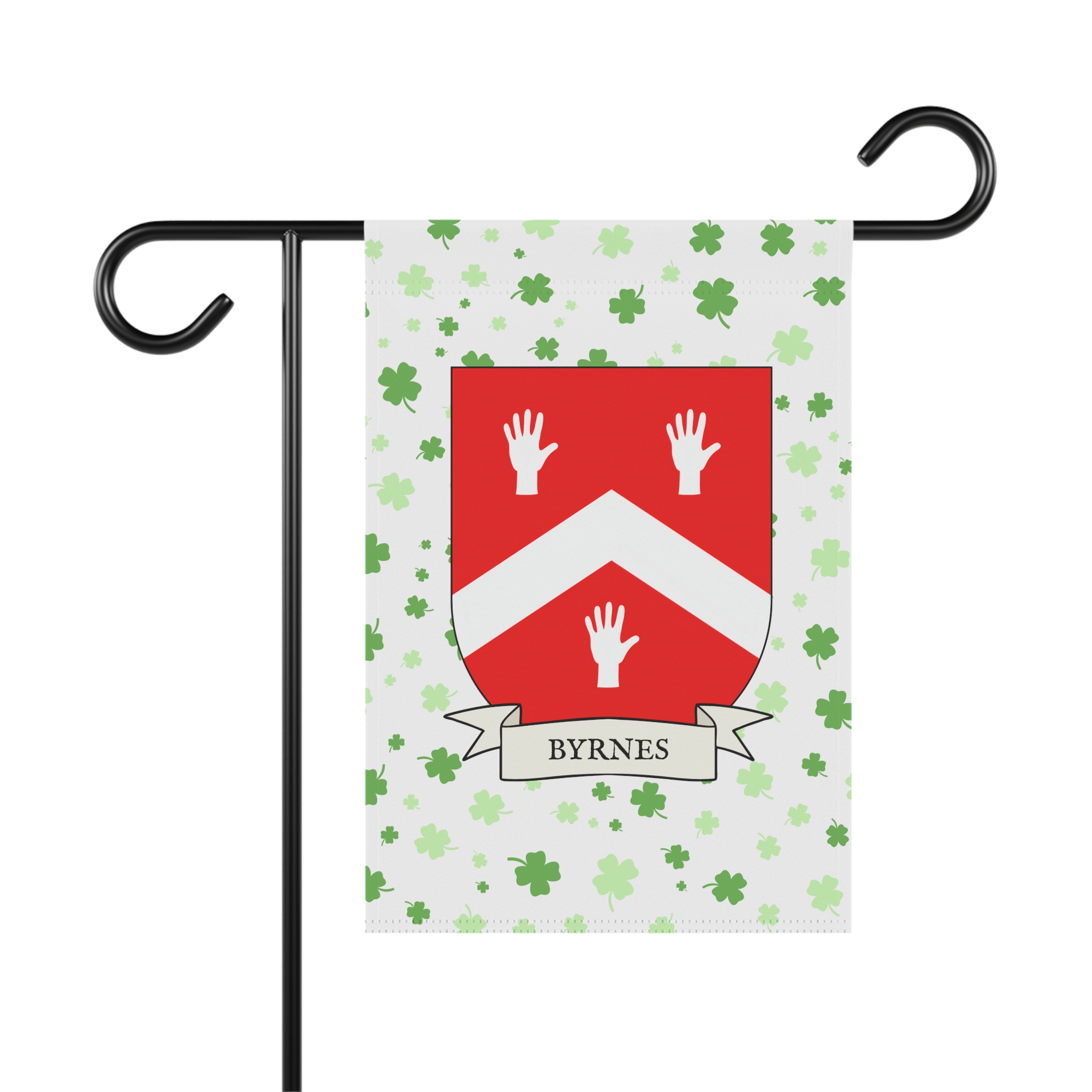 This welcoming Garden Banner will be a great addition to your garden or yard. It displays the Byrnes family Coat of Arms over a subtle background showing a field of four-leaf shamrocks. Both sides show identical images.