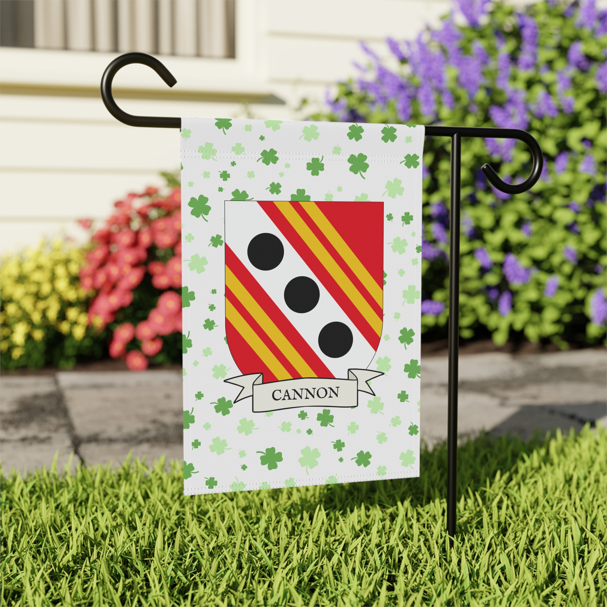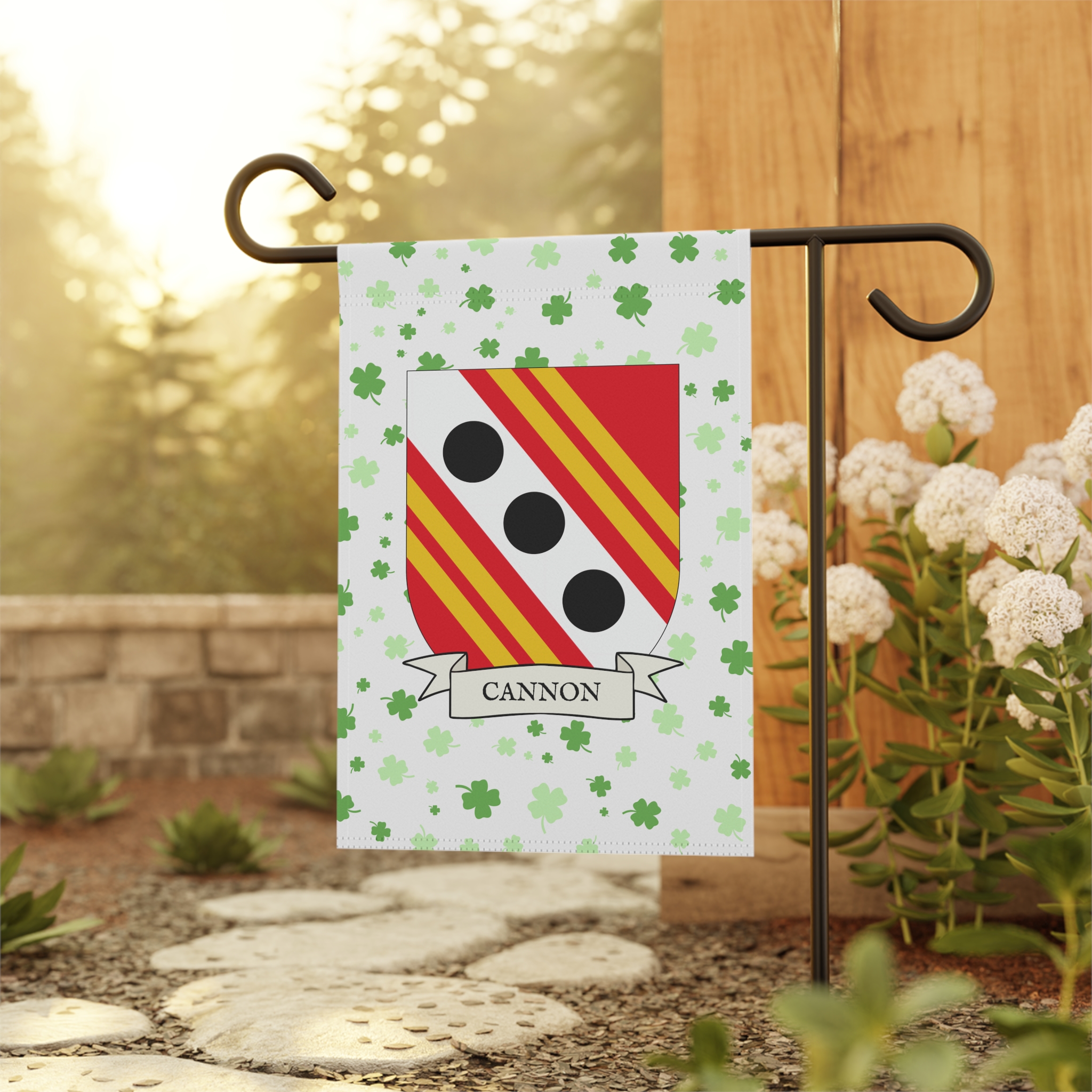 This welcoming Garden Banner will be a great addition to your garden or yard. It displays the Cannon Family Coat of Arms over a subtle background showing a field of four-leaf shamrocks. Both sides show identical images.