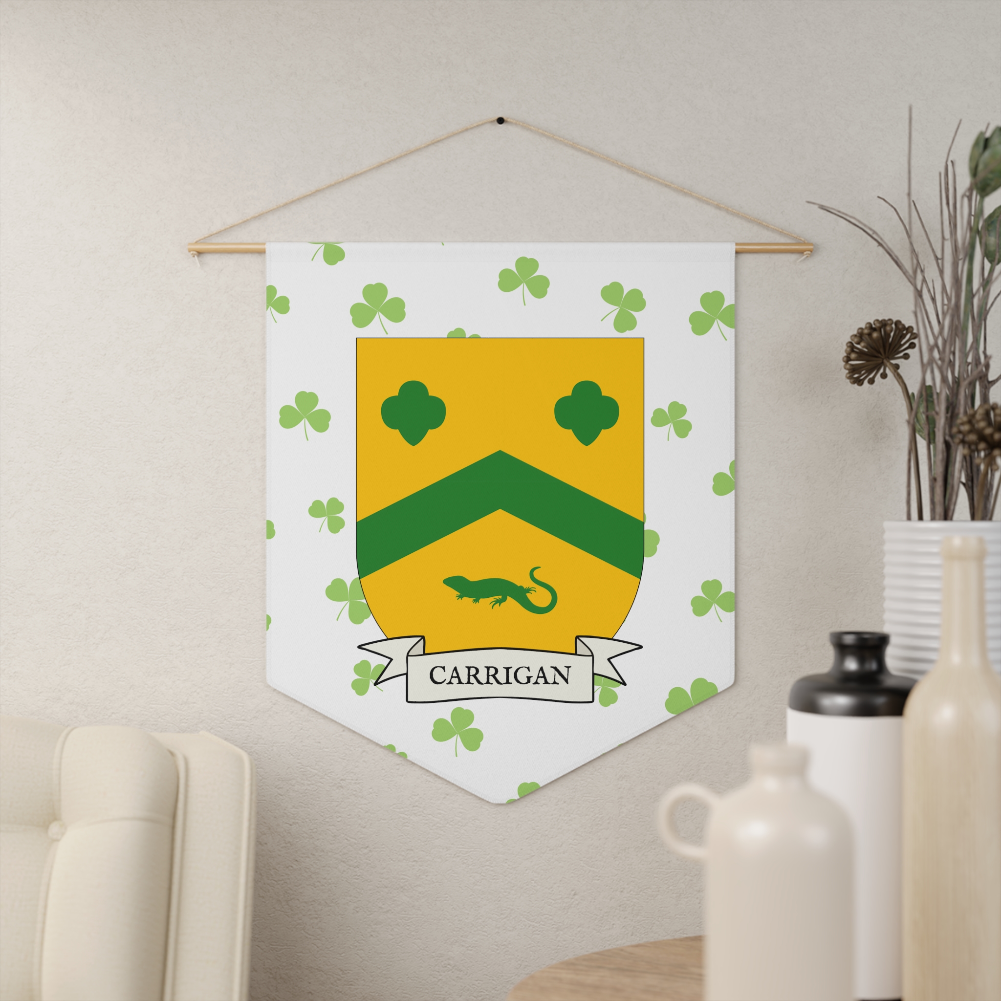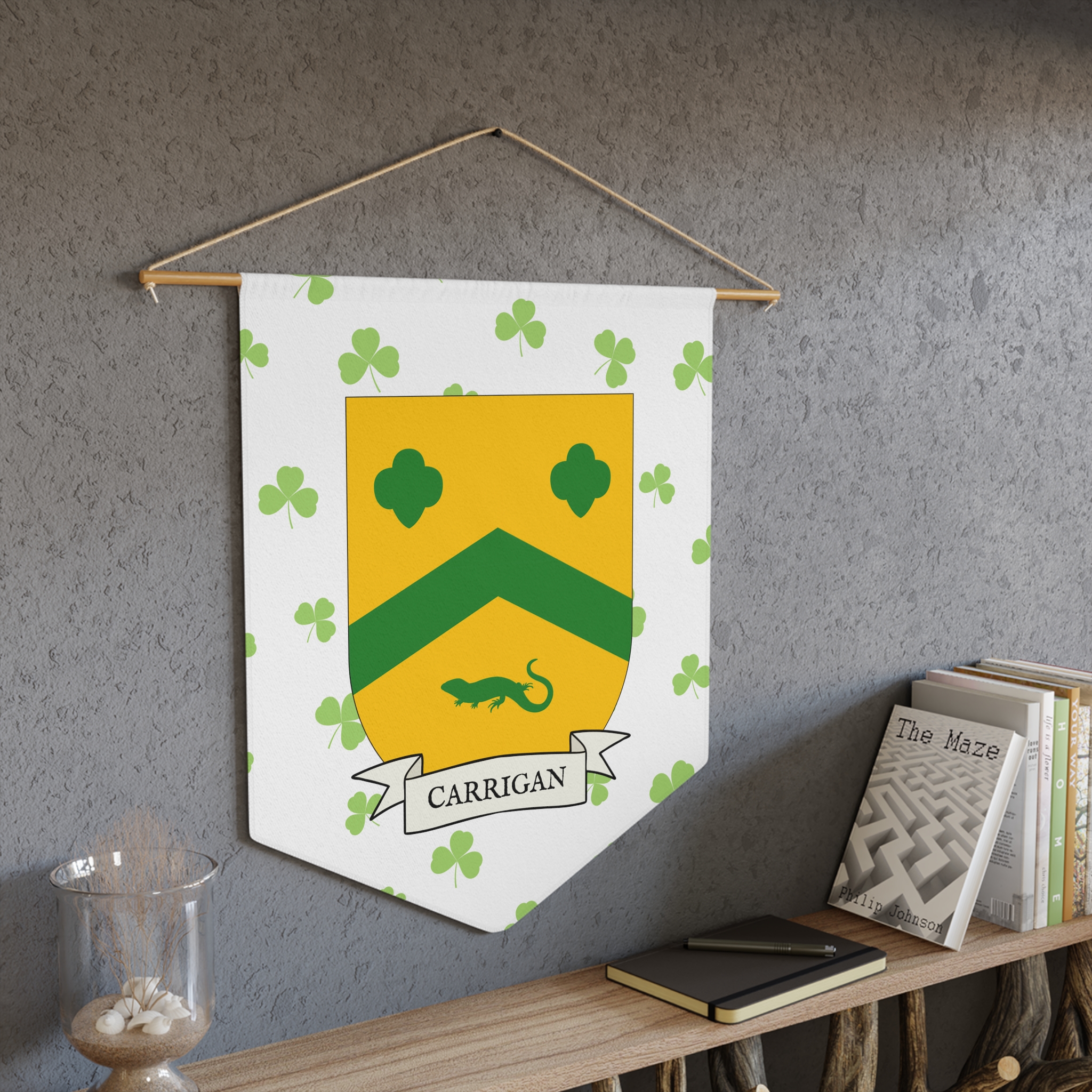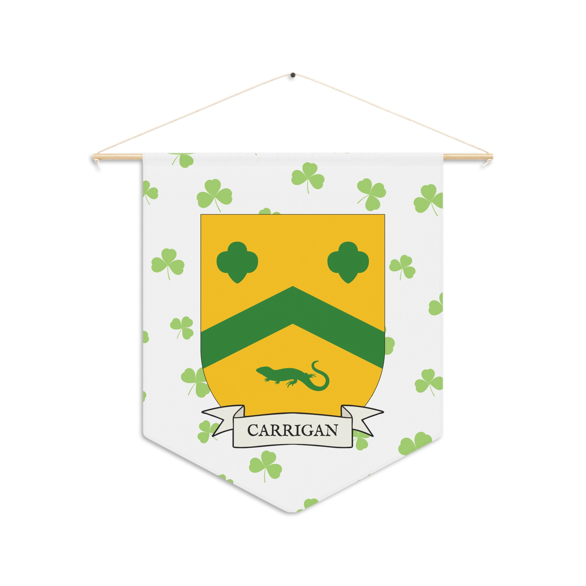 Uplift any room and show off your Irish American roots with this Carrigan Family Coat of Arms Indoor Pennant. Pennant is printed on durable poly twill and comes with a wooden dowel/twine frame for easy hanging. Features your family Coat of Arms printed over a restrained shamrock patterned background.