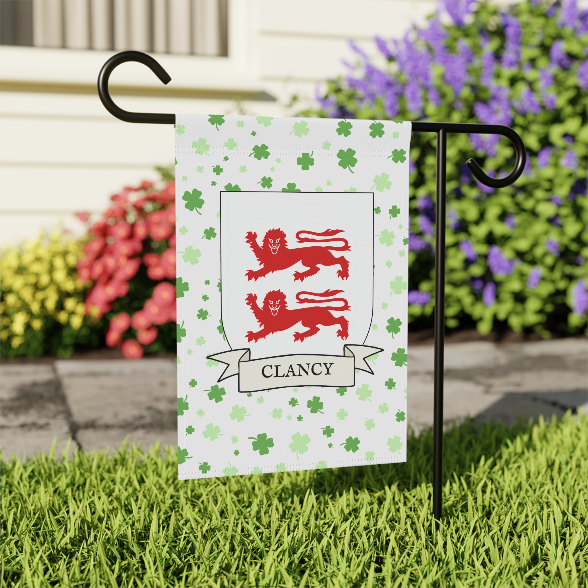 This welcoming Garden Banner will be a great addition to your garden or yard. It displays the Clancy Family Coat of Arms over a subtle background showing a field of four-leaf shamrocks. Both sides show identical images.