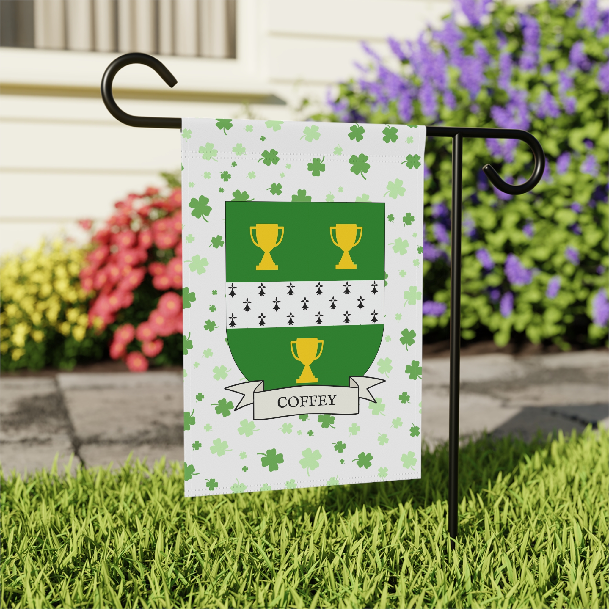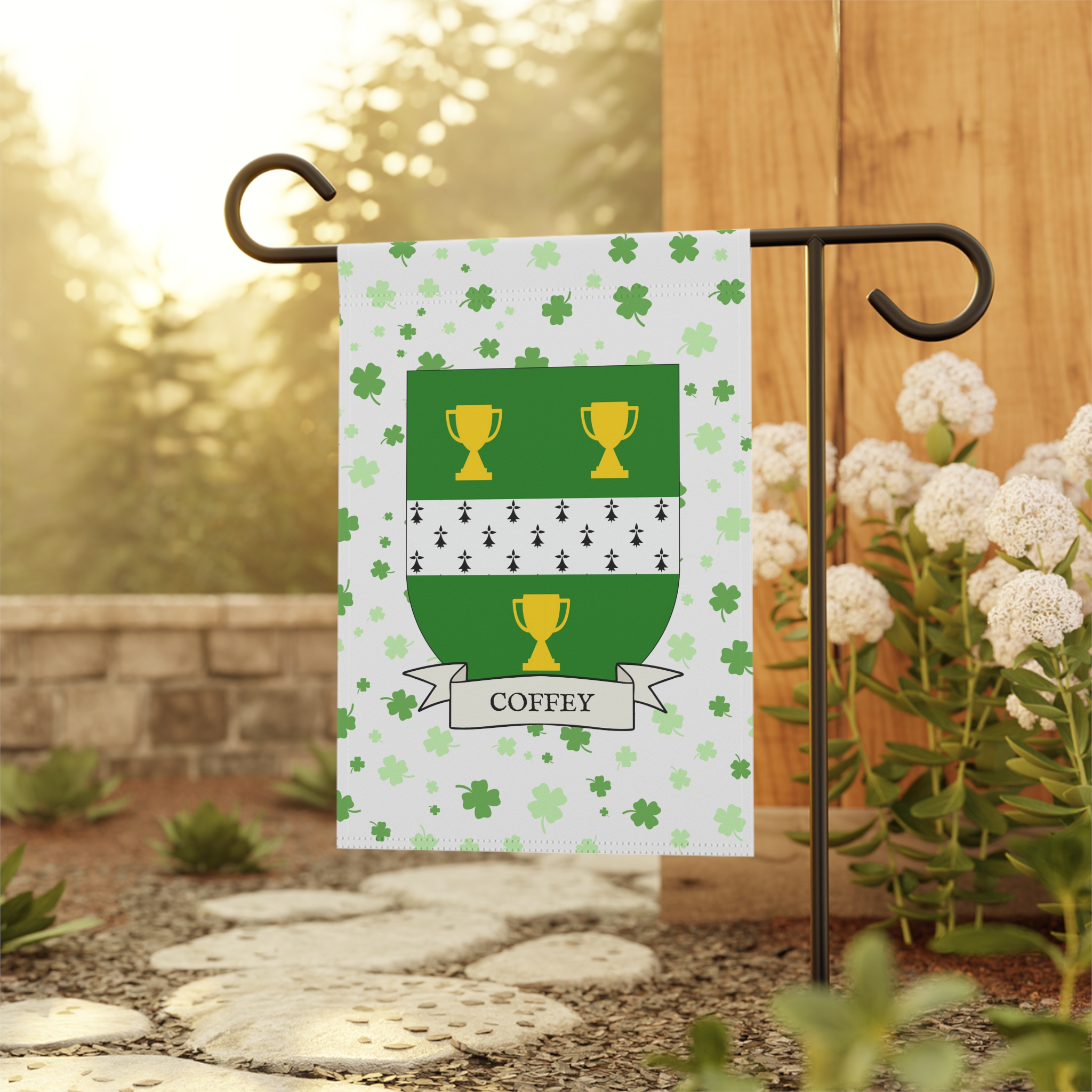 This welcoming Garden Banner will be a great addition to your garden or yard. It displays the Coffey Family Coat of Arms over a subtle background showing a field of four-leaf shamrocks. Both sides show identical images.