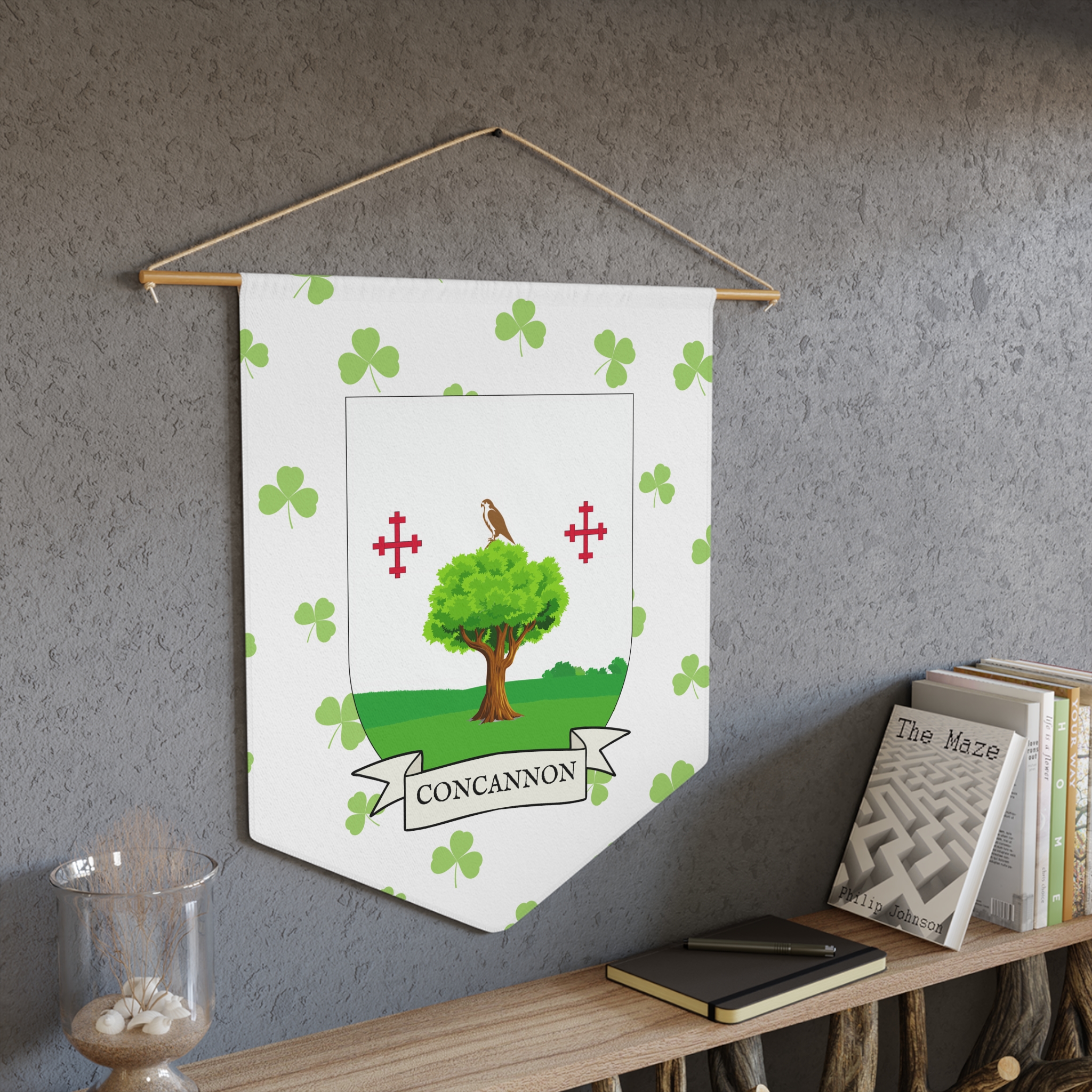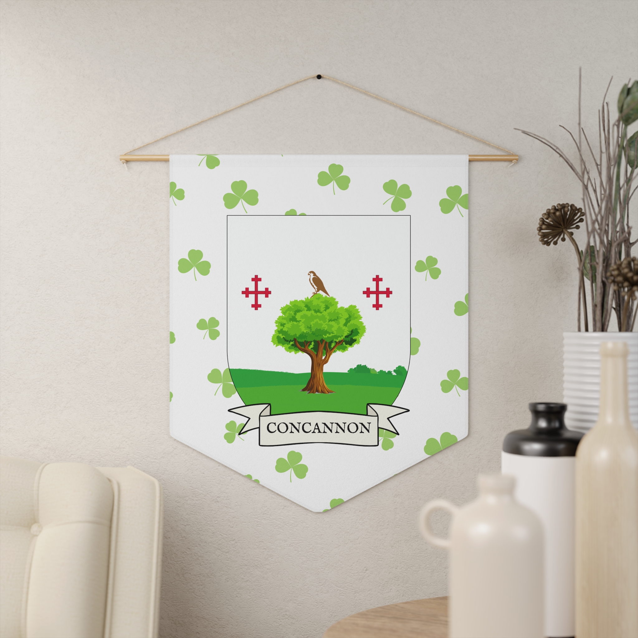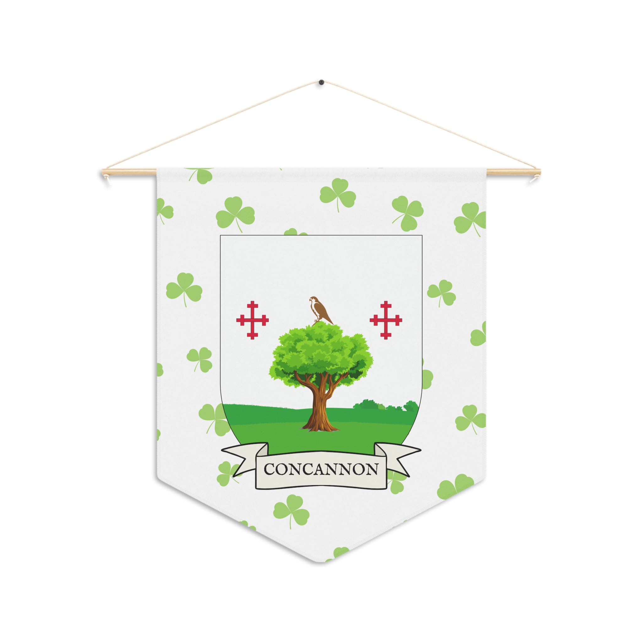Uplift any room and show off your Irish American roots with this Concannon Family Coat of Arms Indoor Pennant. Pennant is printed on durable poly twill and comes with a wooden dowel/twine frame for easy hanging. Features your family’s Coat of Arms printed over a restrained shamrock patterned background.