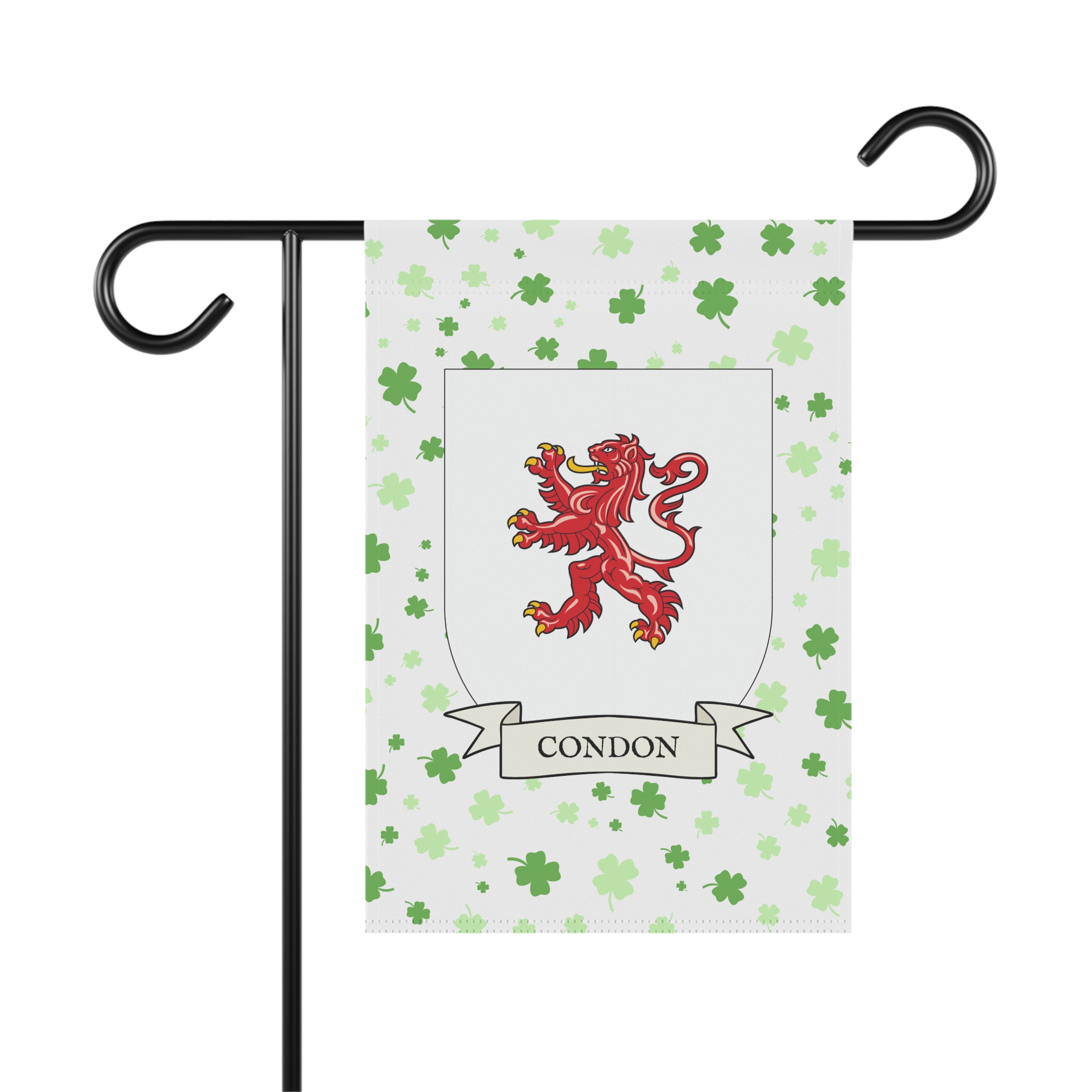 This welcoming Garden Banner will be a great addition to your garden or yard. It displays the Condon Family Coat of Arms over a subtle background showing a field of four-leaf shamrocks. Both sides show identical images.