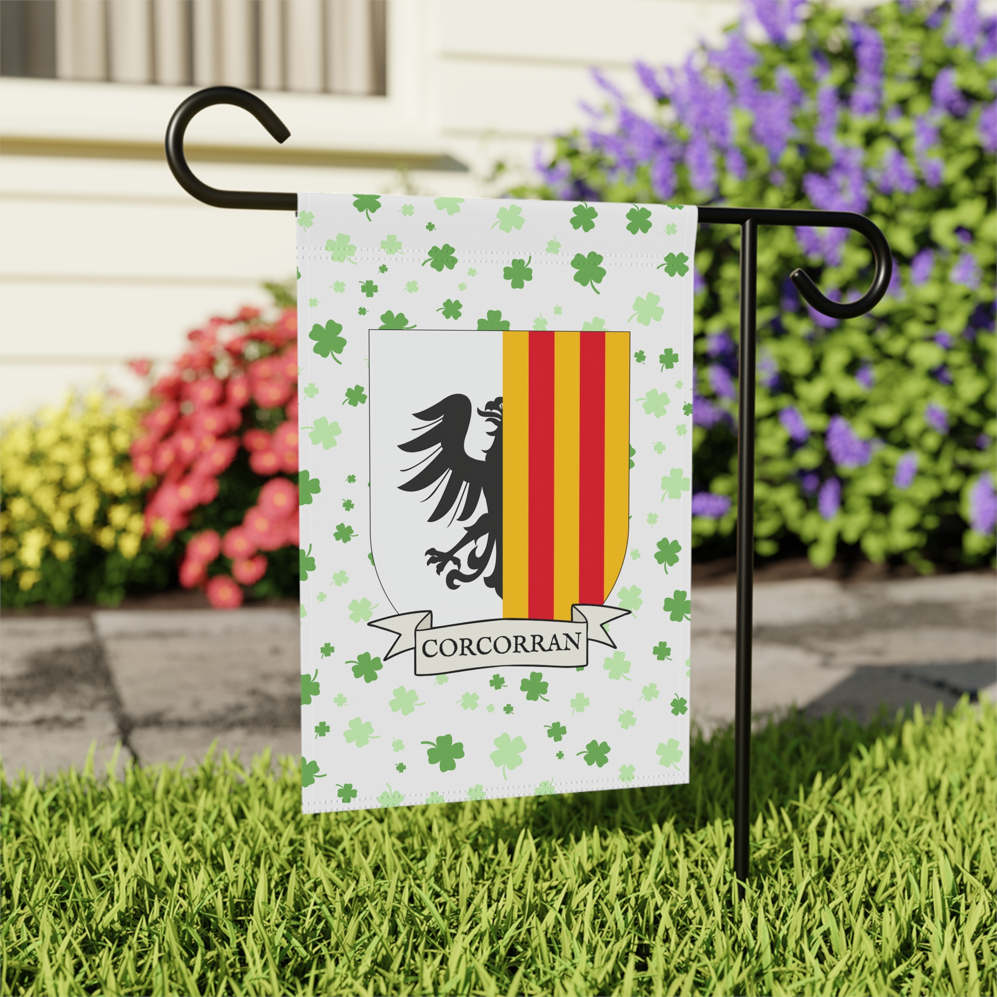 This welcoming Garden Banner will be a great addition to your garden or yard. It displays the Corcorran Family Coat of Arms over a subtle background showing a field of four-leaf shamrocks. Both sides show identical images.