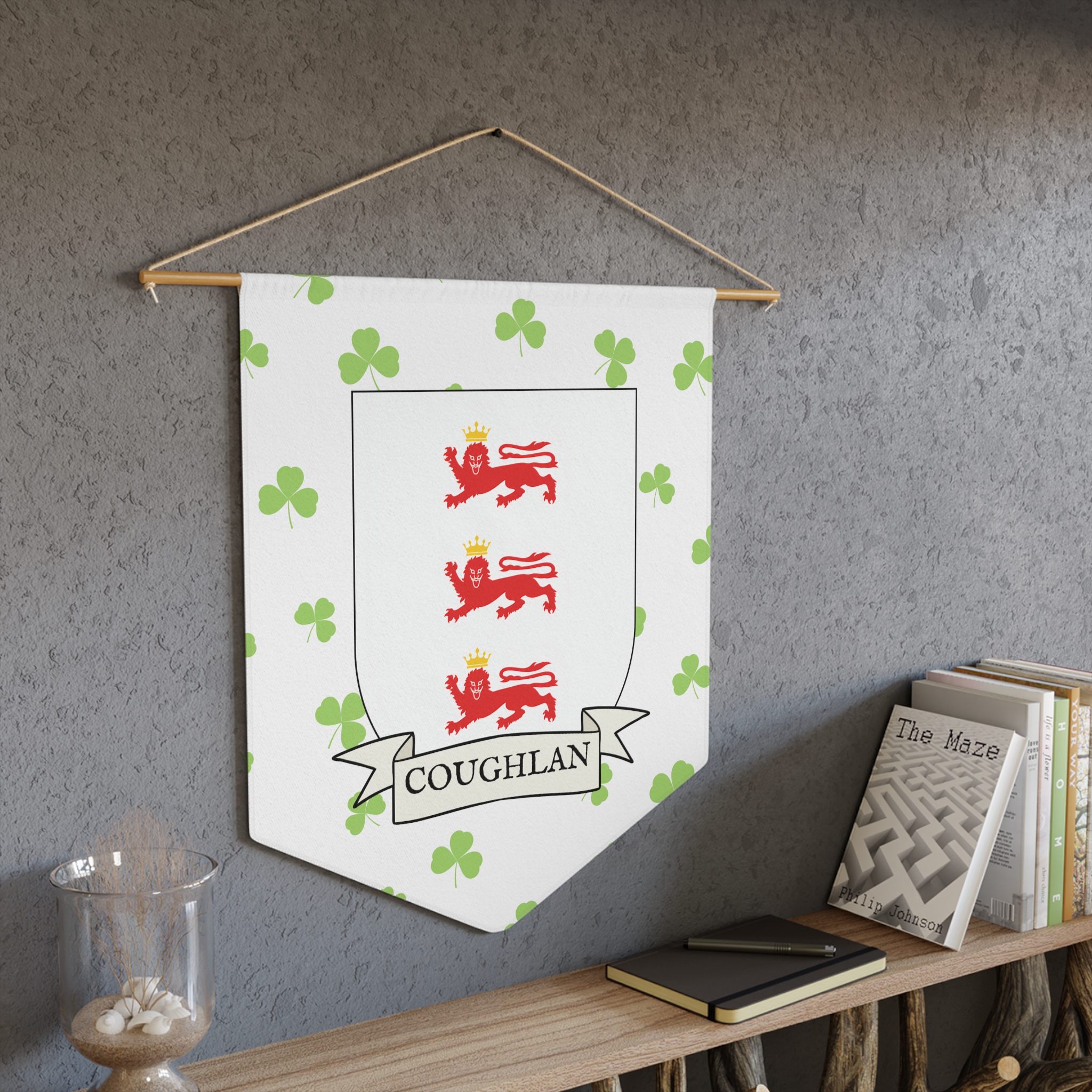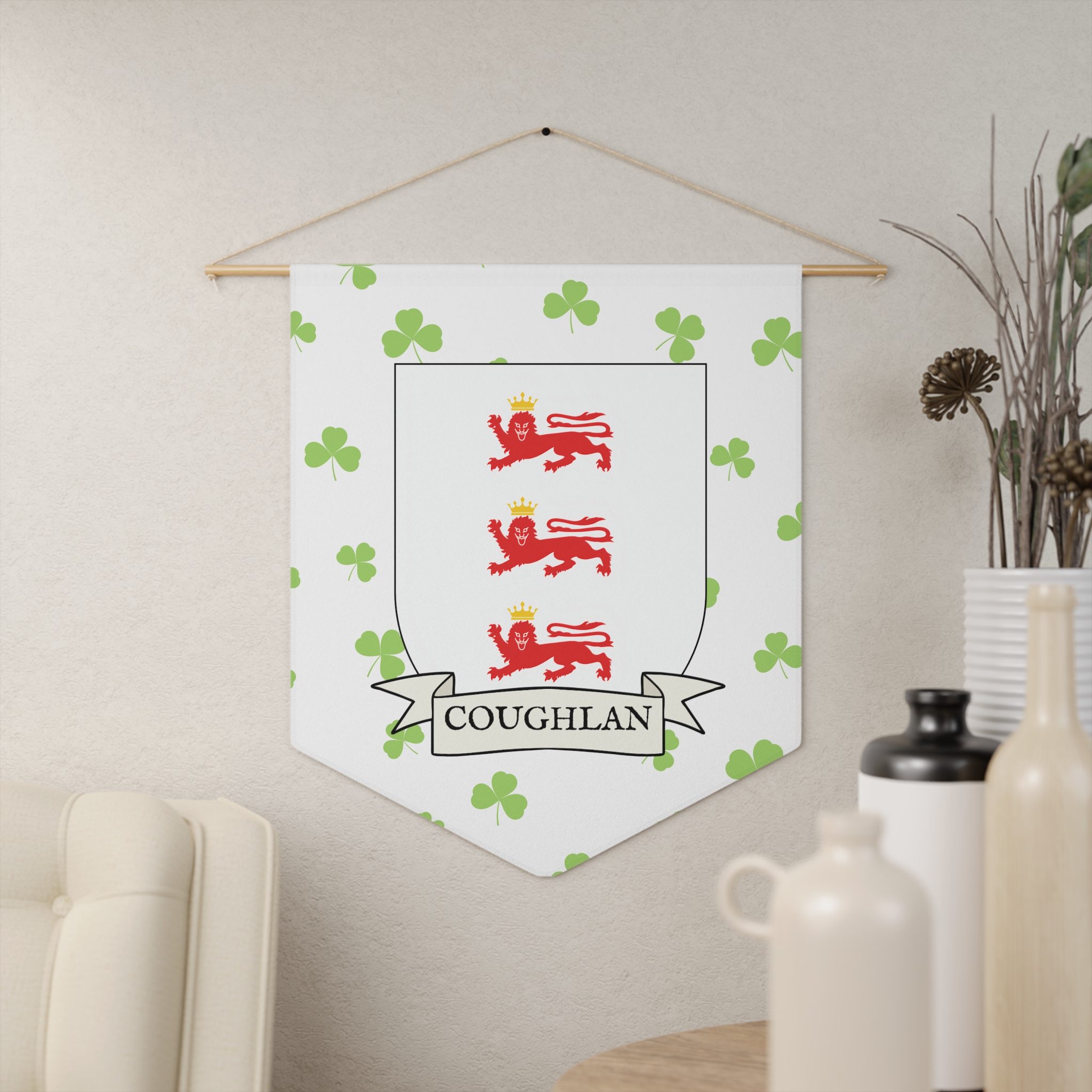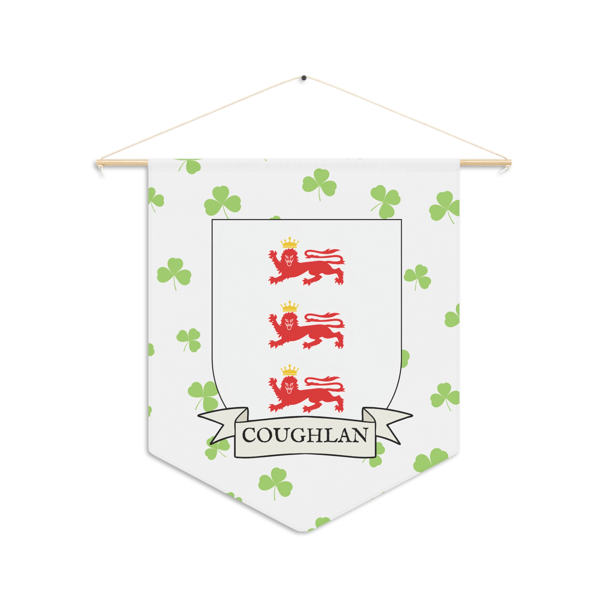 Uplift any room and show off your Irish American roots with this Coughlan Family Coat of Arms Indoor Pennant. Pennant is printed on durable poly twill and comes with a wooden dowel/twine frame for easy hanging. Features your family’s Coat of Arms printed over a restrained shamrock patterned background.