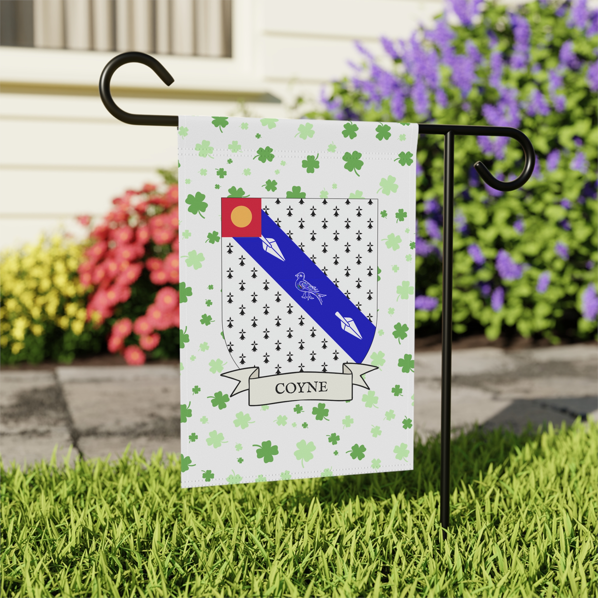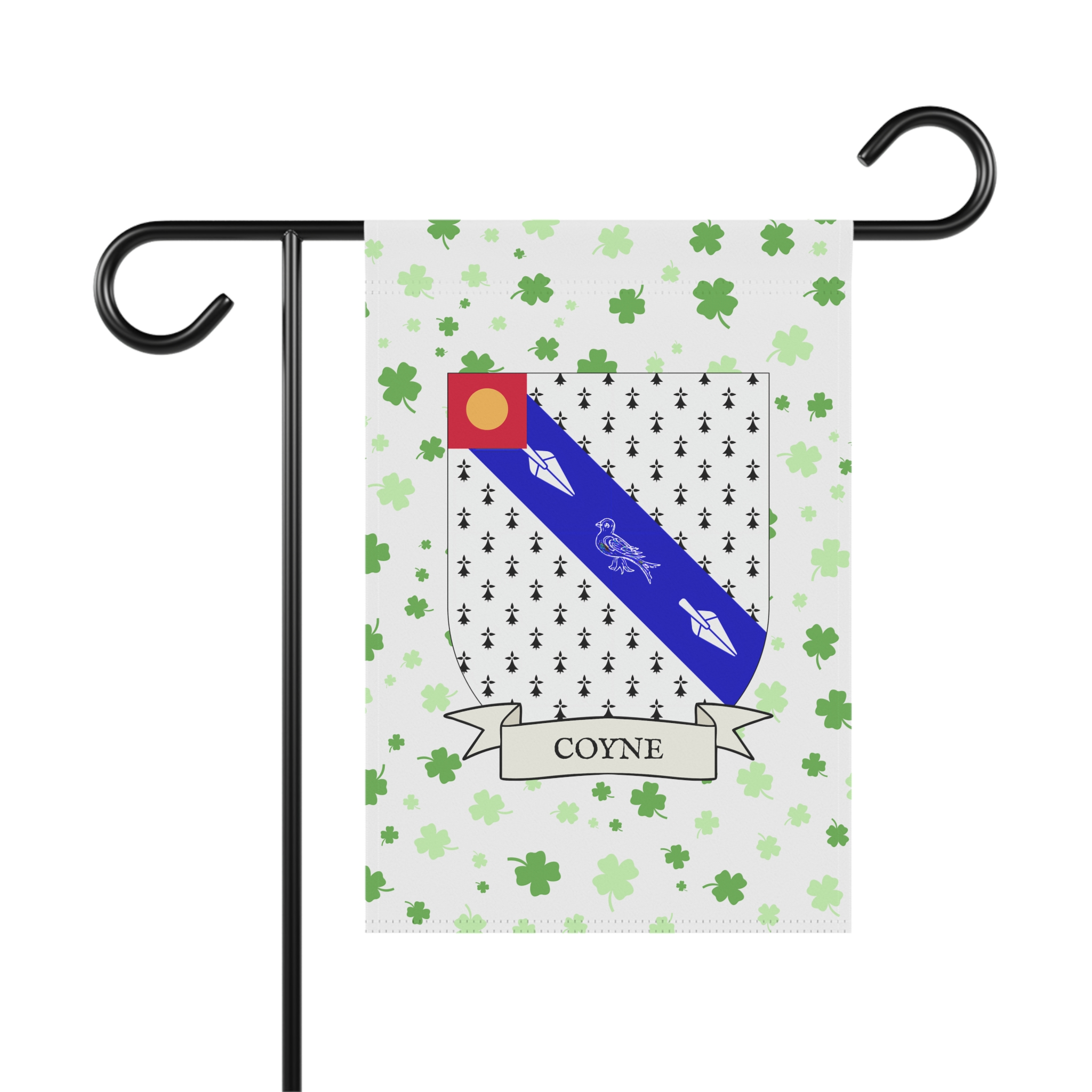 This welcoming Garden Banner will be a great addition to your garden or yard. It displays the Coyne Family Coat of Arms over a subtle background showing a field of four-leaf shamrocks. Both sides show identical images.