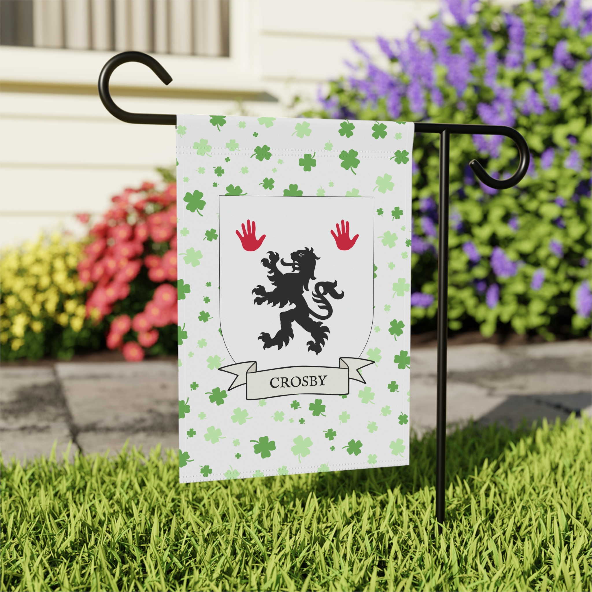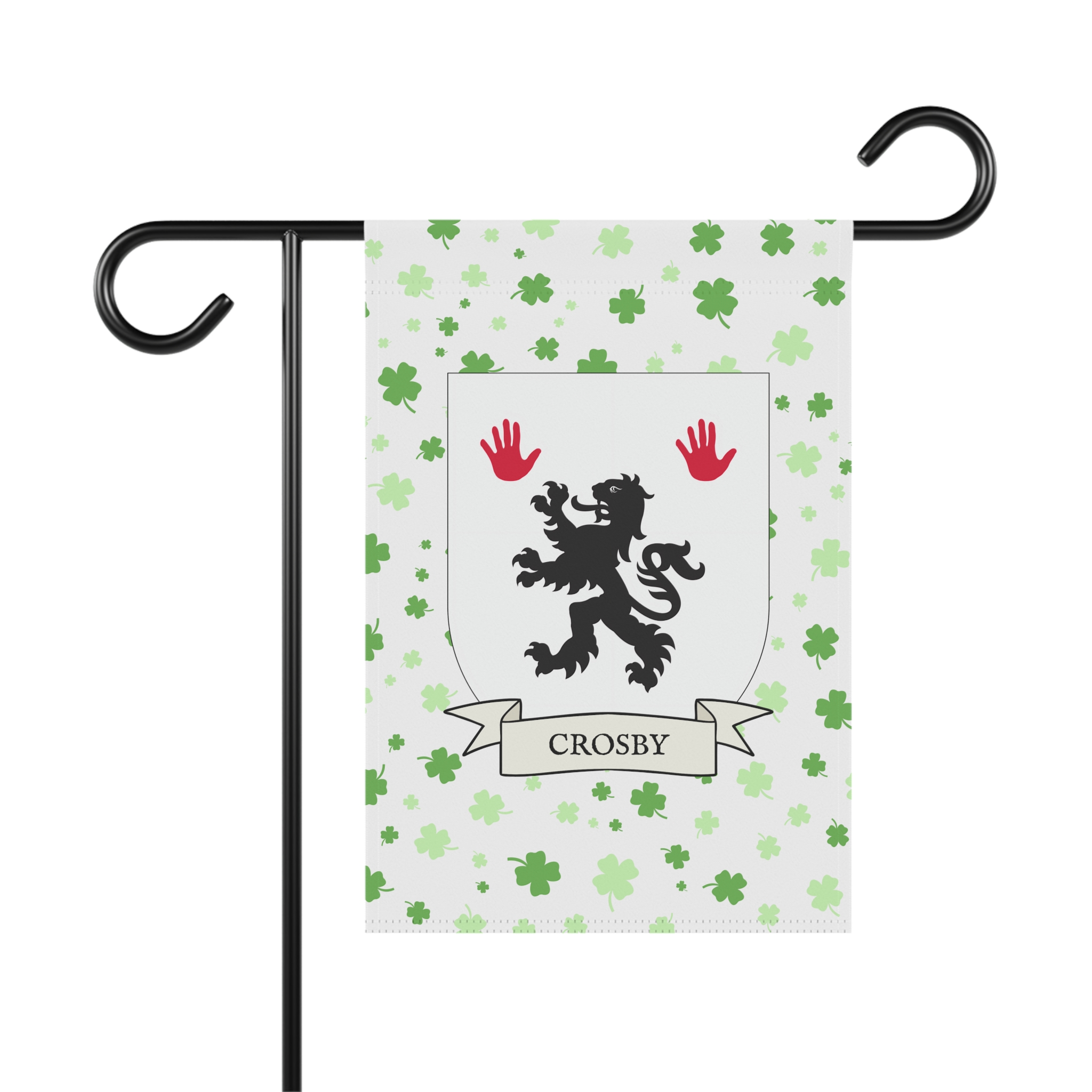 This welcoming Garden Banner will be a great addition to your garden or yard. It displays the Crosby Family Coat of Arms over a subtle background showing a field of four-leaf shamrocks. Both sides show identical images.
