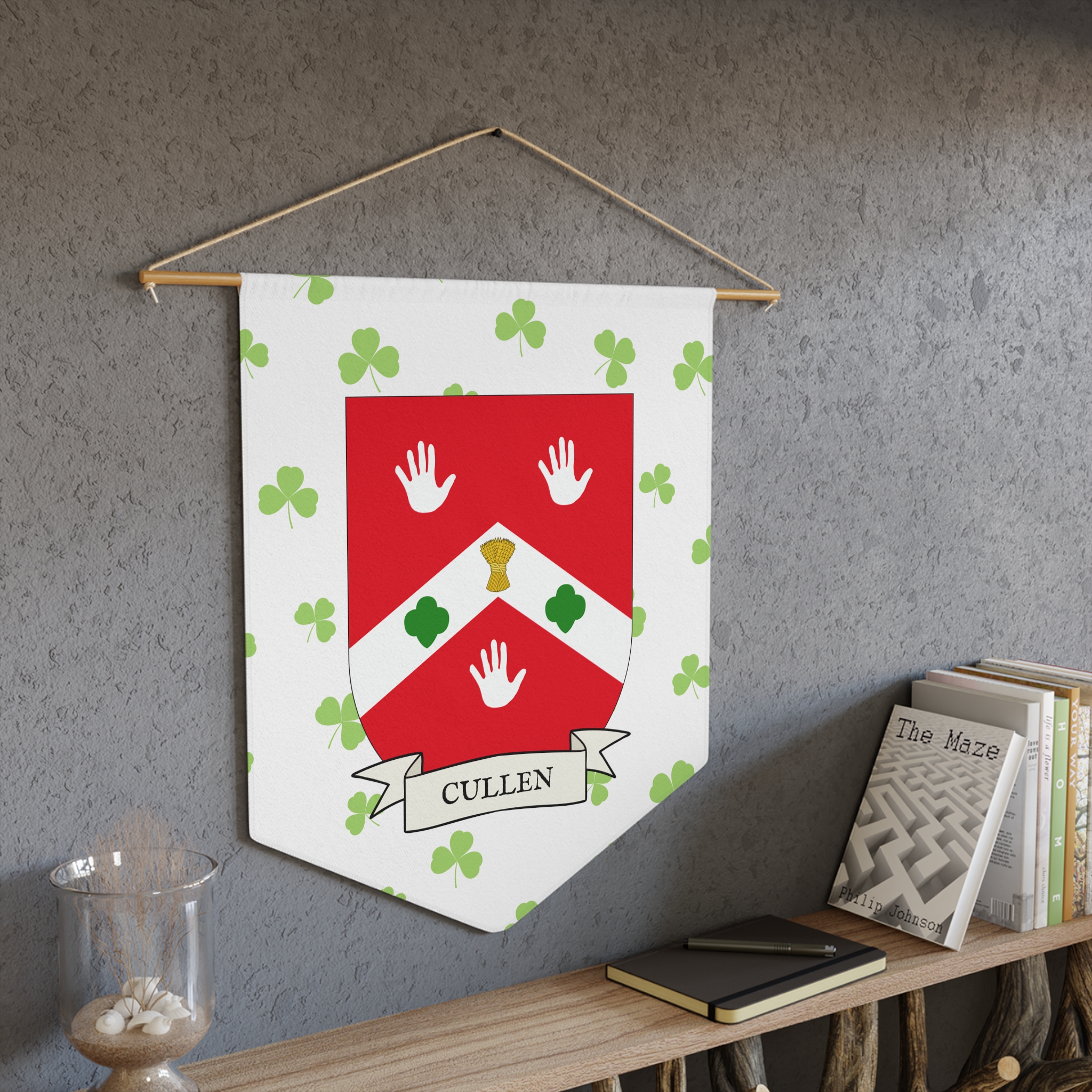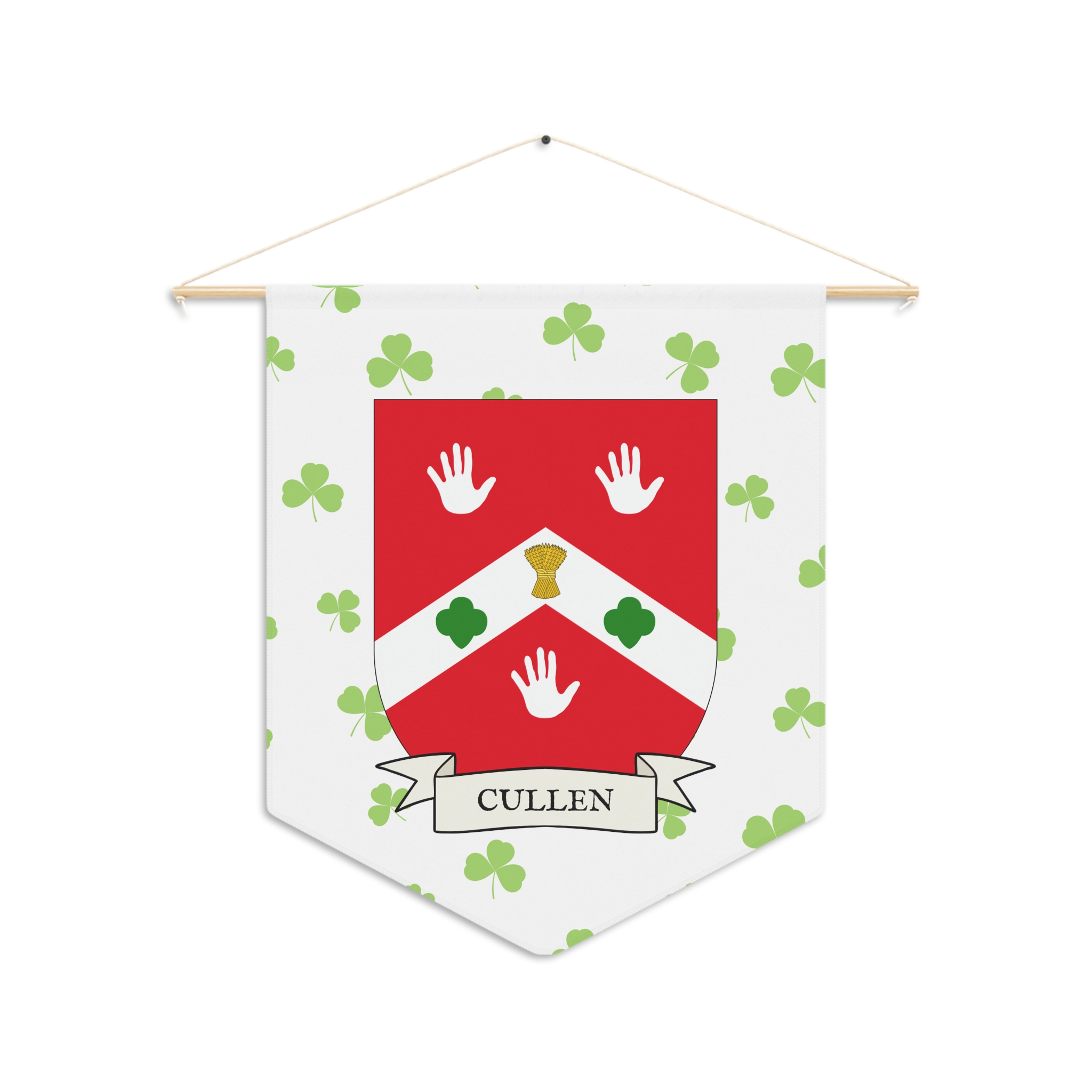 Uplift any room and show off your Irish American roots with this Cullen Family Coat of Arms Indoor Pennant. Pennant is printed on durable poly twill and comes with a wooden dowel/twine frame for easy hanging. Features your family’s Coat of Arms printed over a restrained shamrock patterned background.