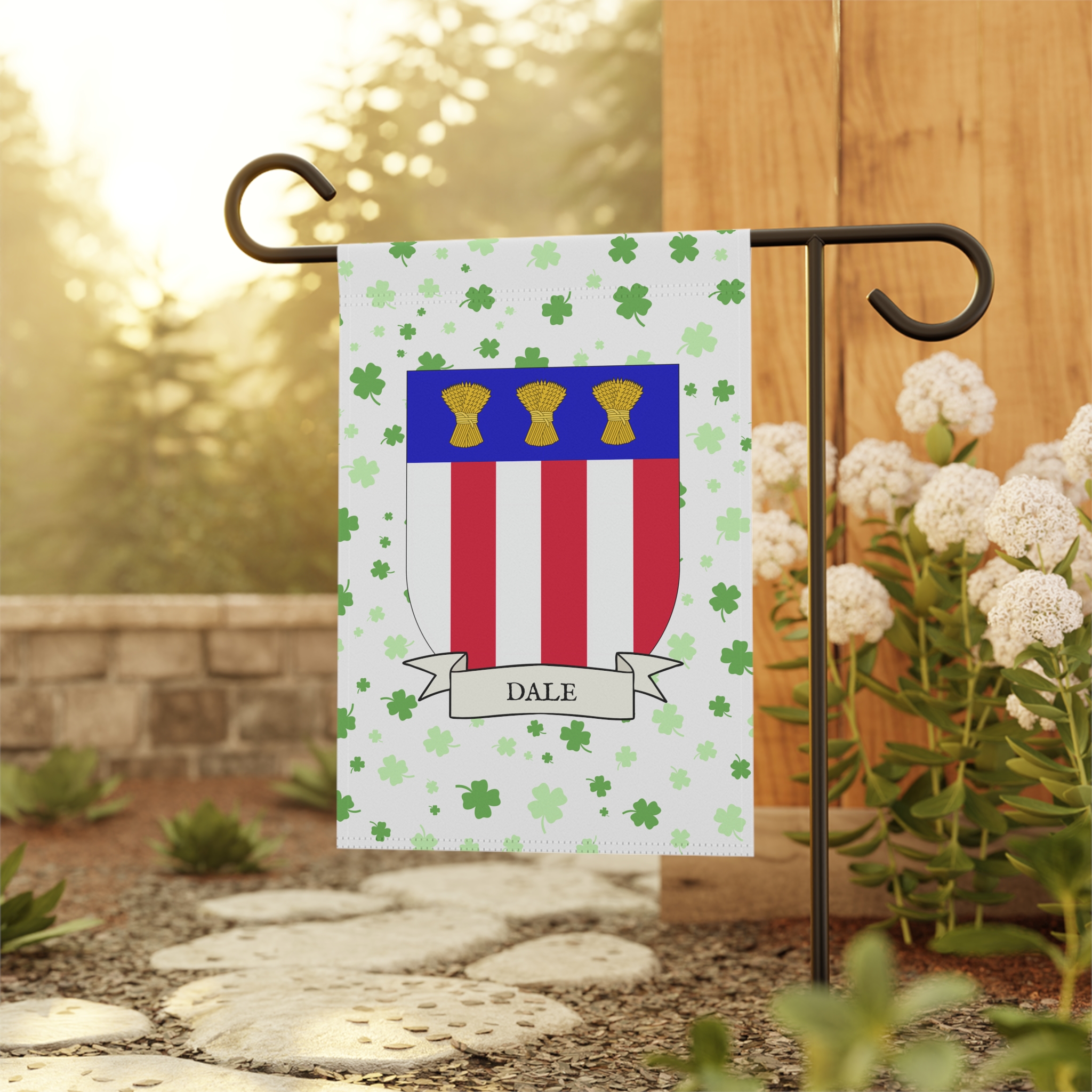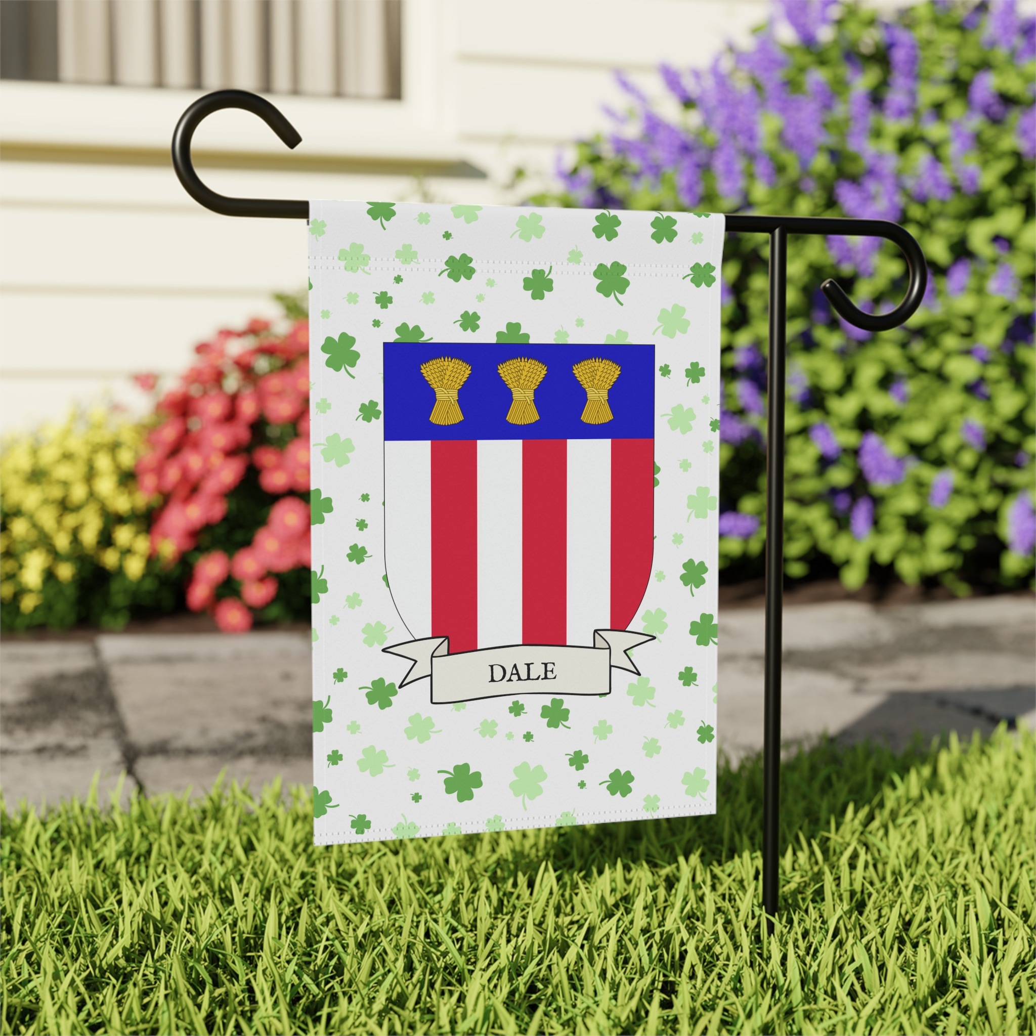 This welcoming Garden Banner will be a great addition to your garden or yard. It displays the Dale Family Coat of Arms over a subtle background showing a field of four-leaf shamrocks. Both sides show identical images.
