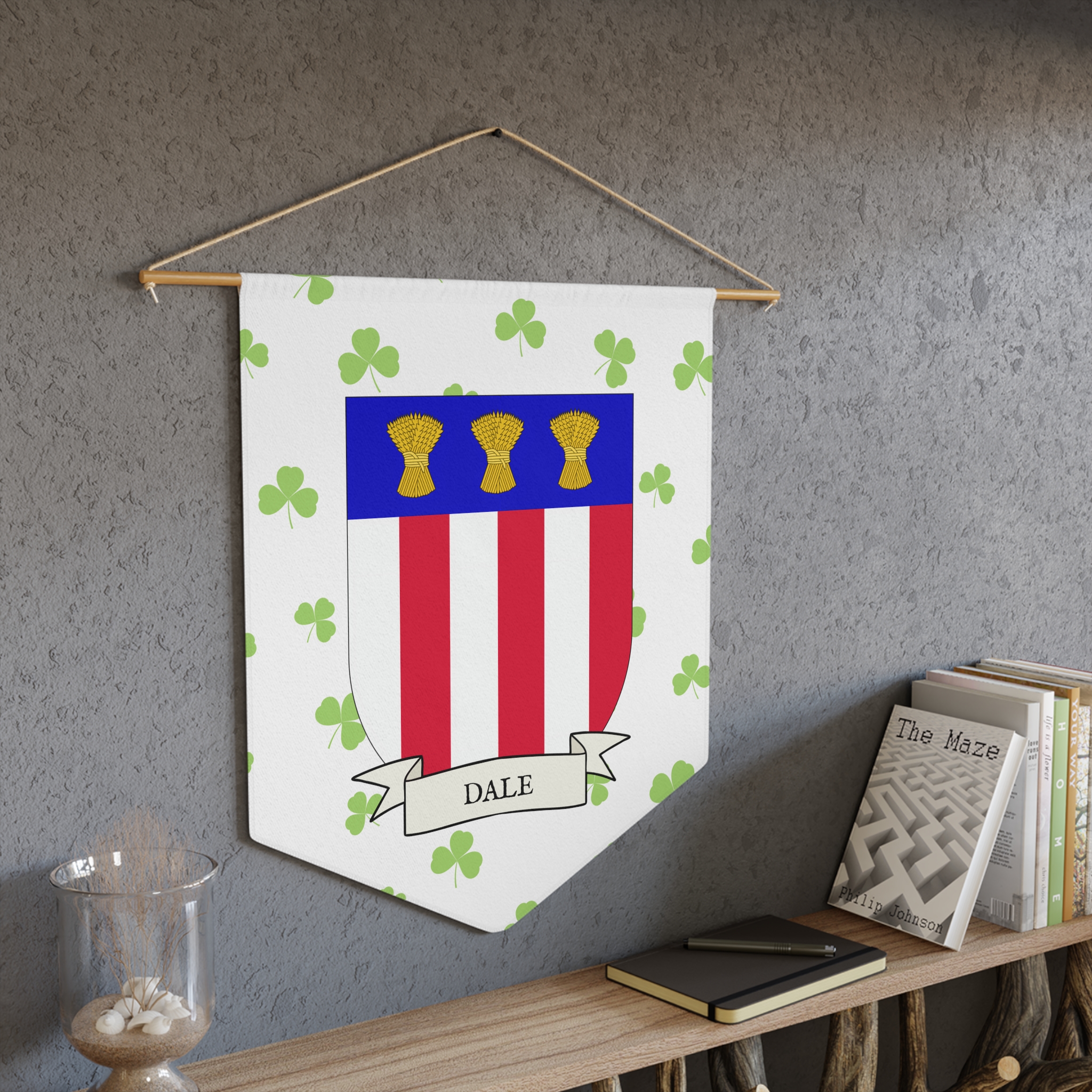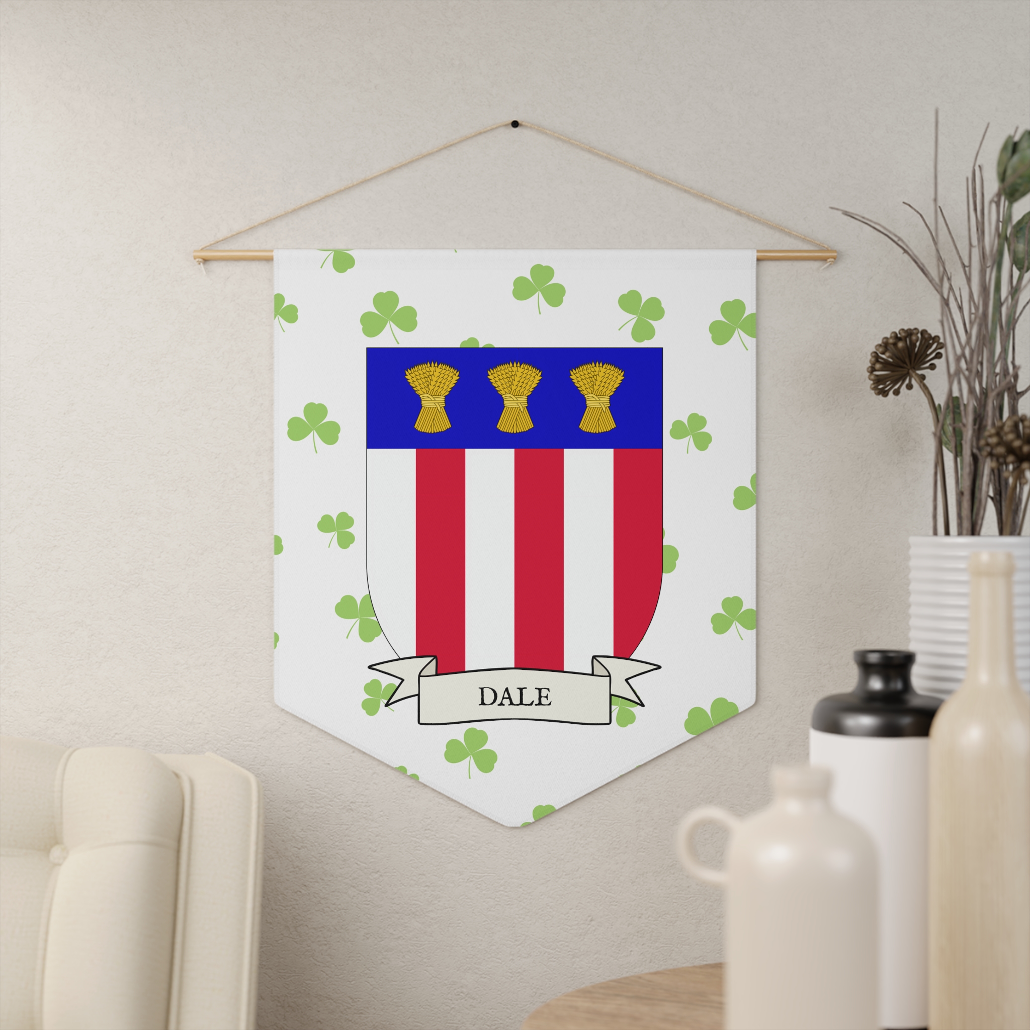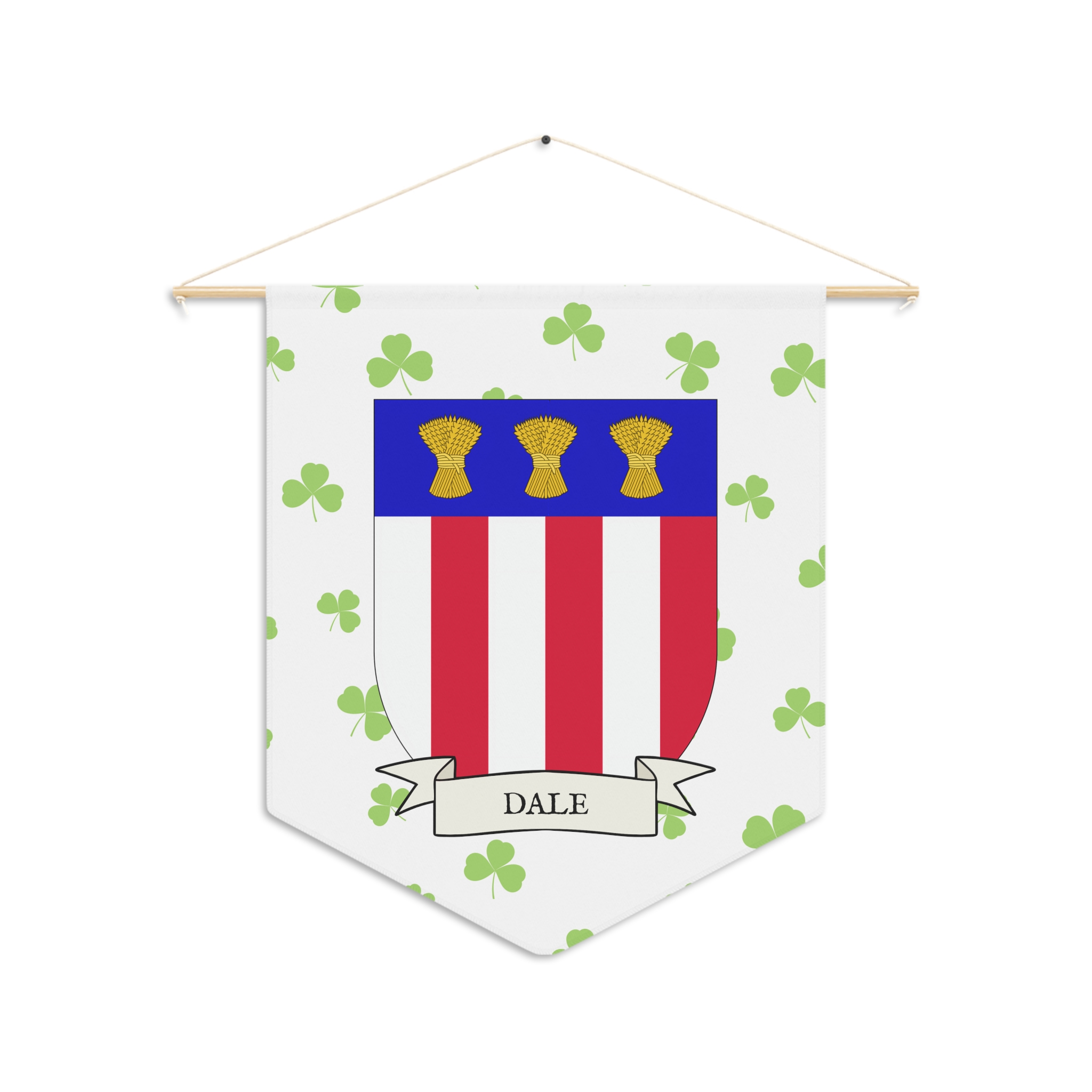Uplift any room and show off your Irish American roots with this Dale Family Coat of Arms Indoor Pennant. Pennant is printed on durable poly twill and comes with a wooden dowel/twine frame for easy hanging. Features your family’s Coat of Arms printed over a restrained shamrock patterned background.