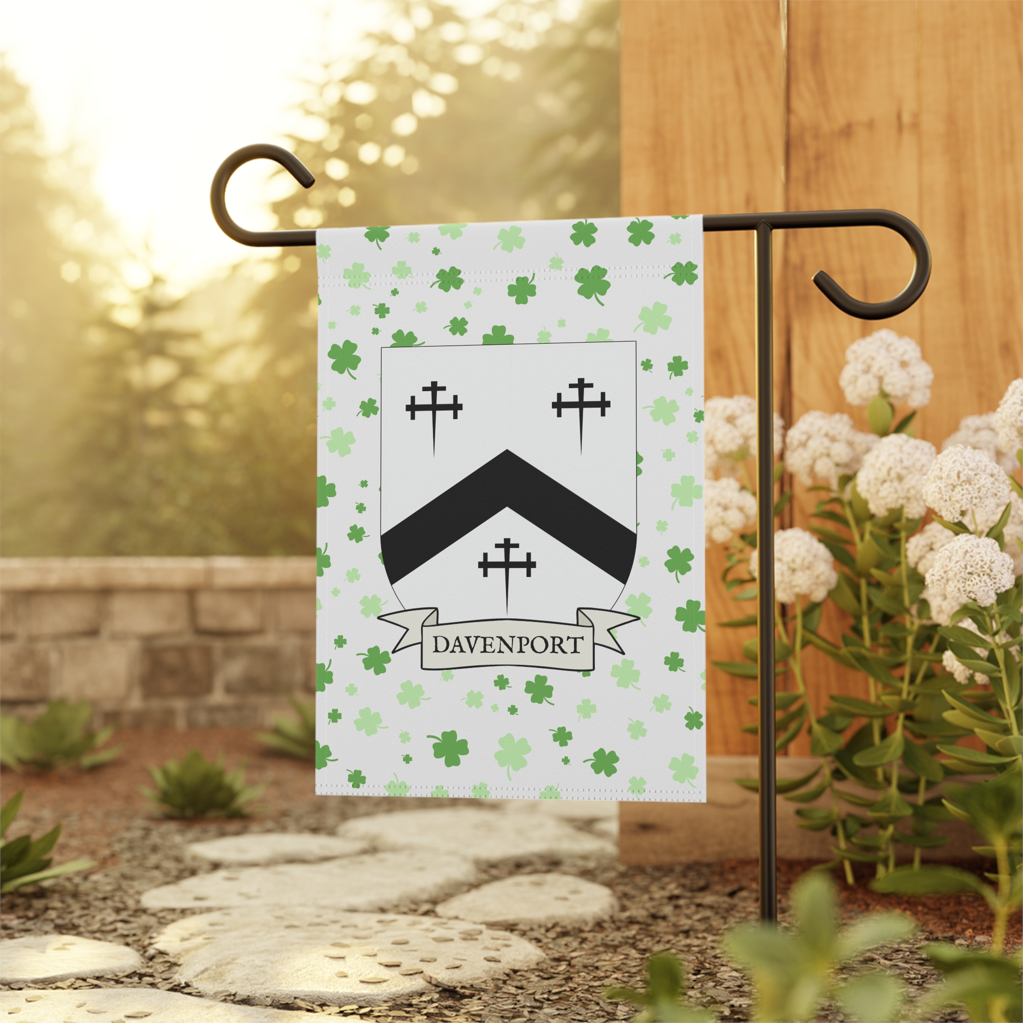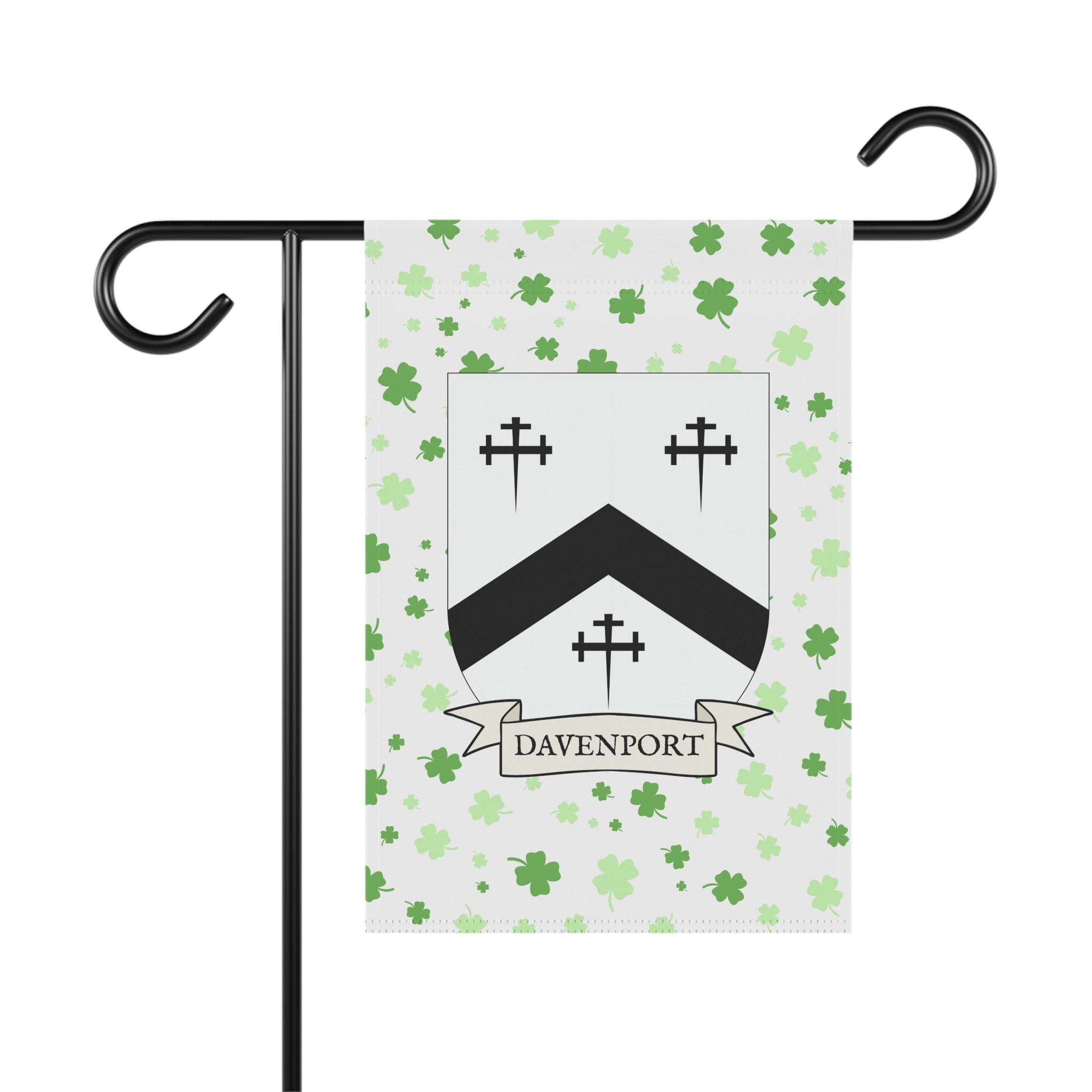 This welcoming Garden Banner will be a great addition to your garden or yard. It displays the Davenport Family Coat of Arms over a subtle background showing a field of four-leaf shamrocks. Both sides show identical images.