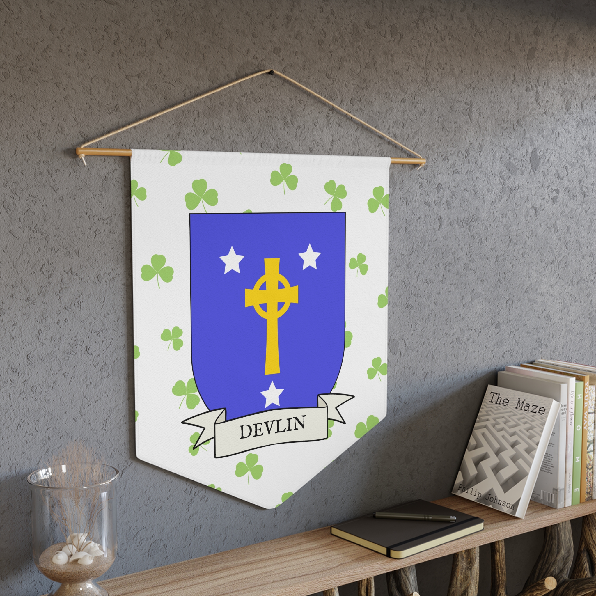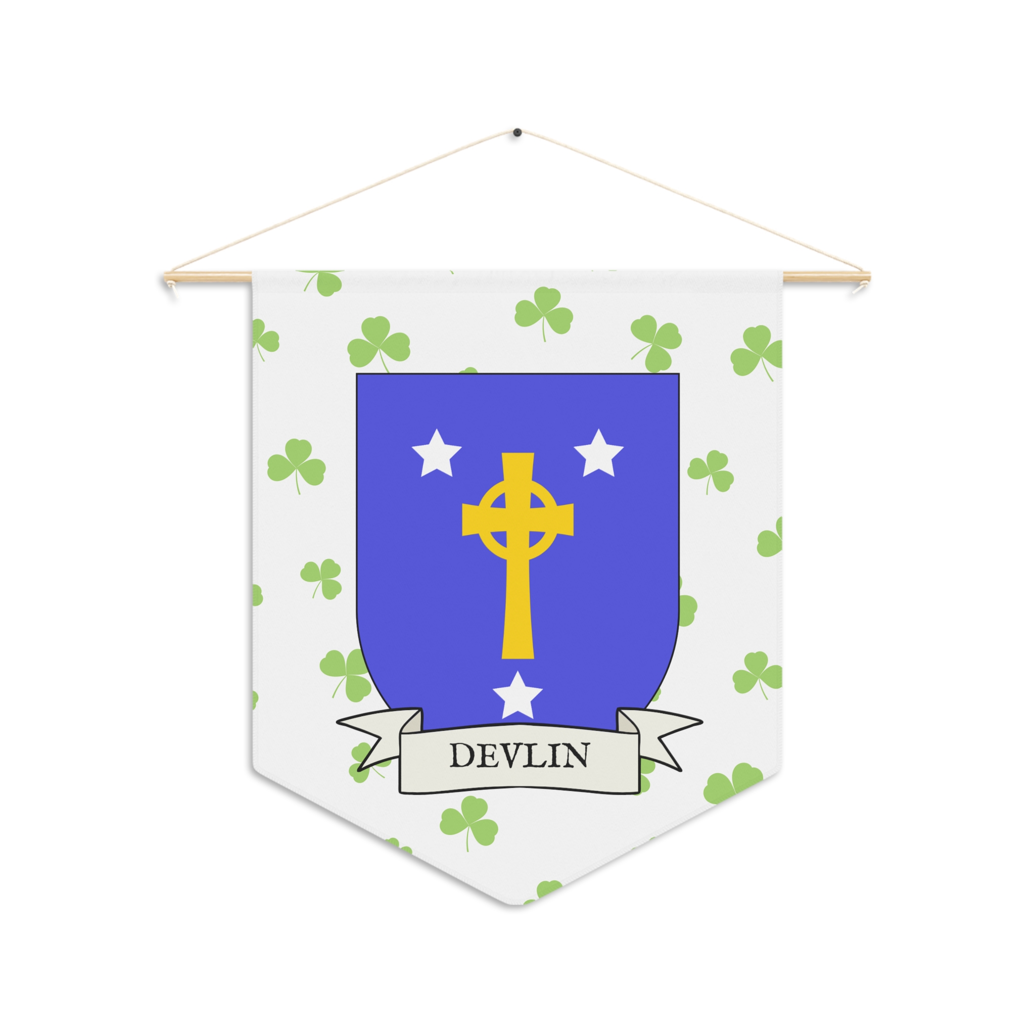 Uplift any room and show off your Irish American roots with this Devlin Family Coat of Arms Indoor Pennant. Pennant is printed on durable poly twill and comes with a wooden dowel/twine frame for easy hanging. Features your family Coat of Arms printed over a restrained shamrock patterned background.