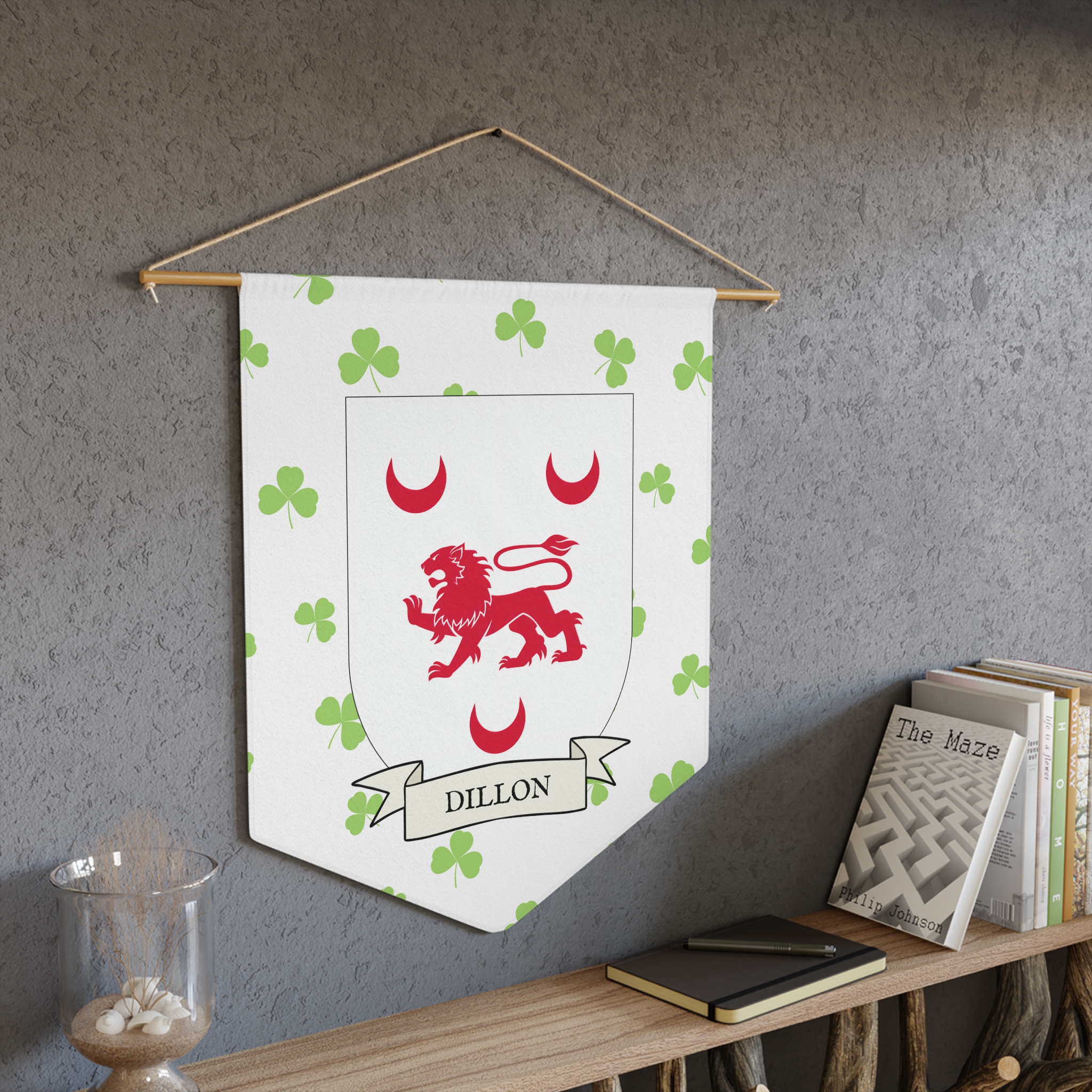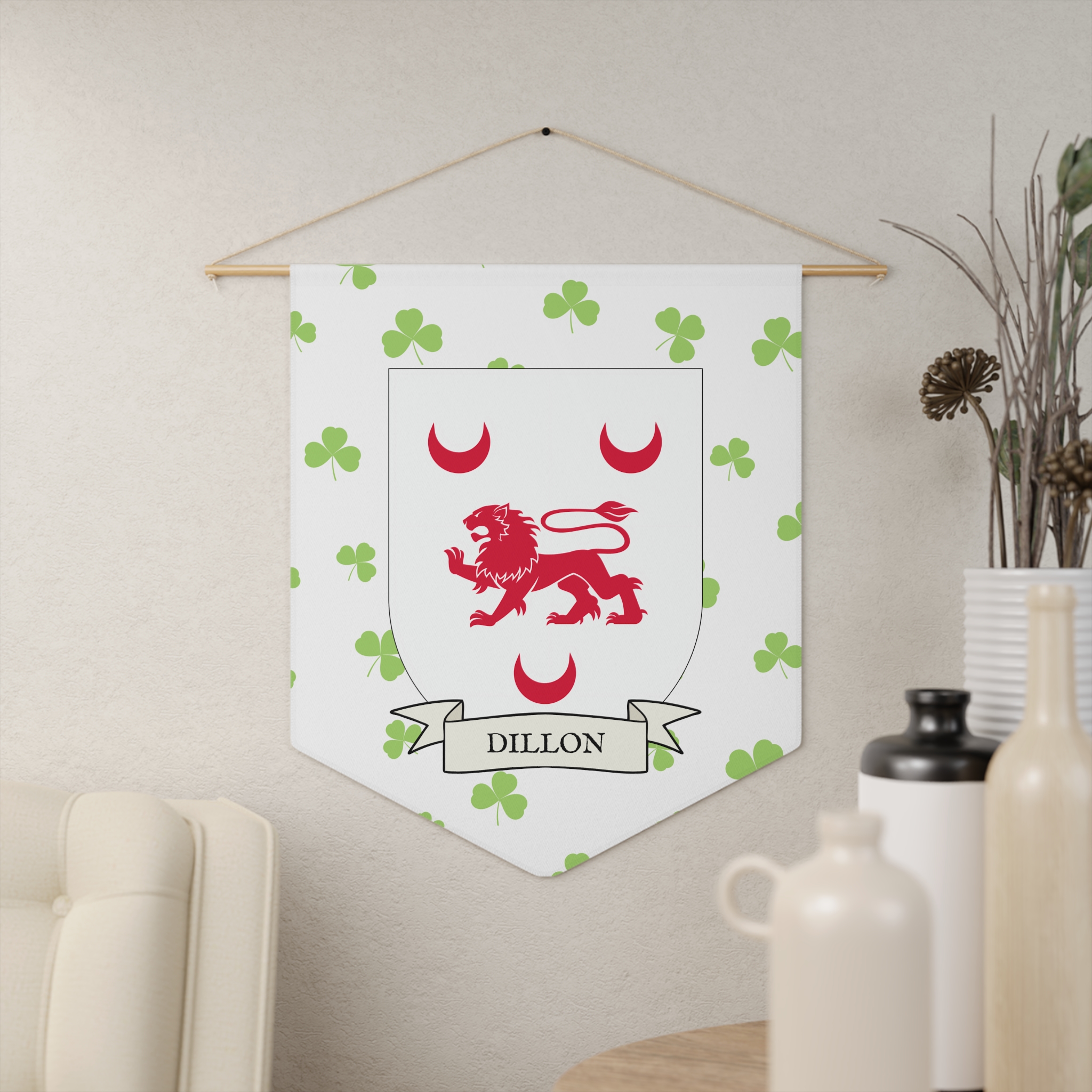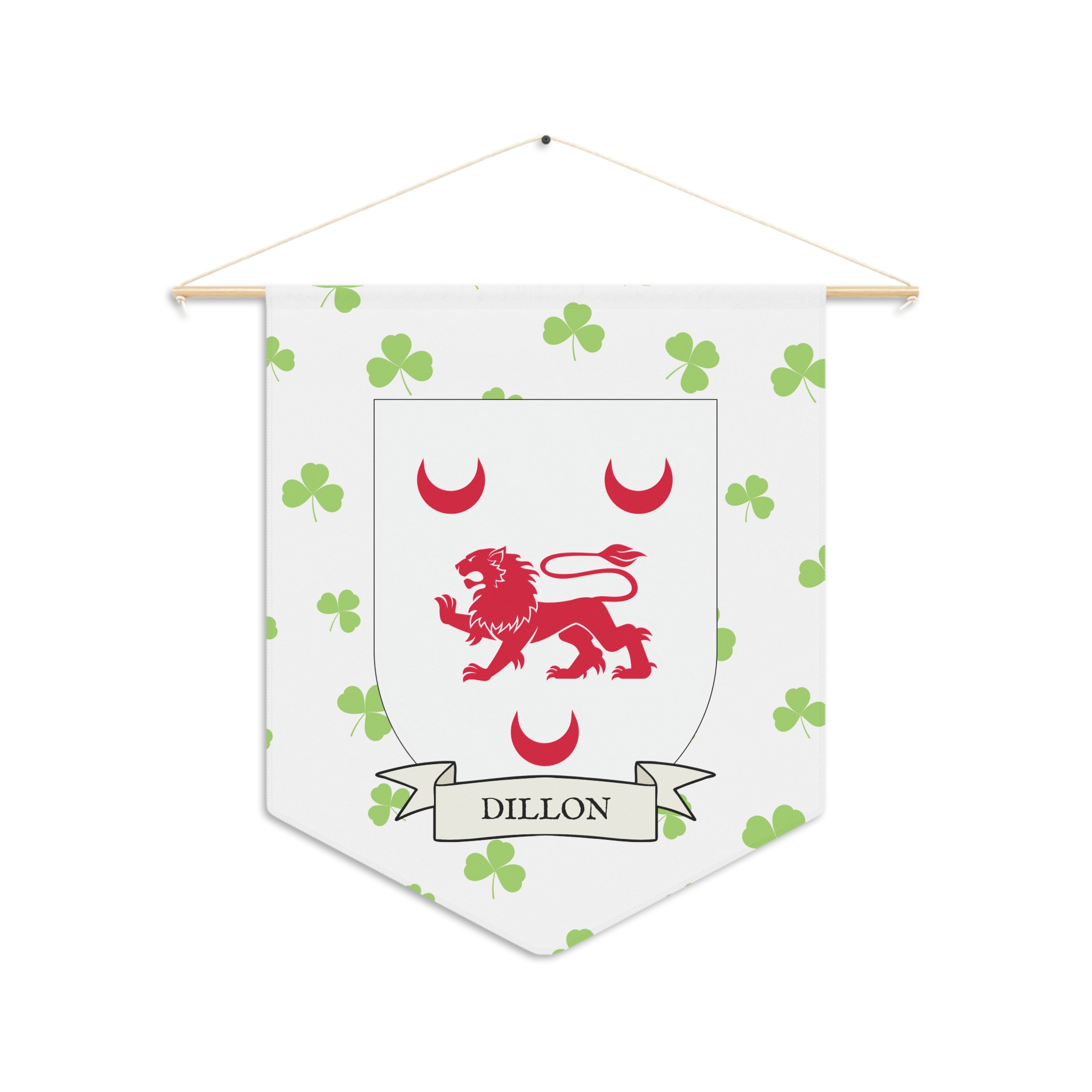 Uplift any room and show off your Irish American roots with this Dillon Family Coat of Arms Indoor Pennant. Pennant is printed on durable poly twill and comes with a wooden dowel/twine frame for easy hanging. Features your family’s Coat of Arms printed over a restrained shamrock patterned background.