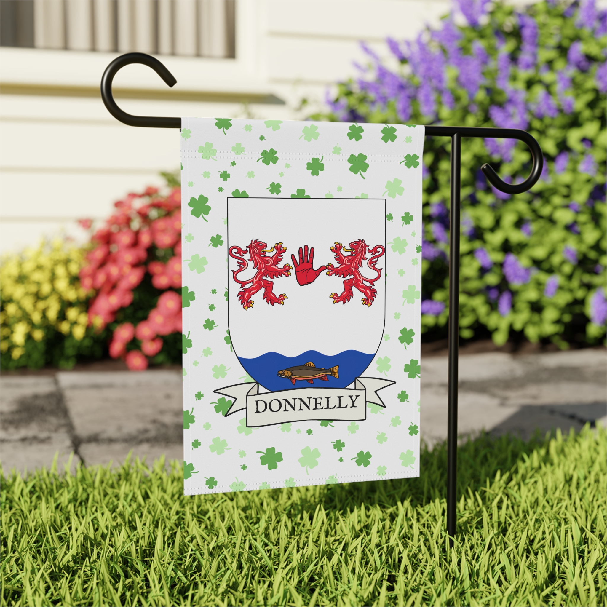 This welcoming Garden Banner will be a great addition to your garden or yard. It displays the Donnelly Family Coat of Arms over a subtle background showing a field of four-leaf shamrocks. Both sides show identical images.