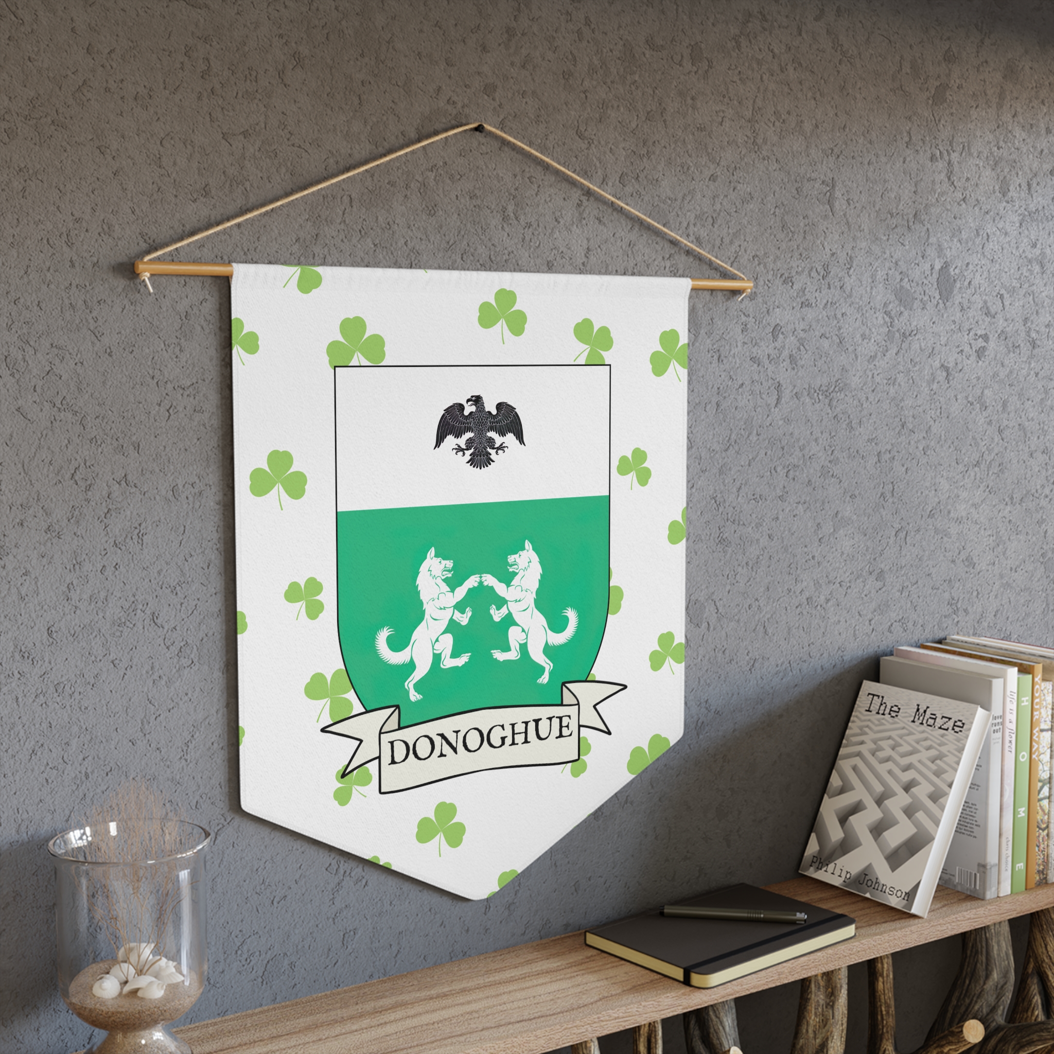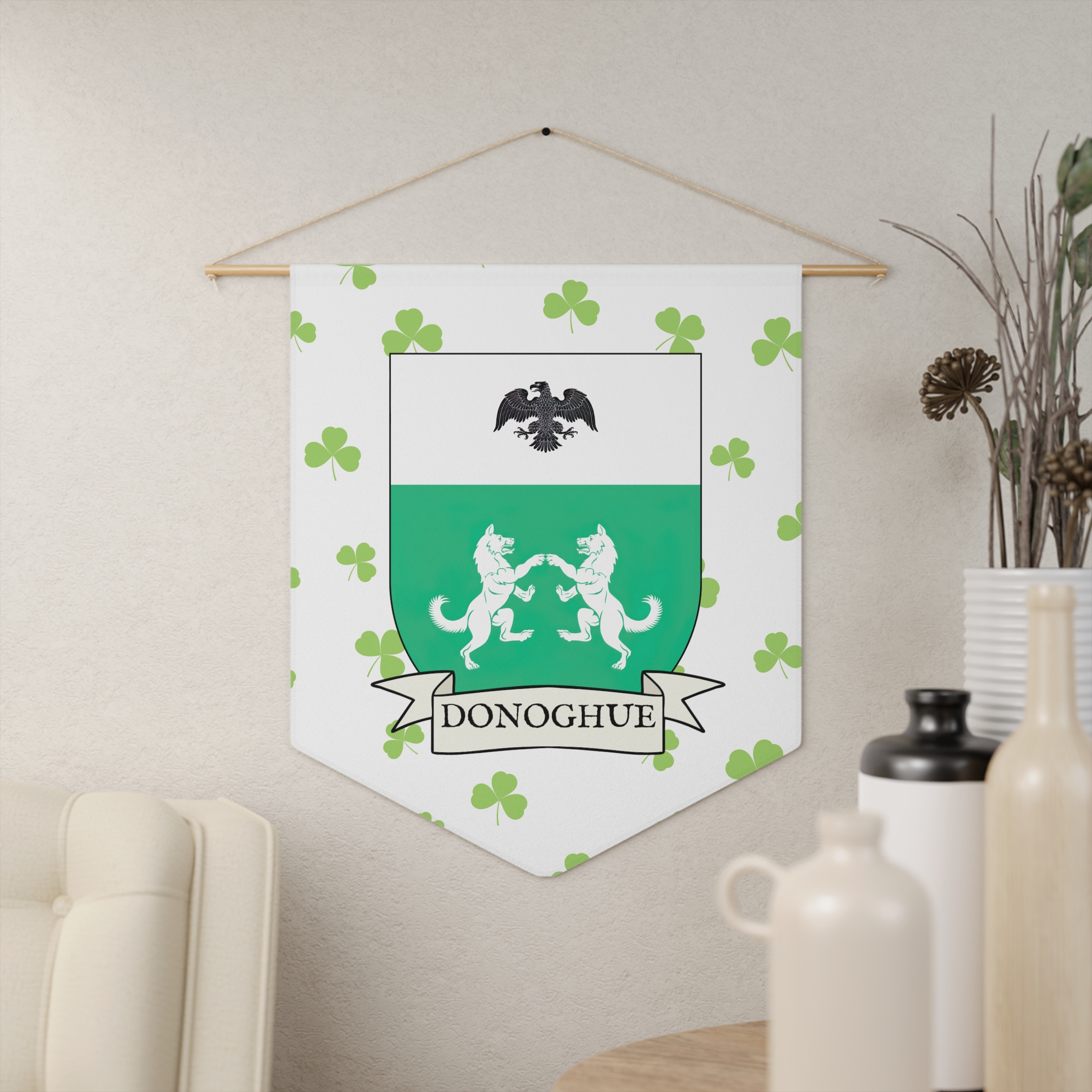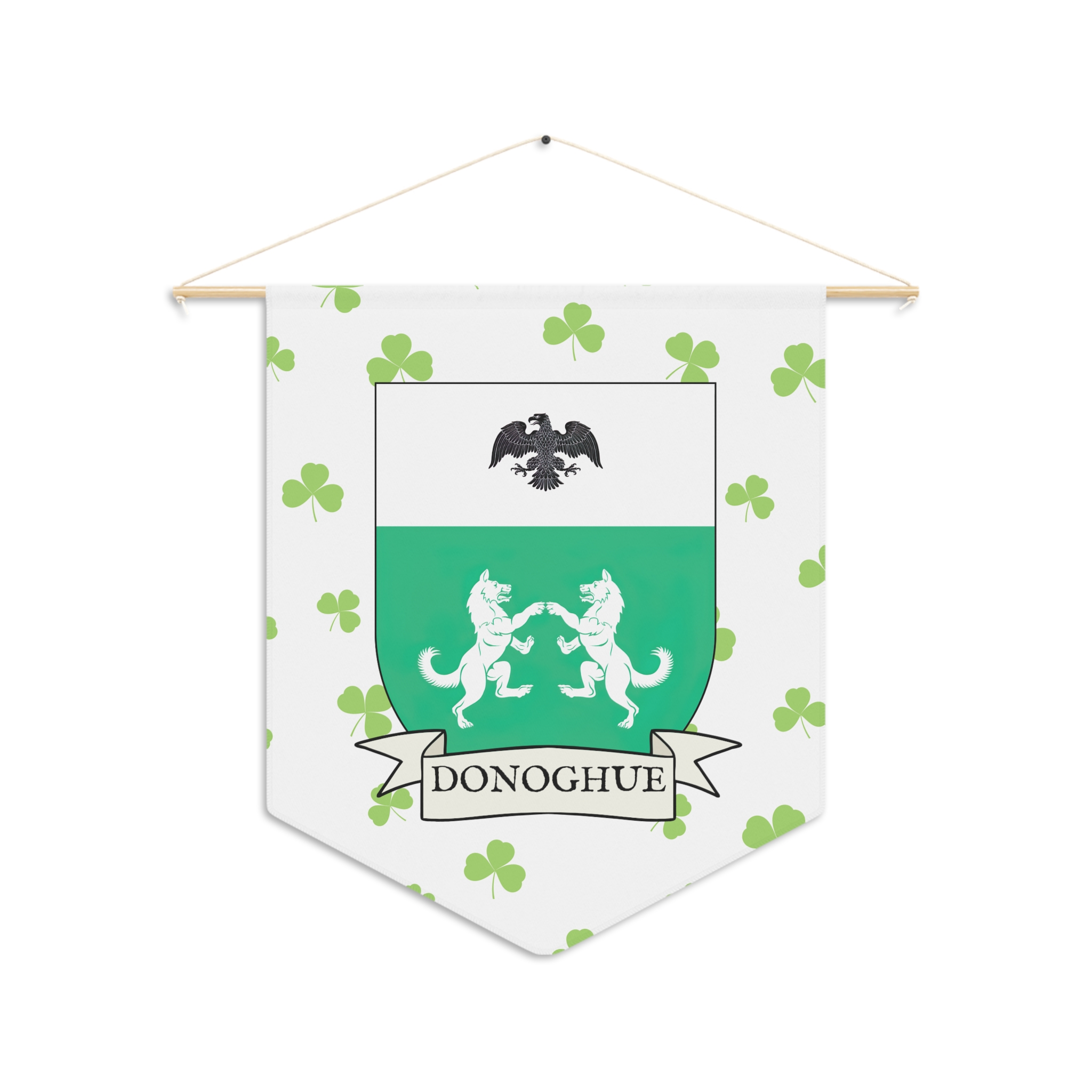 Uplift any room and show off your Irish American roots with this Donoghue Family Coat of Arms Indoor Pennant. Pennant is printed on durable poly twill and comes with a wooden dowel/twine frame for easy hanging. Features your family’s Coat of Arms printed over a restrained shamrock patterned background.