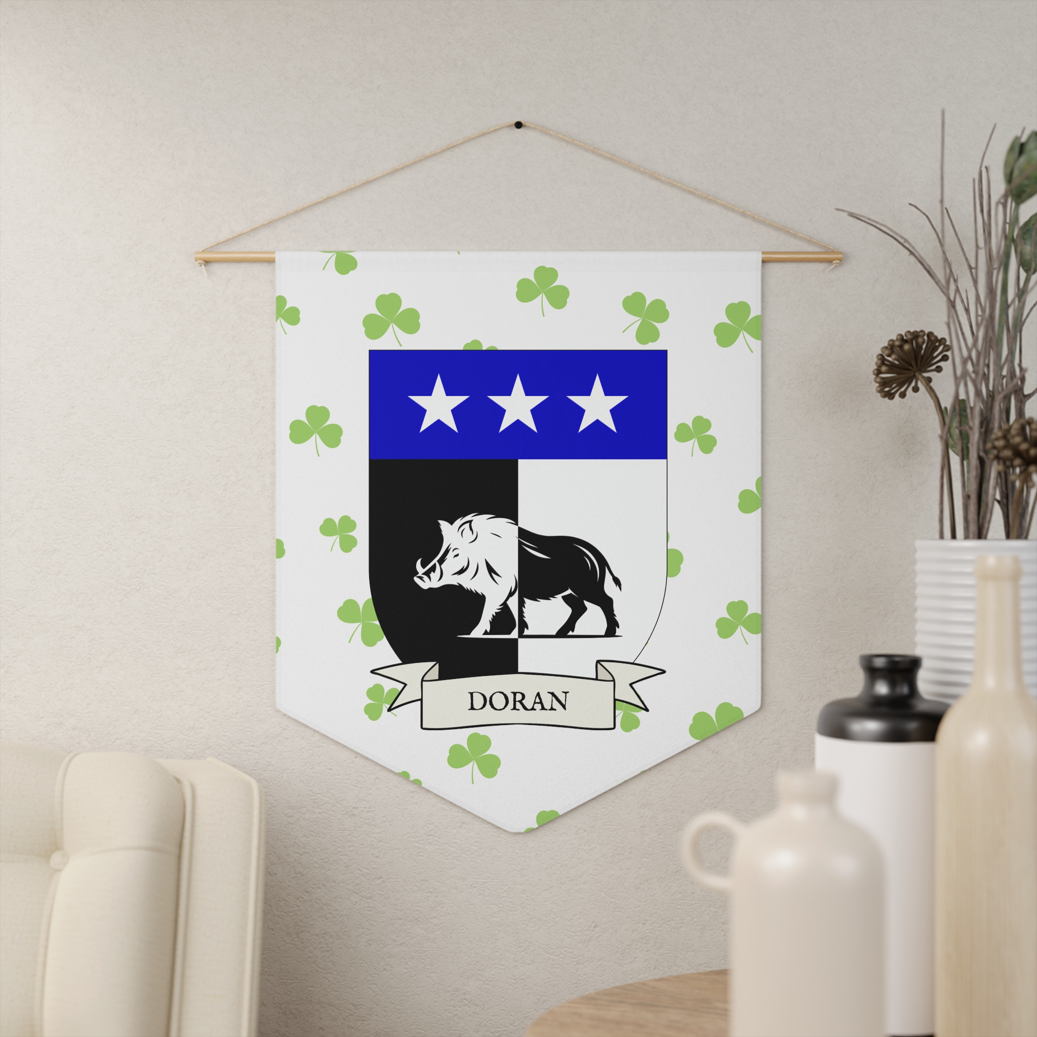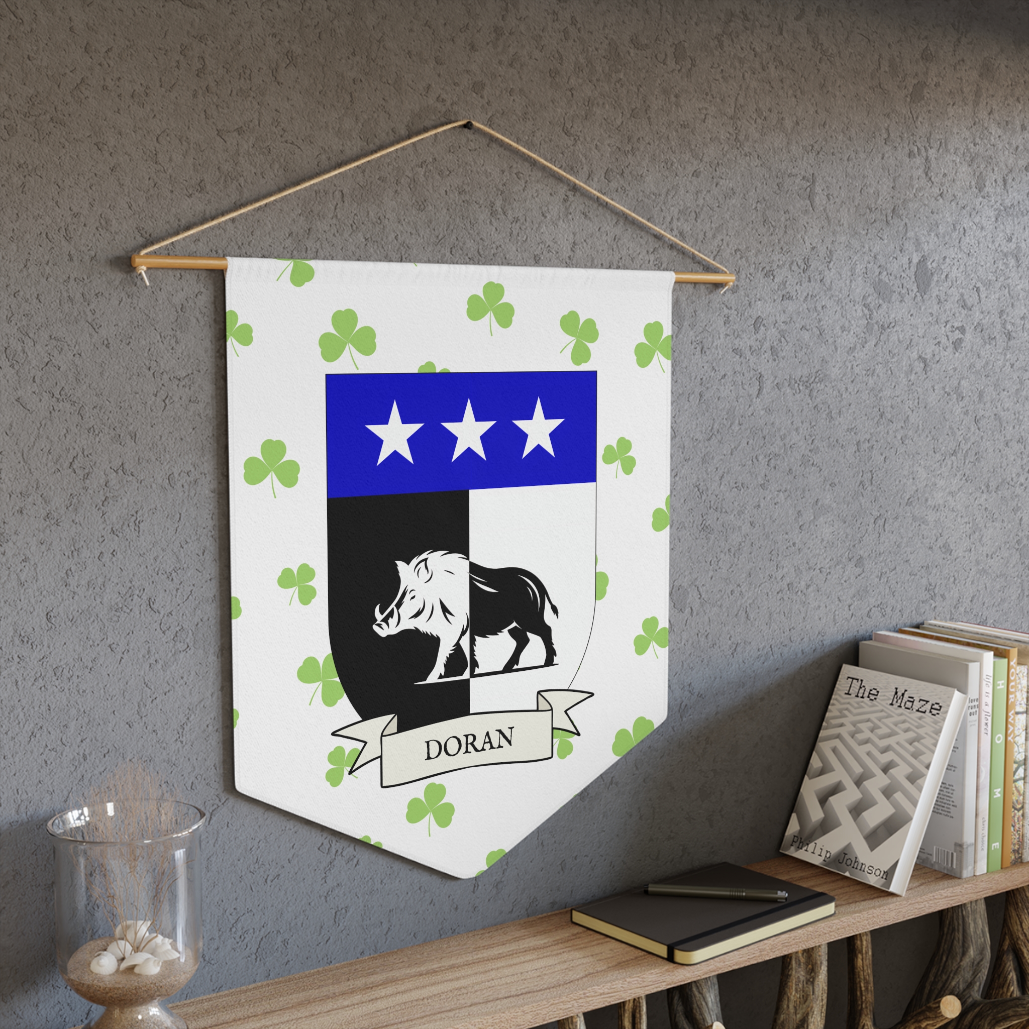 Uplift any room and show off your Irish American roots with this Doran Family Coat of Arms Indoor Pennant. Pennant is printed on durable poly twill and comes with a wooden dowel/twine frame for easy hanging. Features your family’s Coat of Arms printed over a restrained shamrock patterned background.